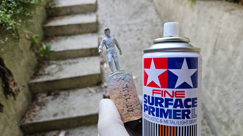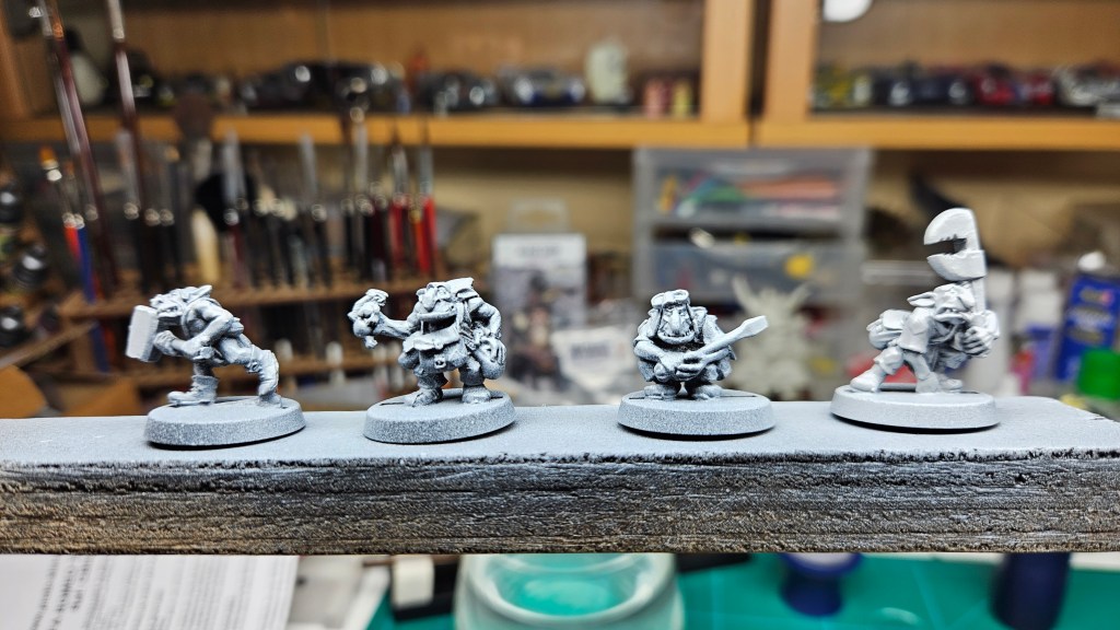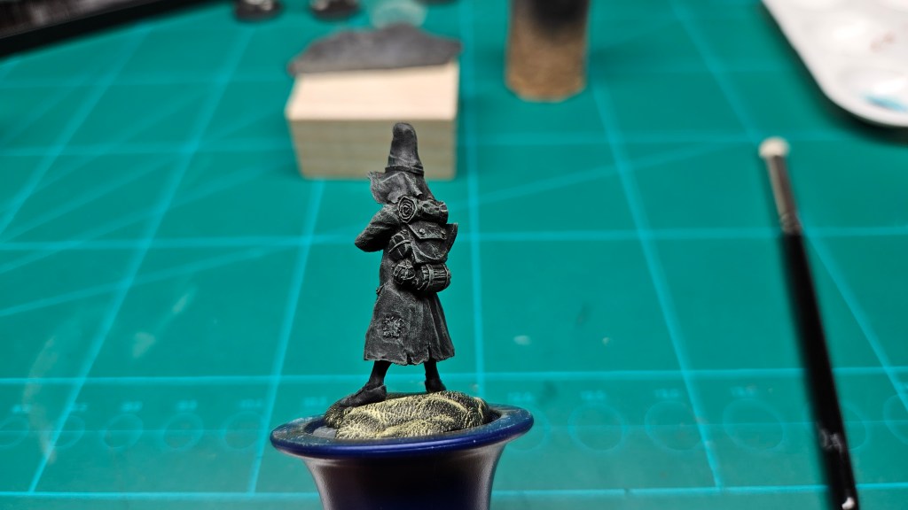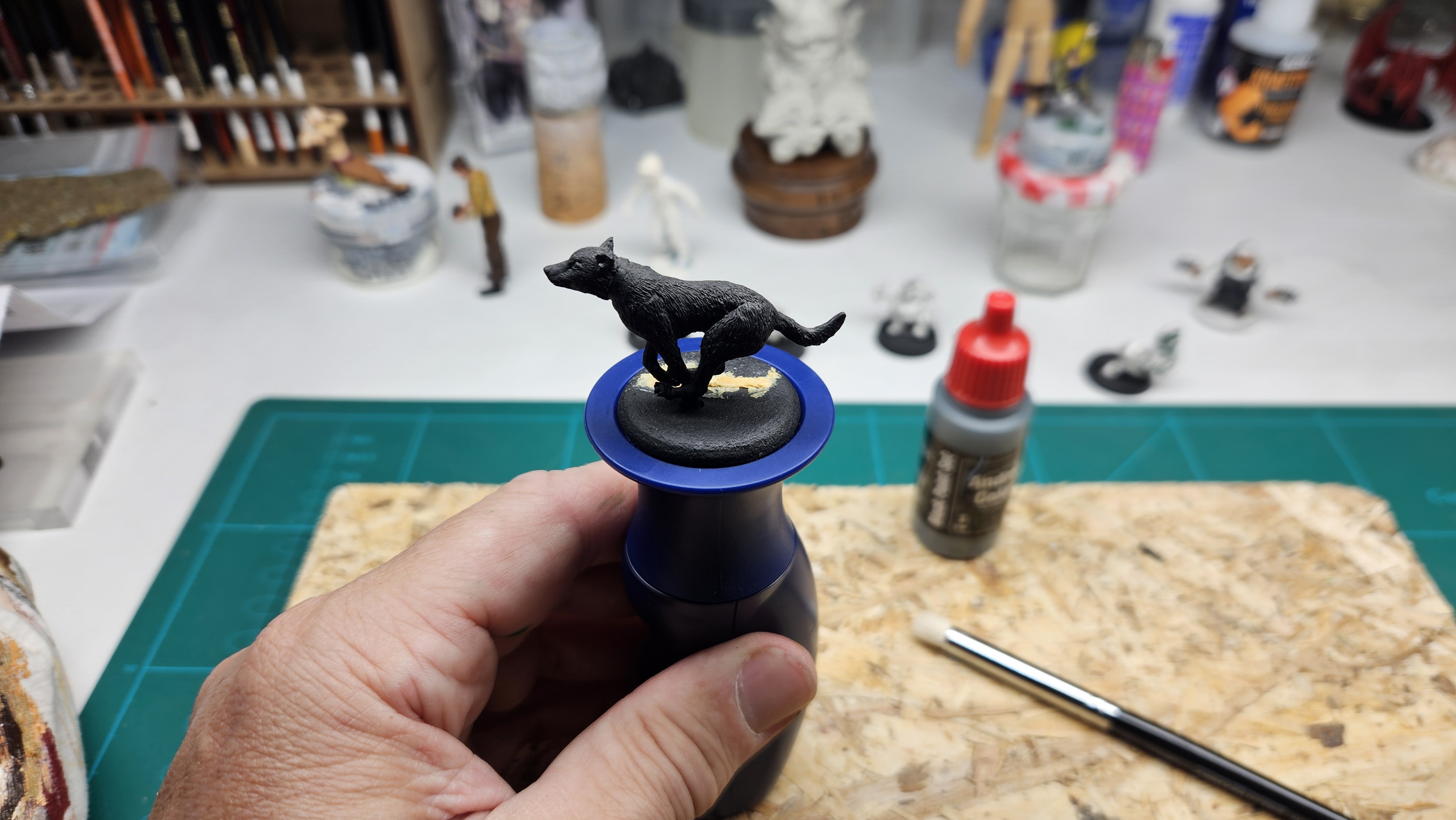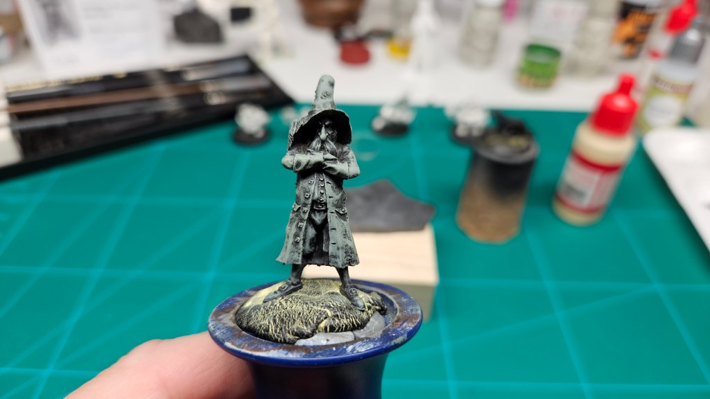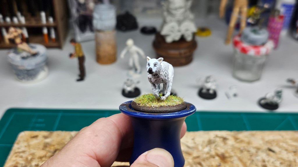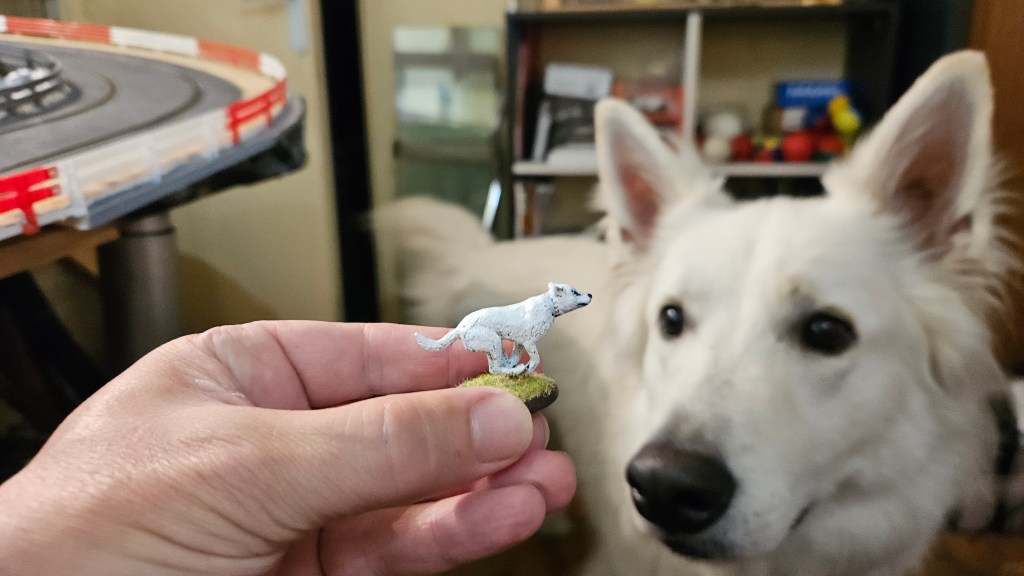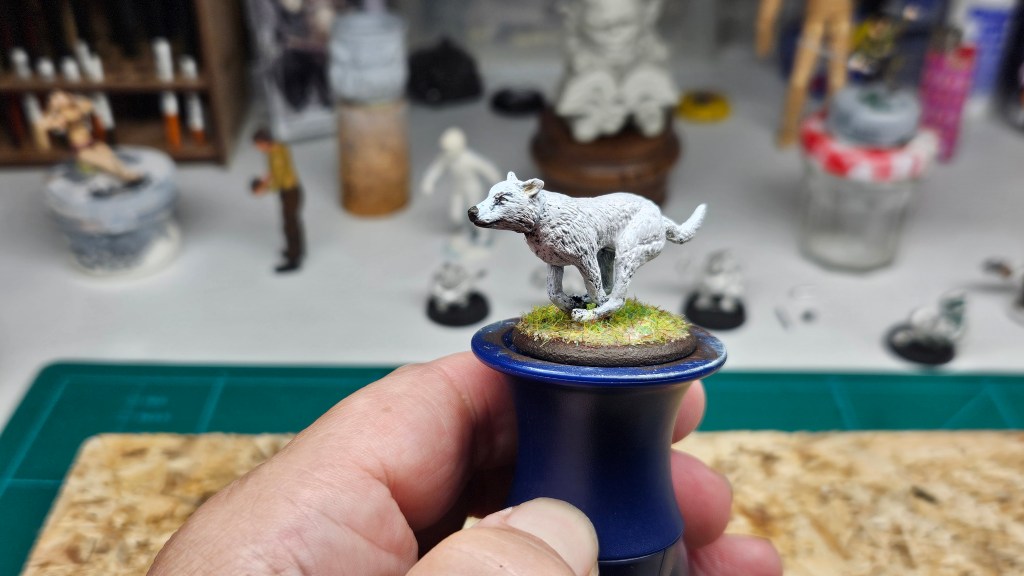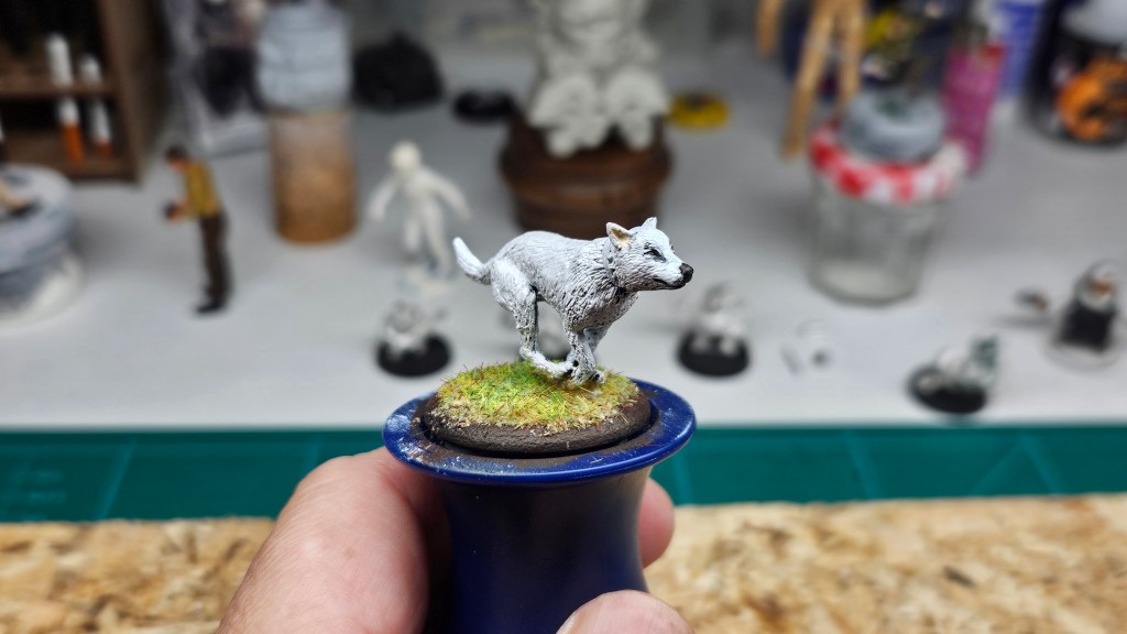 Parmi les figurines qui attendent d’être peinte depuis… 10 ans (oui, le temps passe, bien trop vite !) : ce chien, déjà sous-couché.