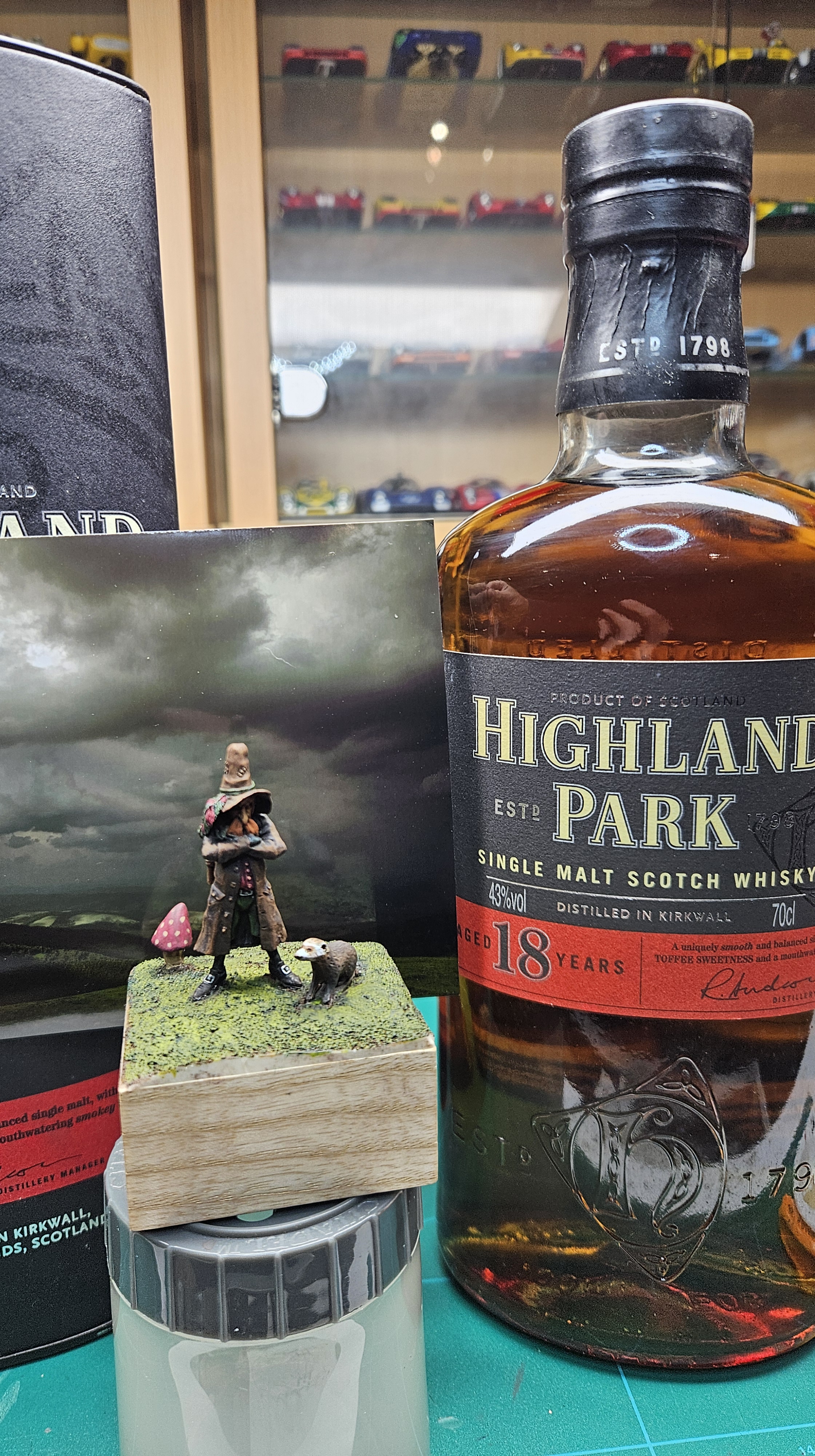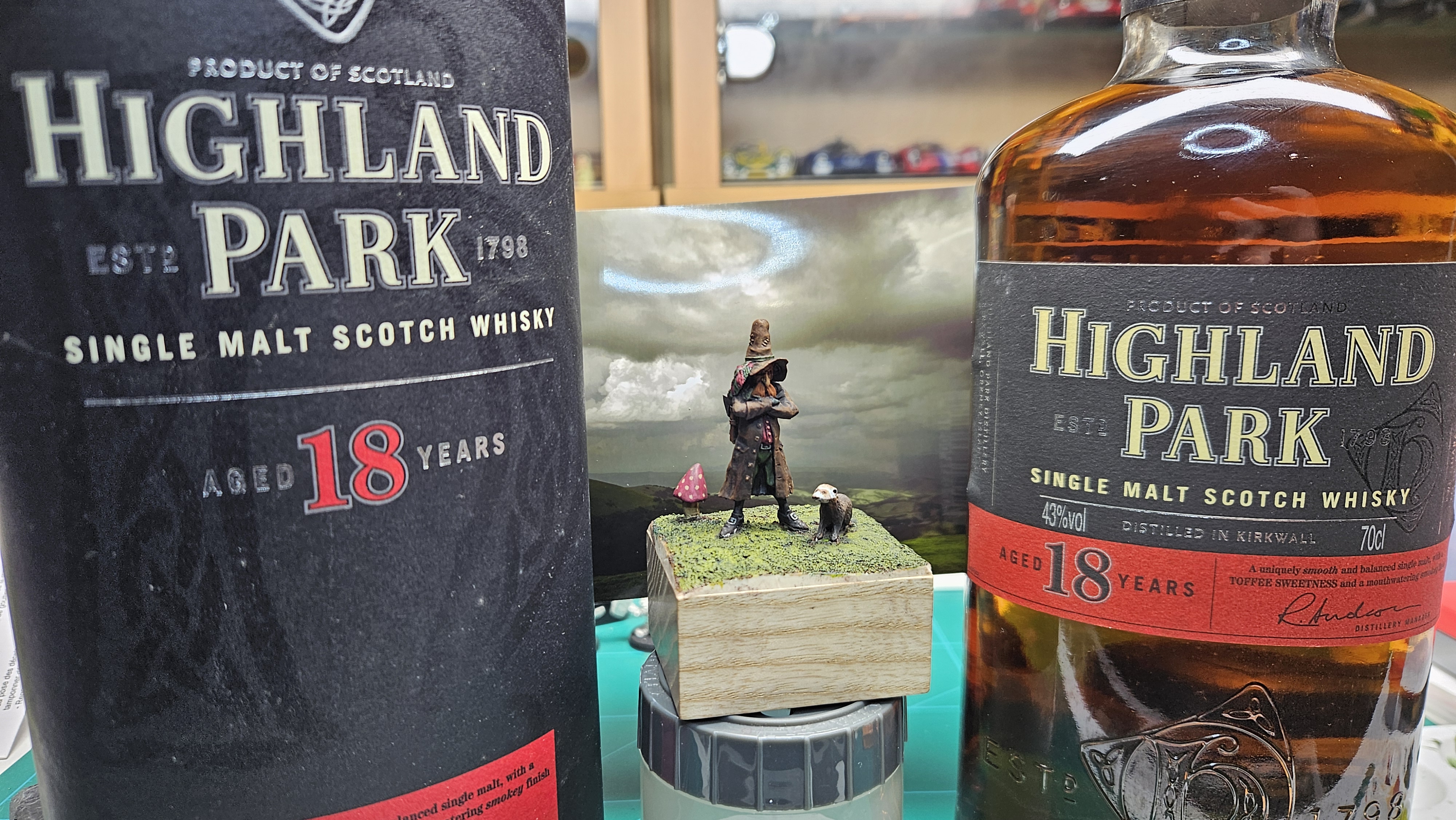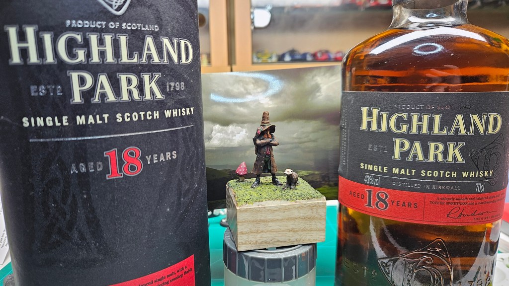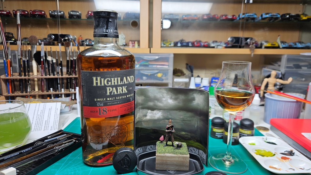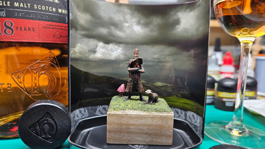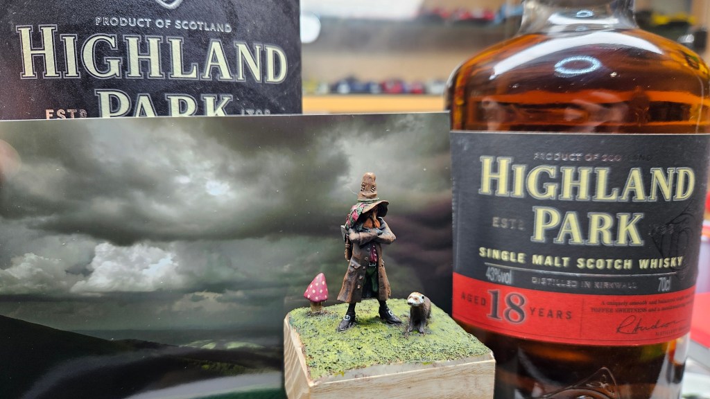 J’ai mis le personnage en situation sur fond de paysage écossais… et installé sur un socle bricolé à partir de l’étui d’une (très bonne) bouteille de Highland 18 ans !