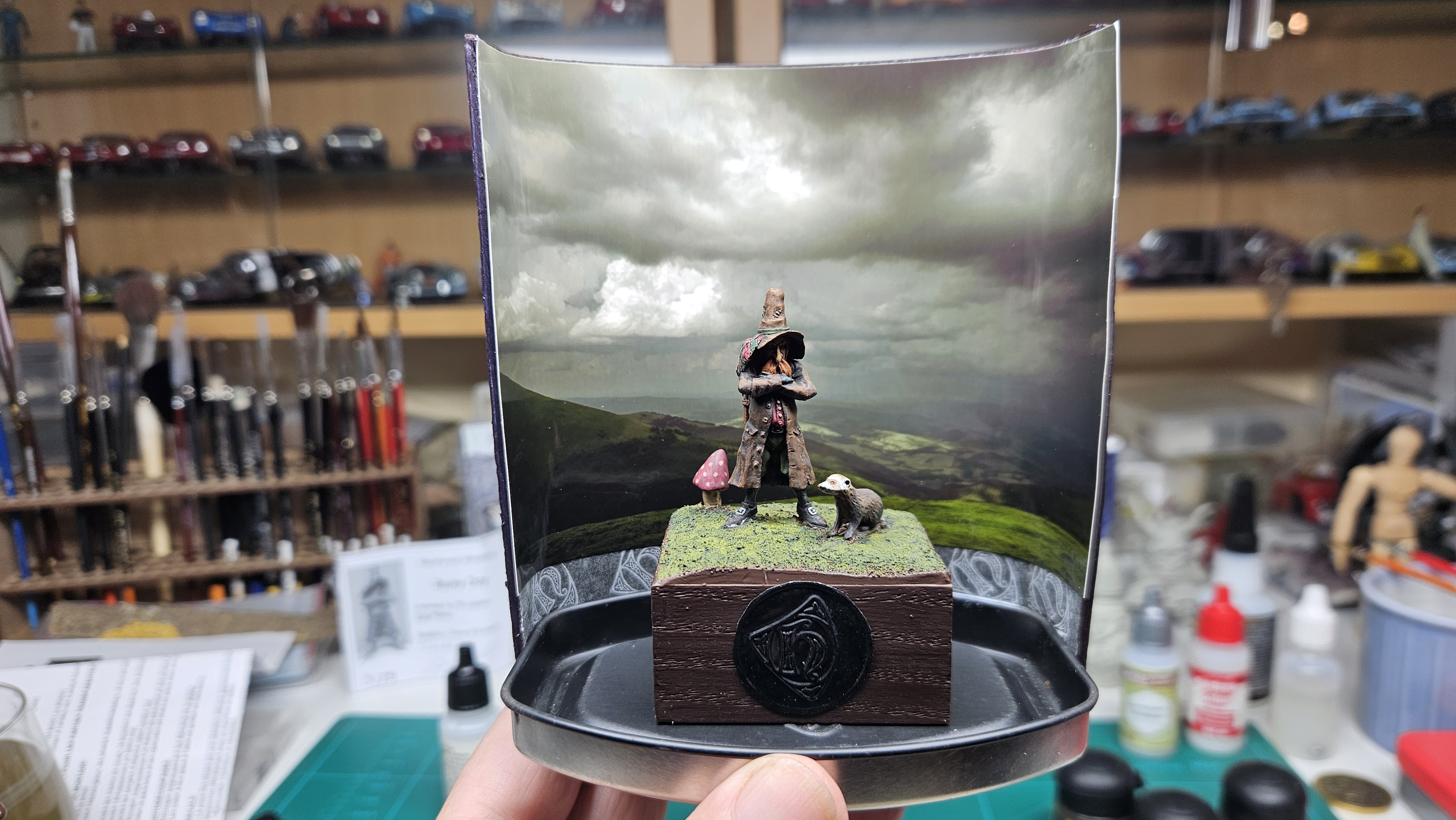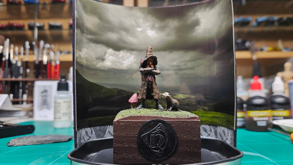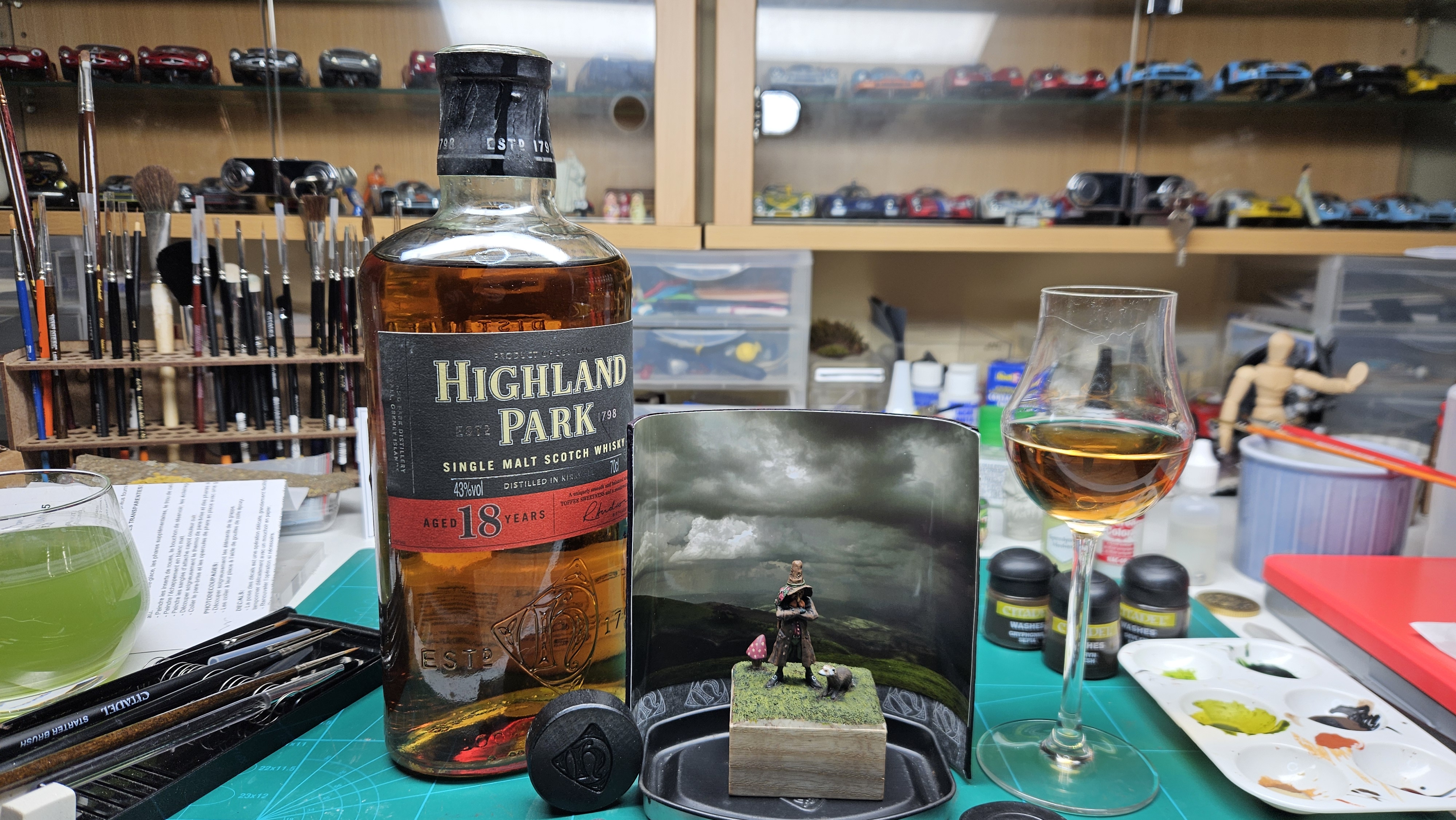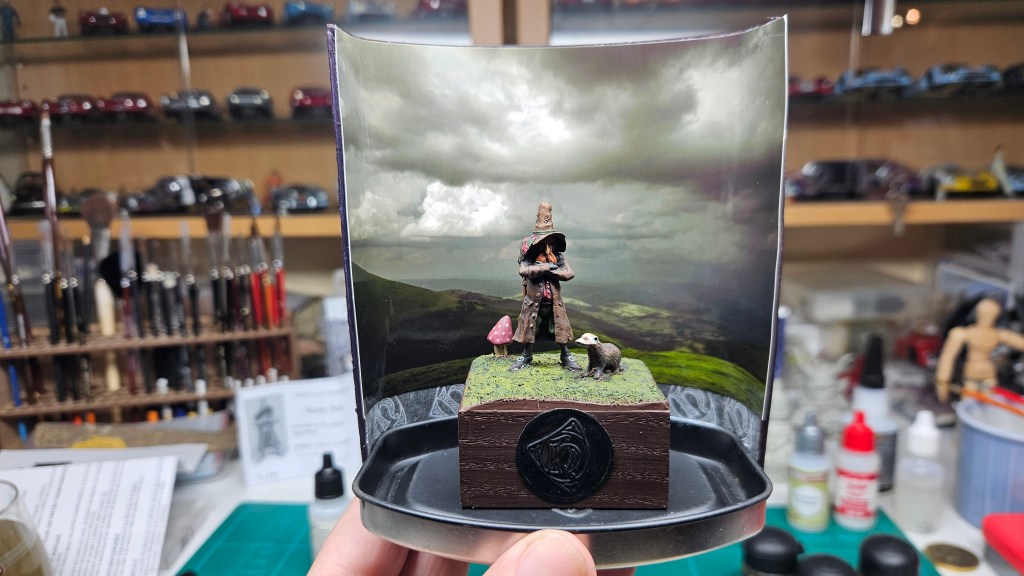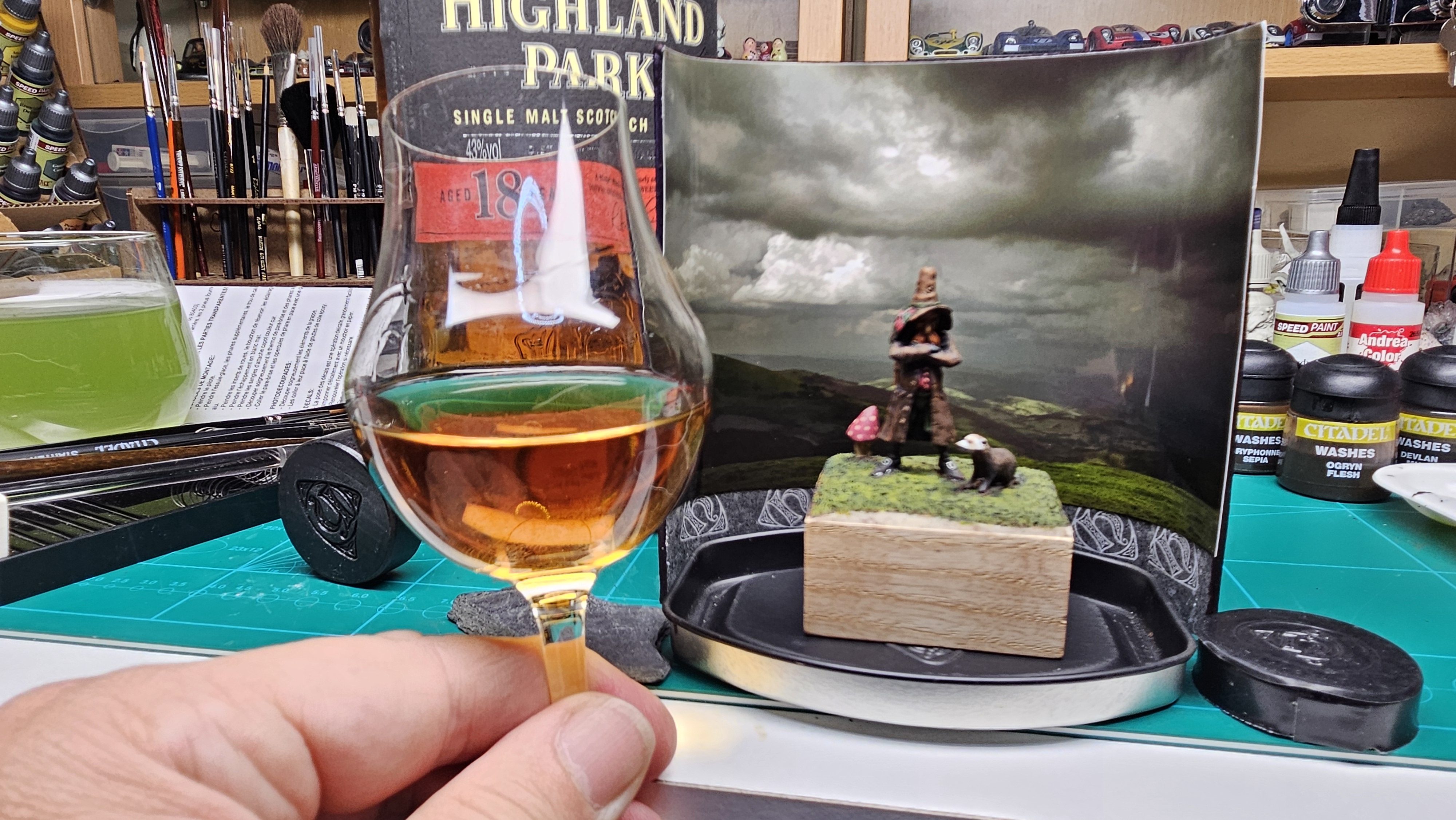J’ai mis le personnage en situation sur fond de paysage écossais… et installé sur un socle bricolé à partir de l’étui d’une (très bonne) bouteille de Highland 18 ans !
