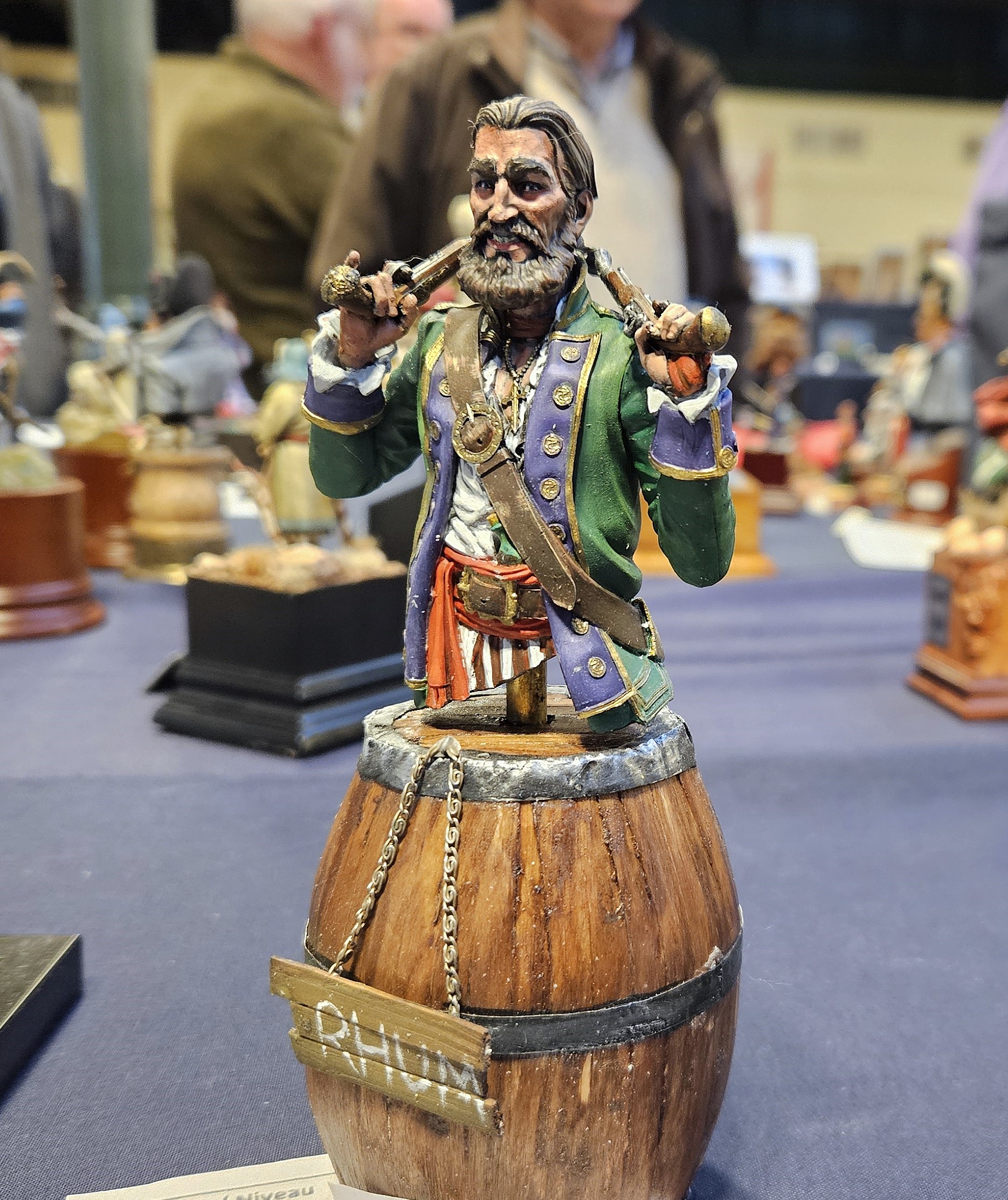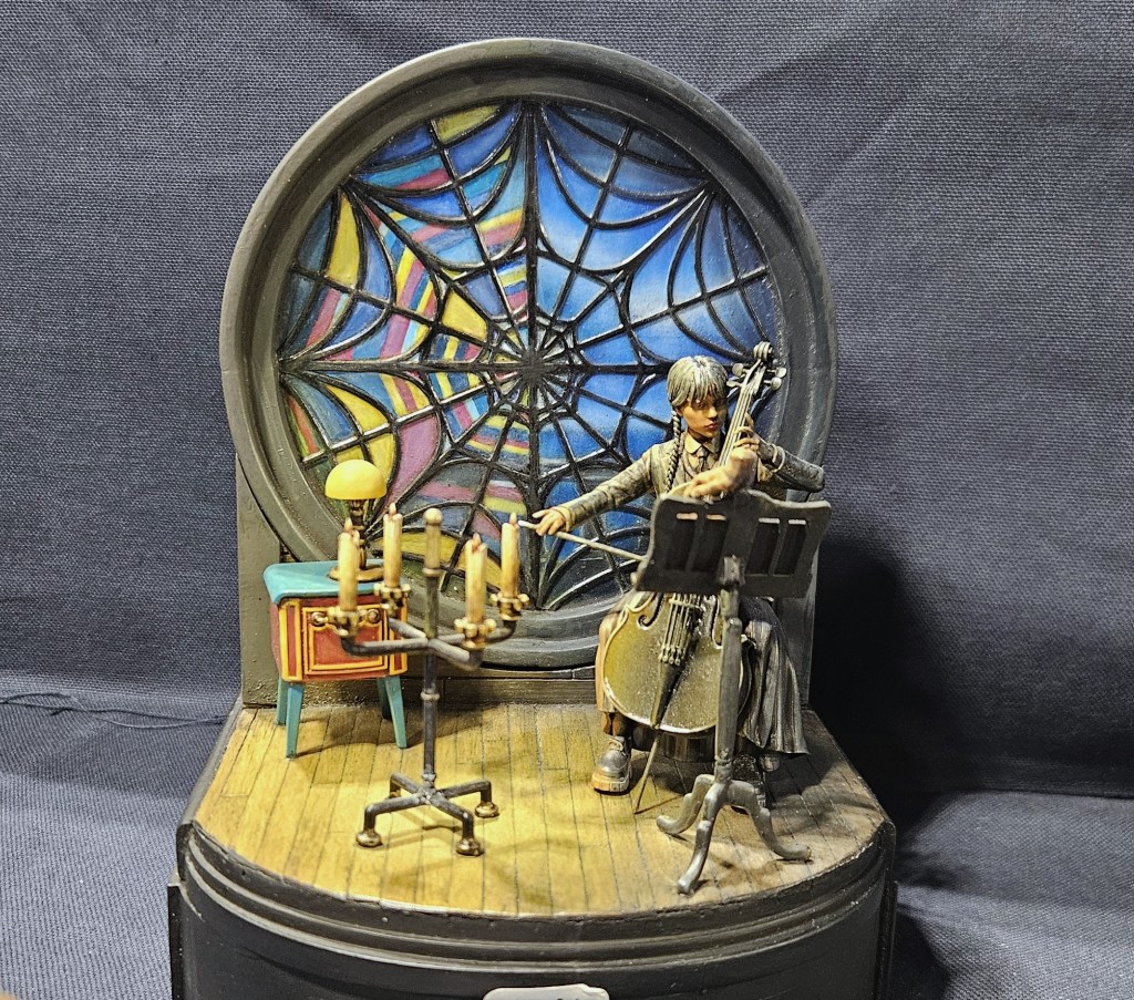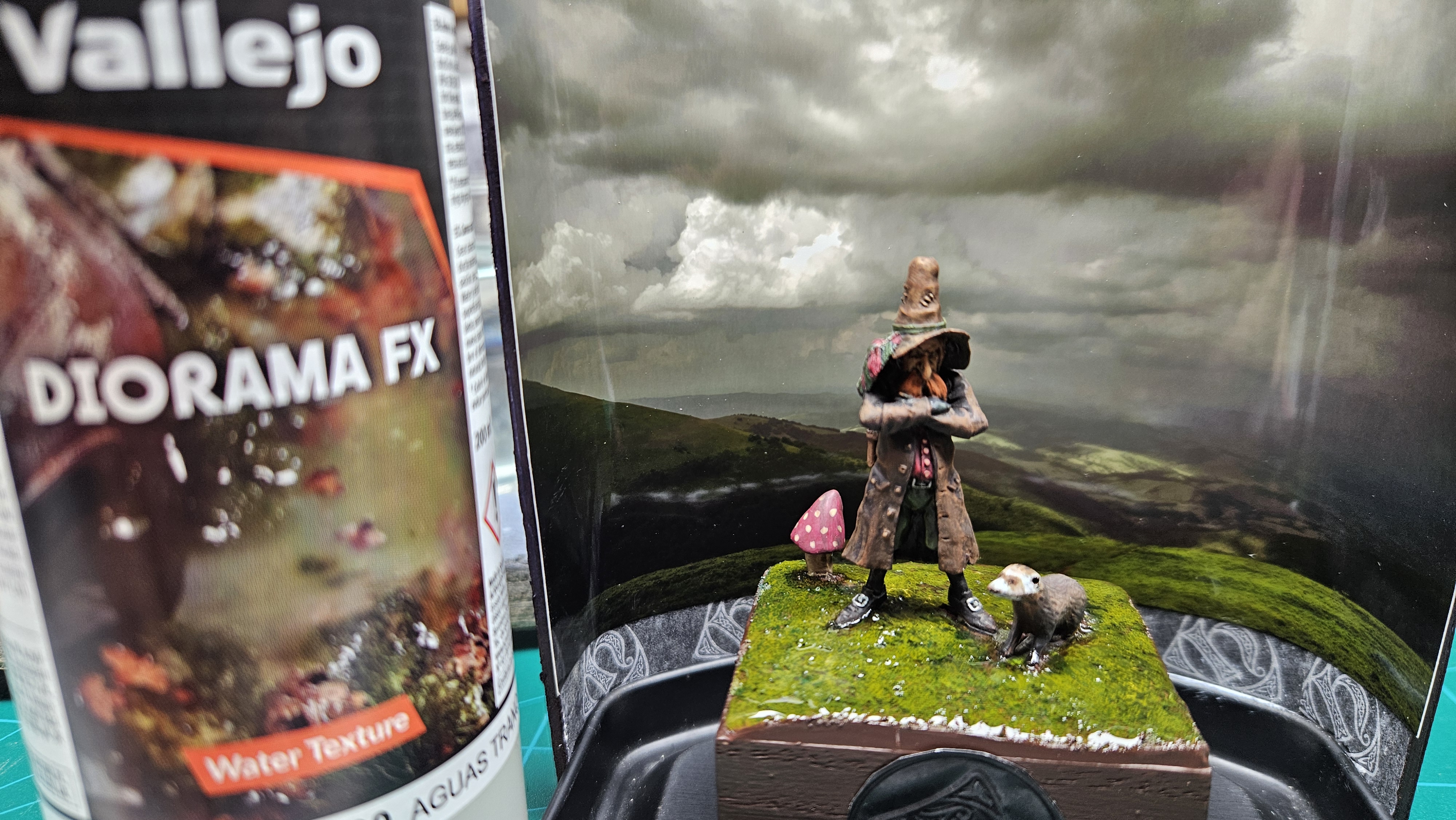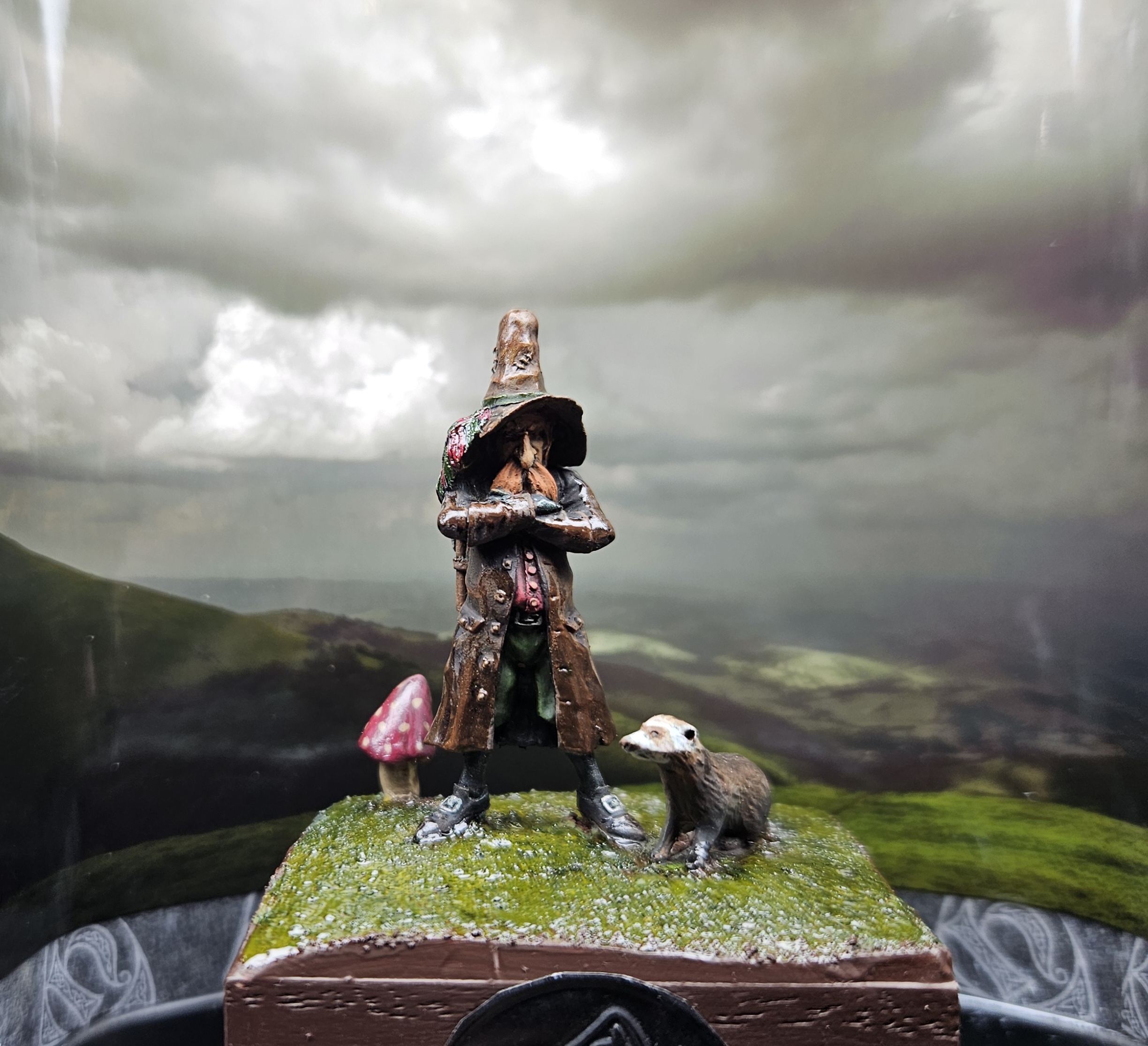 J’ai mis le personnage en situation sur fond de paysage écossais… et installé sur un socle bricolé à partir de l’étui d’une (très bonne) bouteille de Highland 18 ans !