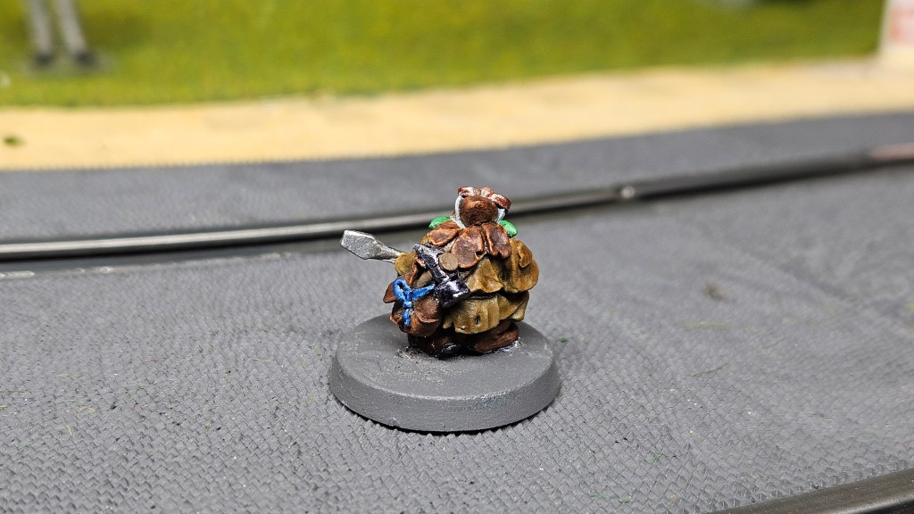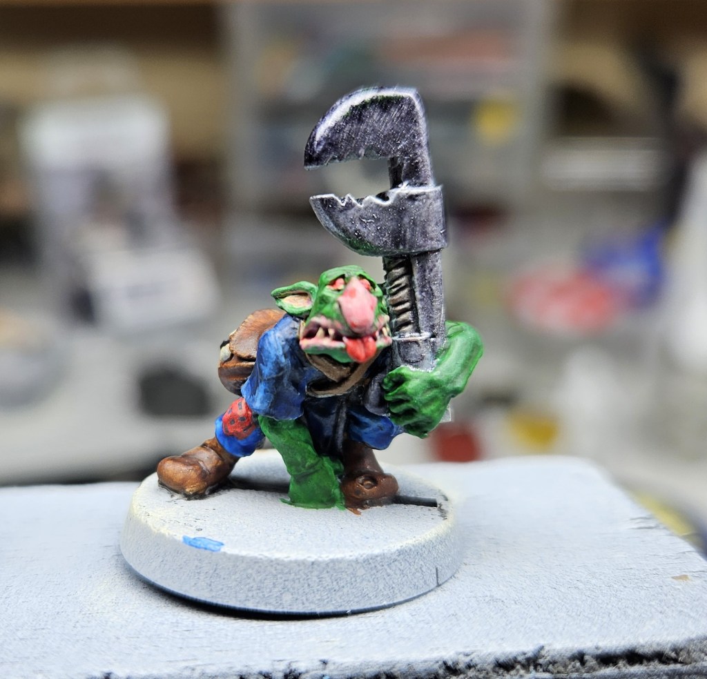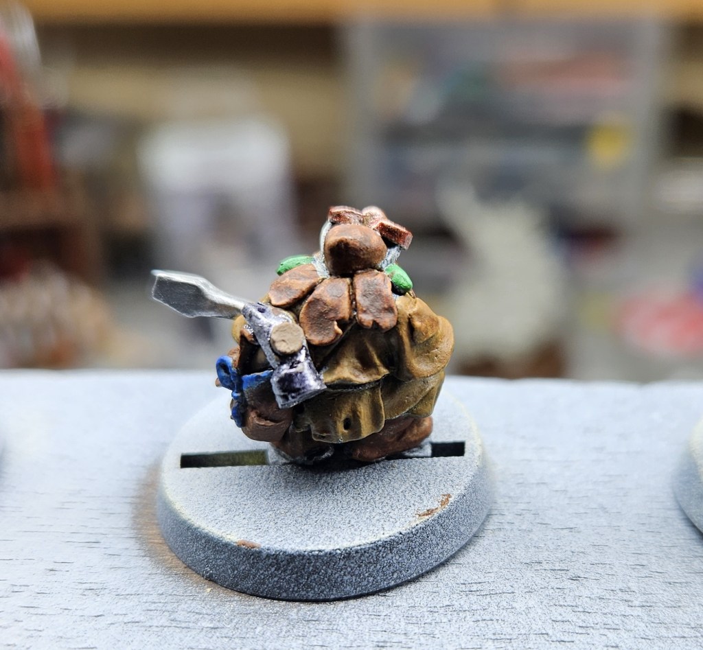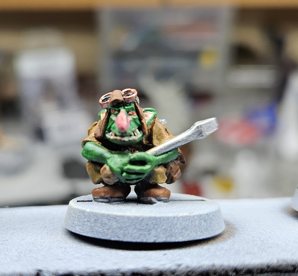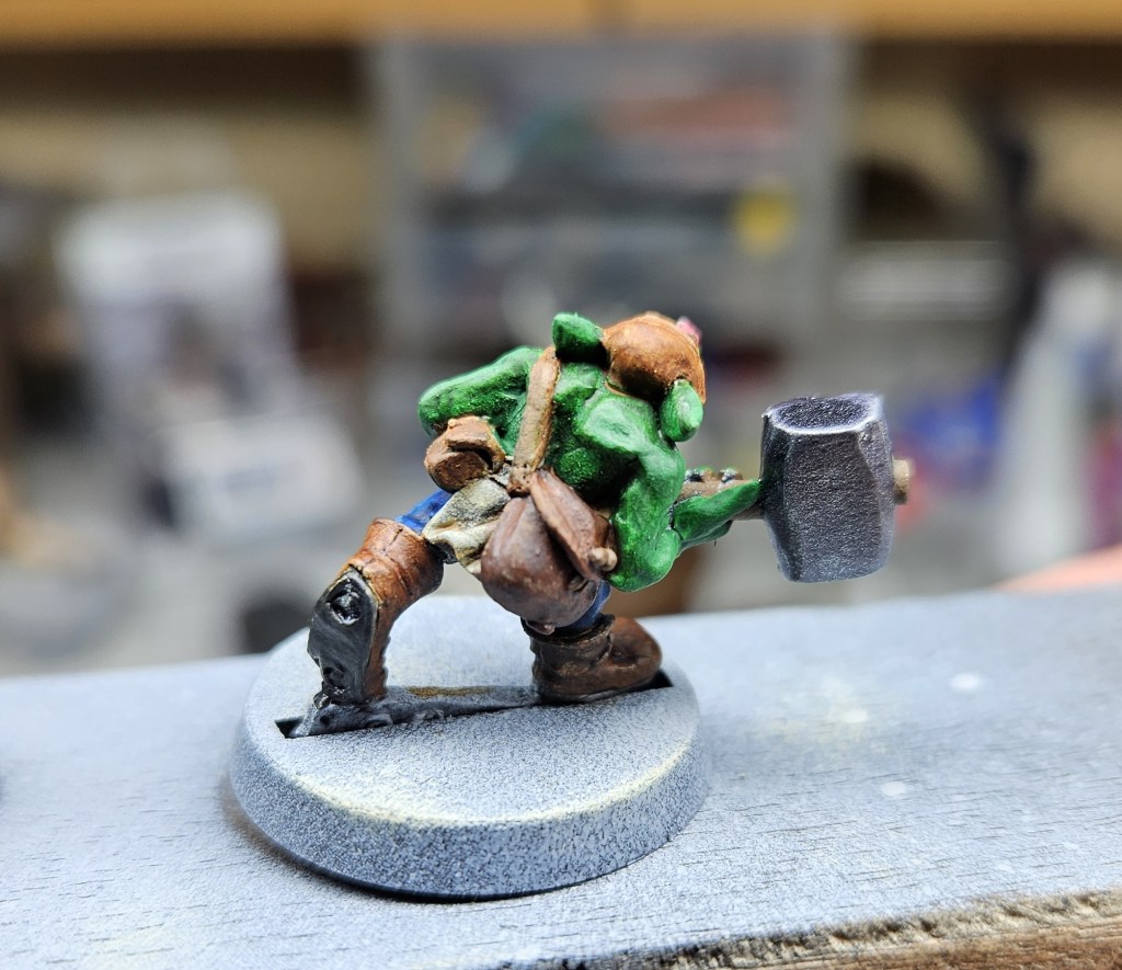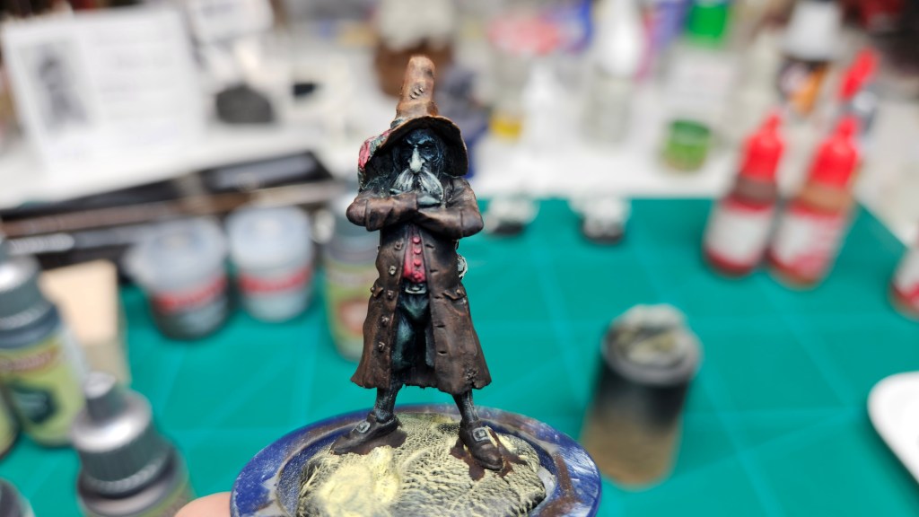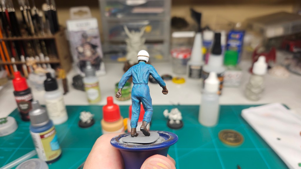 Et au mieux que j’ai réussi, après avoir tenté d’affiner mes glacis – en vain ! C’est facile quand on voit les vidéos Youtube, mais en vrai, c’est soit trop épais, soit ça fait de la flotte, et la peinture fait de la « craie » en séchant, c’est grumeleux. Ce que ça fait sur ma figurine…