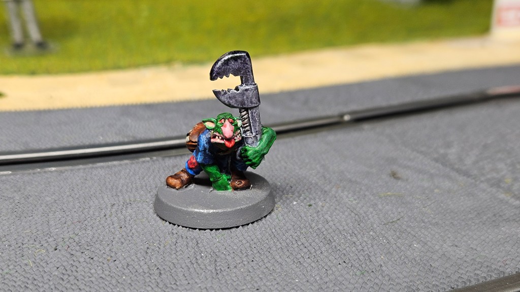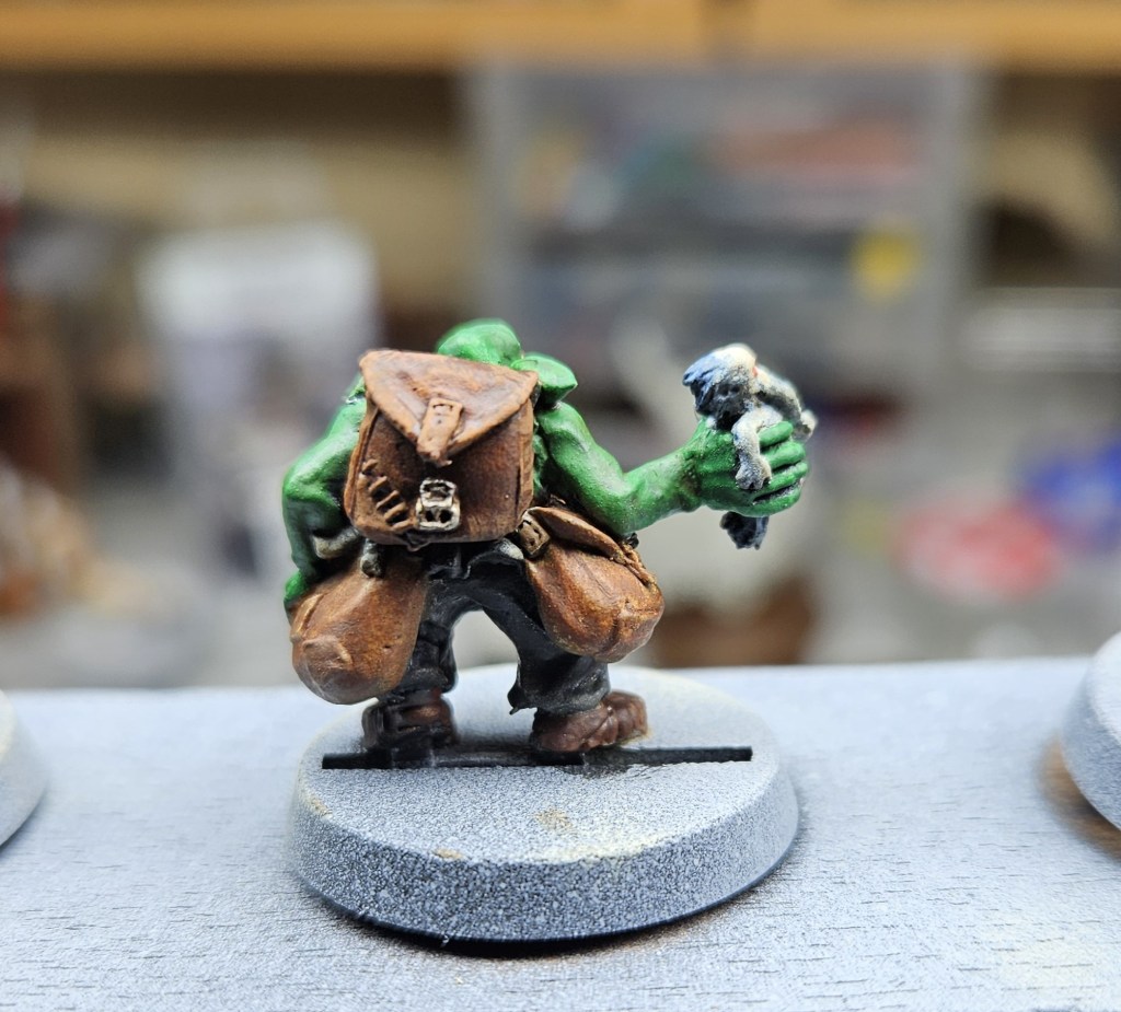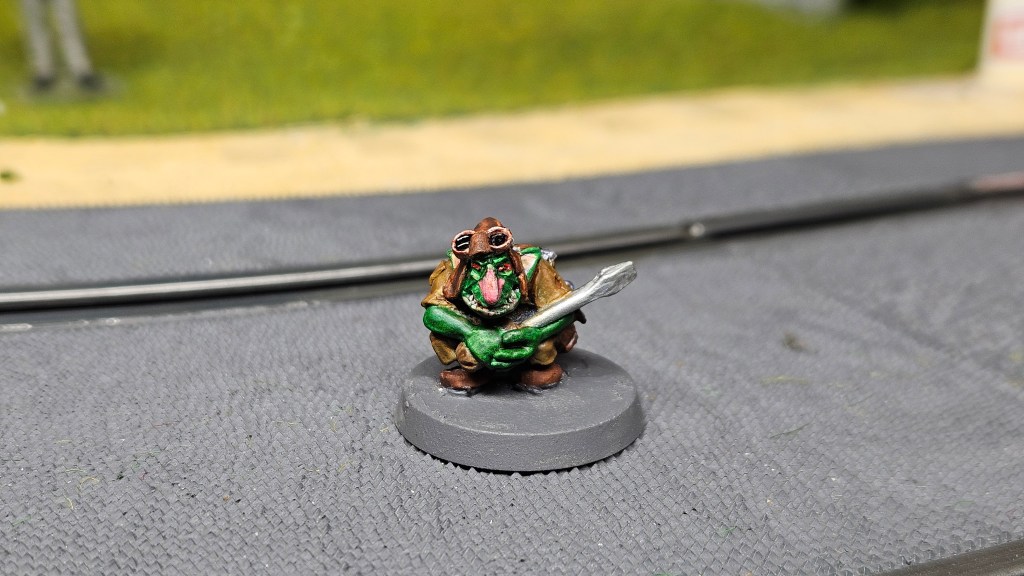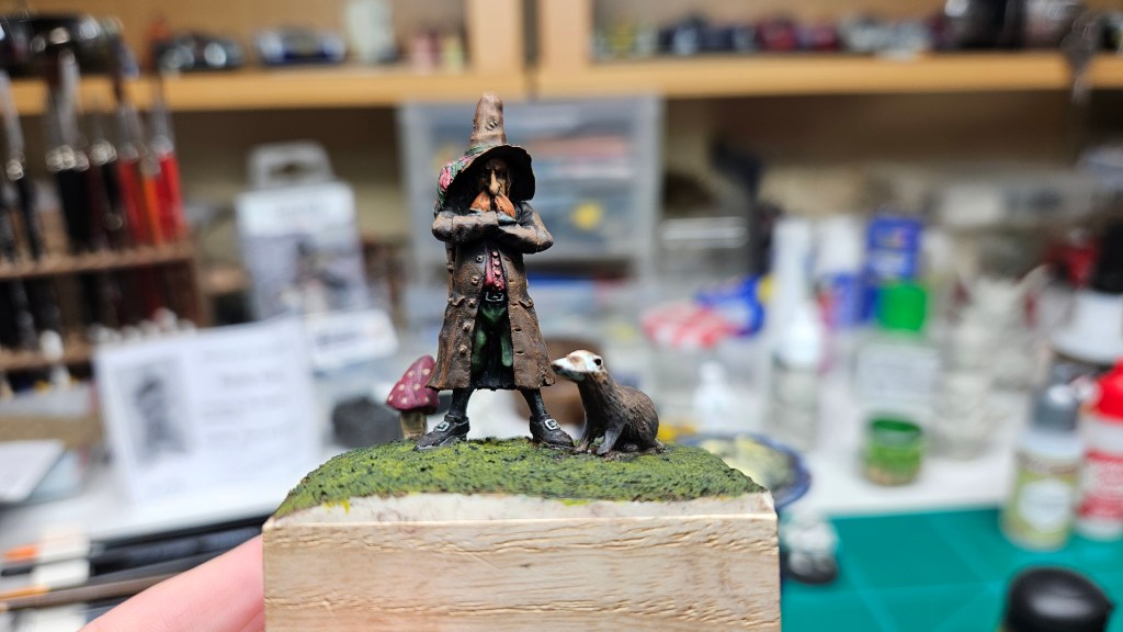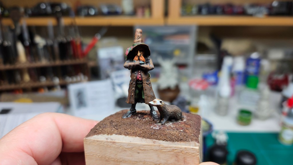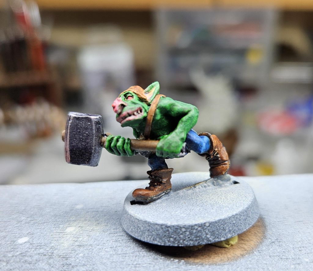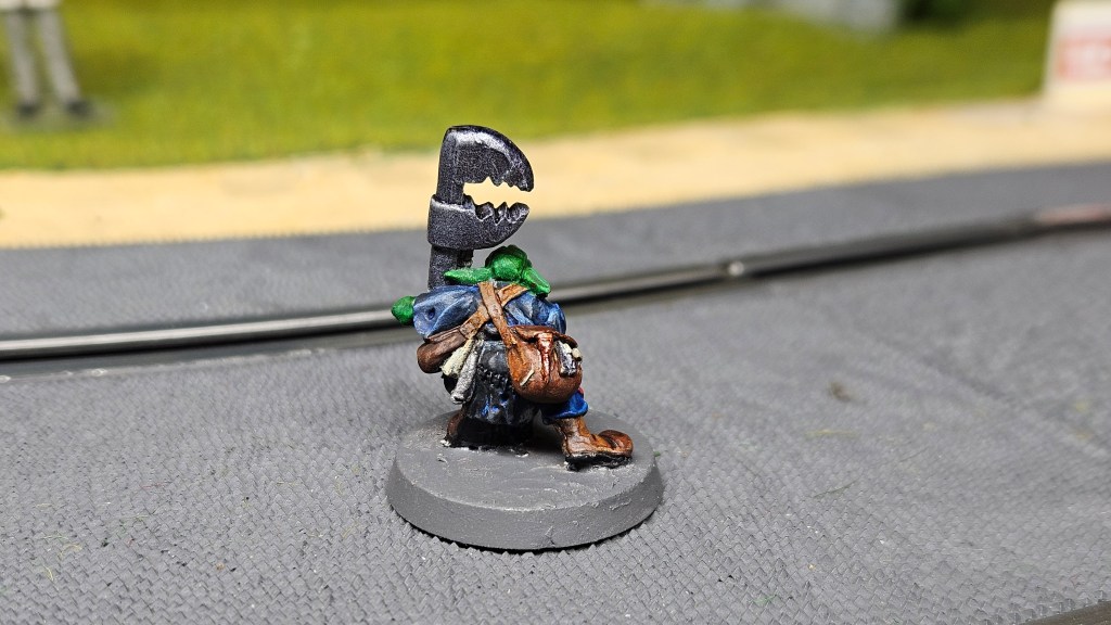 Et au mieux que j’ai réussi, après avoir tenté d’affiner mes glacis – en vain ! C’est facile quand on voit les vidéos Youtube, mais en vrai, c’est soit trop épais, soit ça fait de la flotte, et la peinture fait de la « craie » en séchant, c’est grumeleux. Ce que ça fait sur ma figurine…