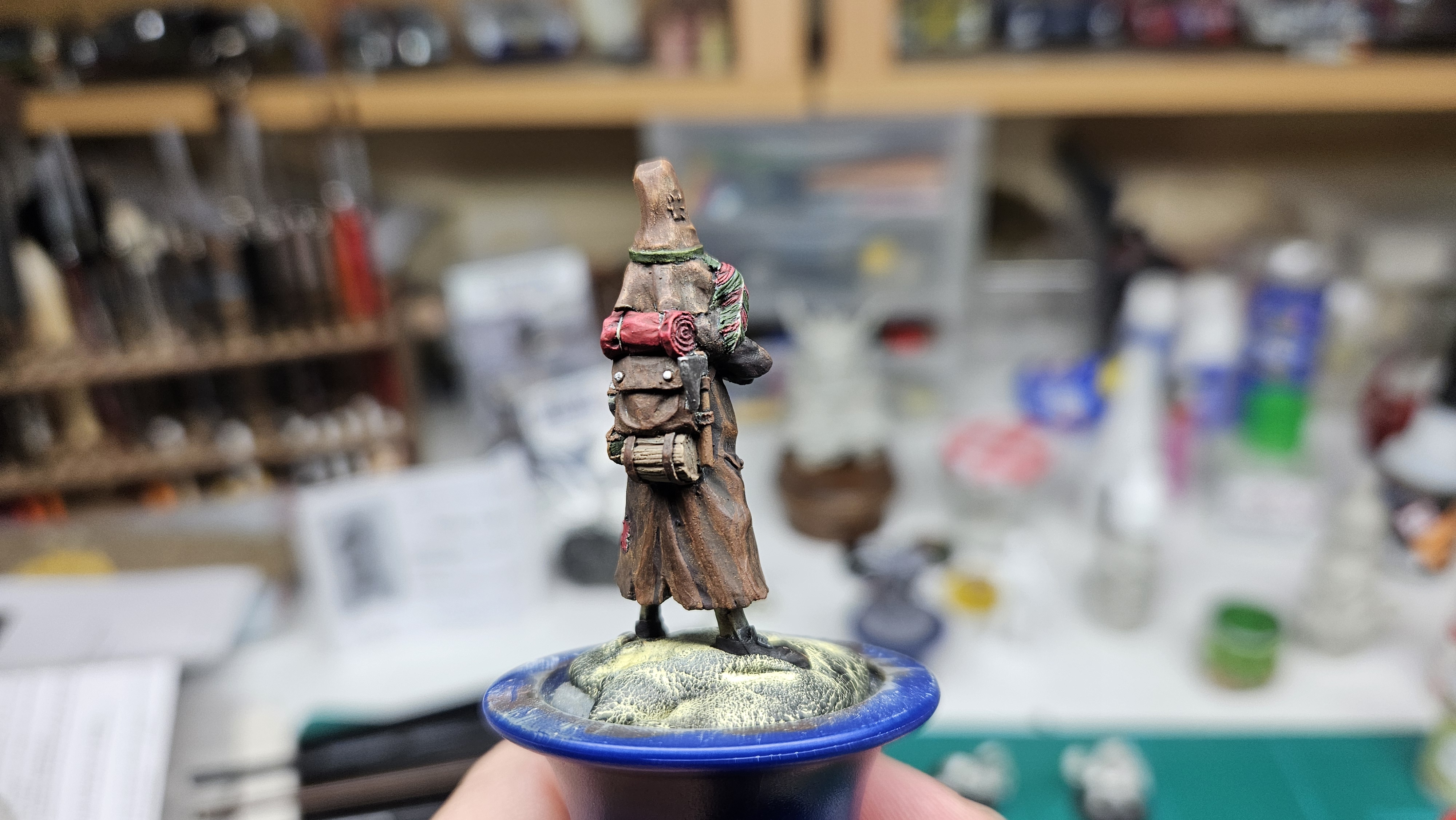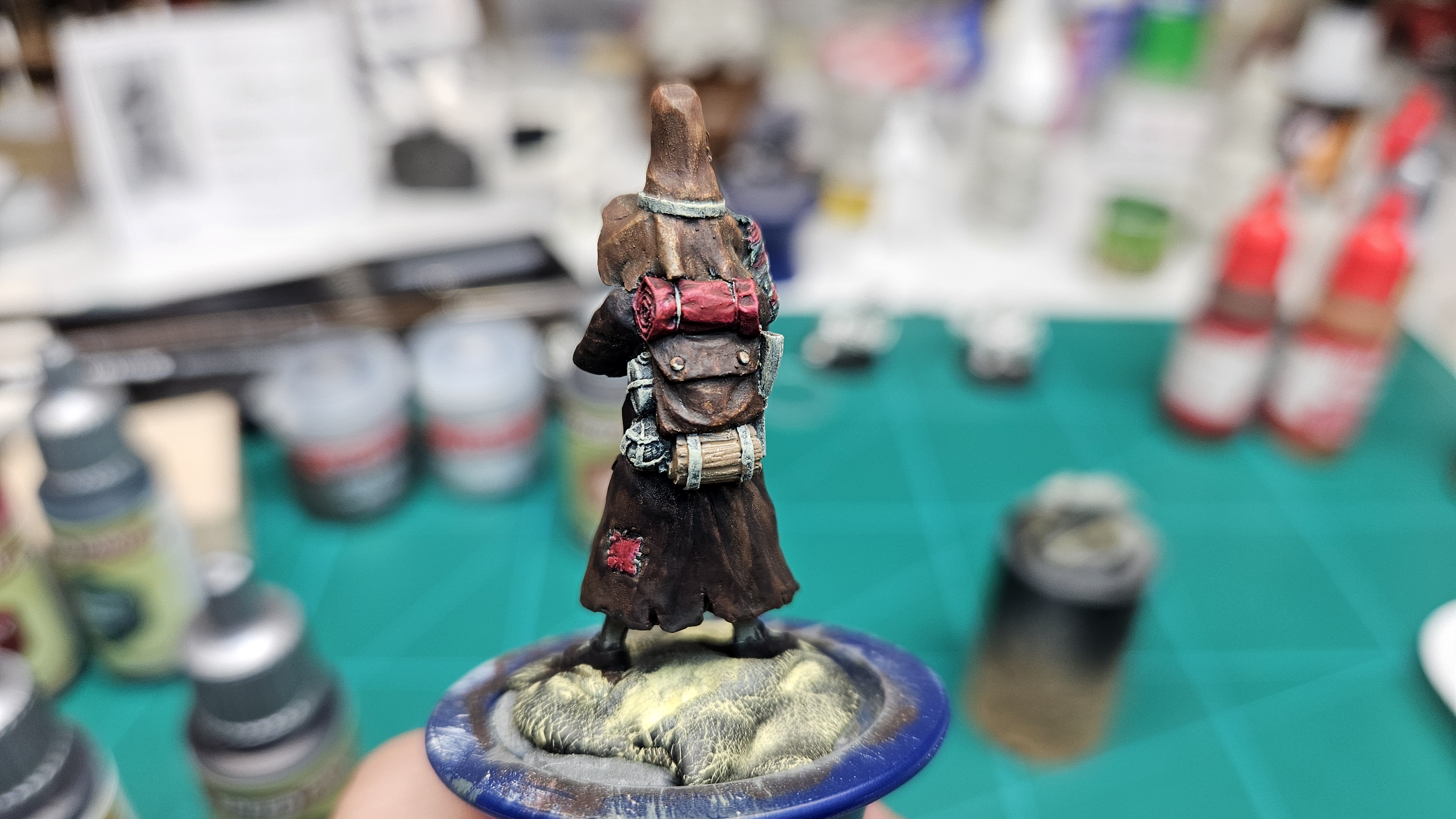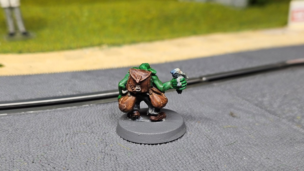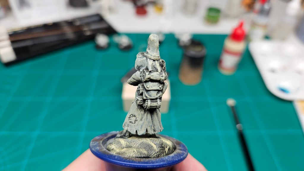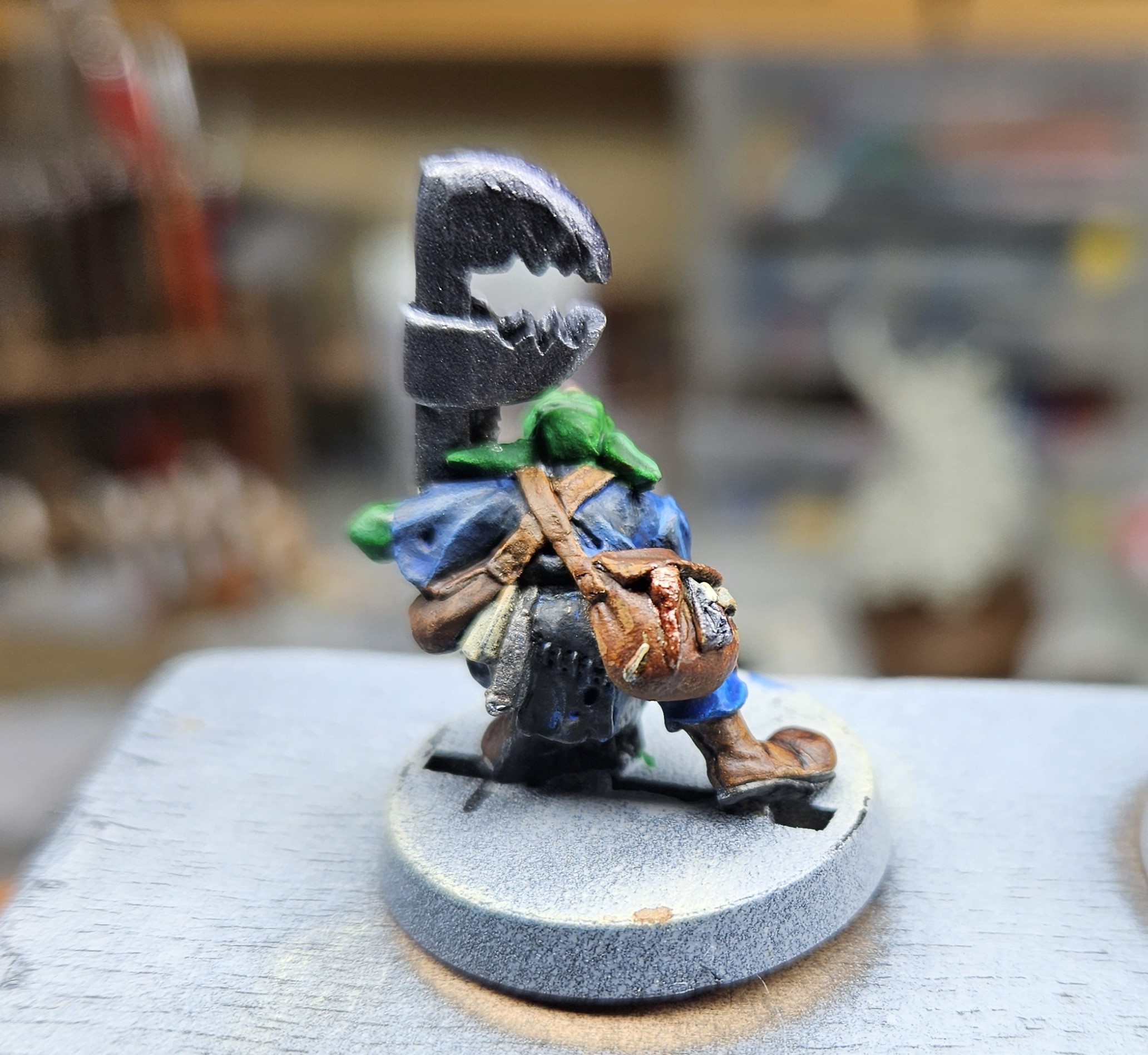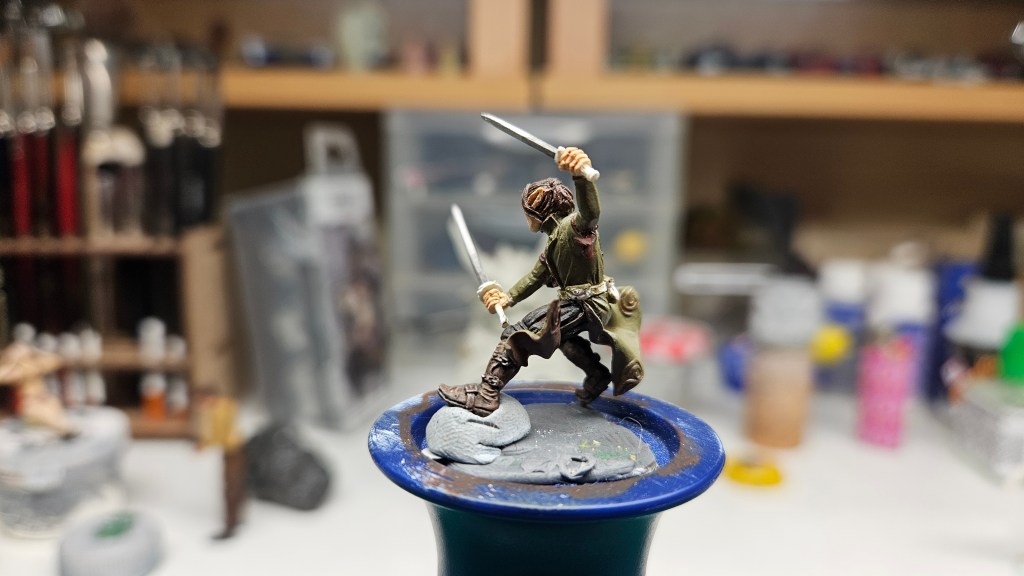 Et au mieux que j’ai réussi, après avoir tenté d’affiner mes glacis – en vain ! C’est facile quand on voit les vidéos Youtube, mais en vrai, c’est soit trop épais, soit ça fait de la flotte, et la peinture fait de la « craie » en séchant, c’est grumeleux. Ce que ça fait sur ma figurine…