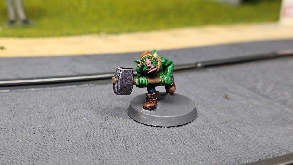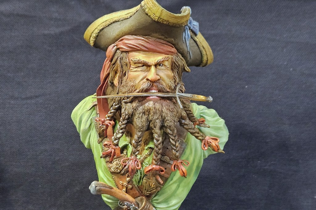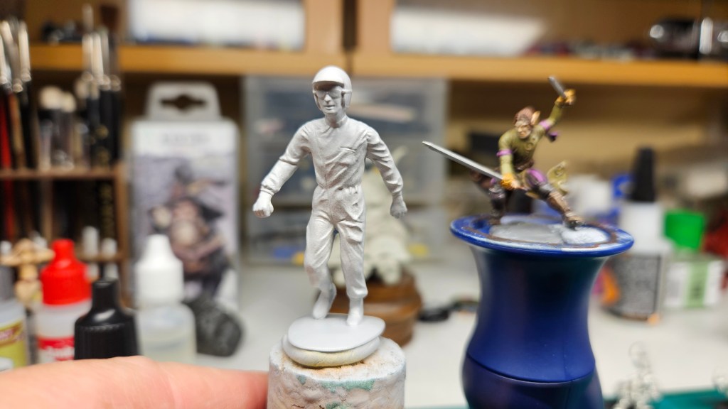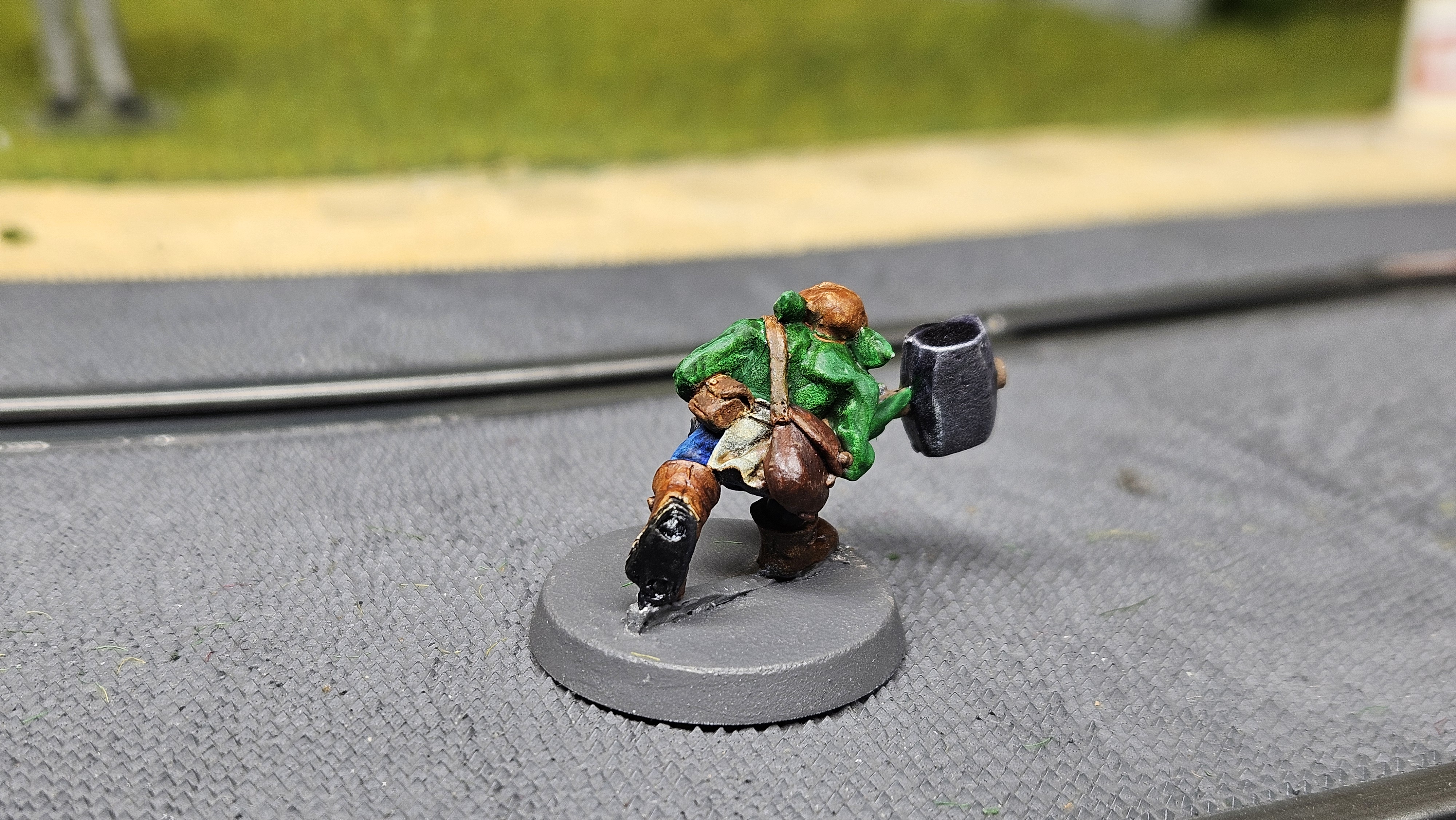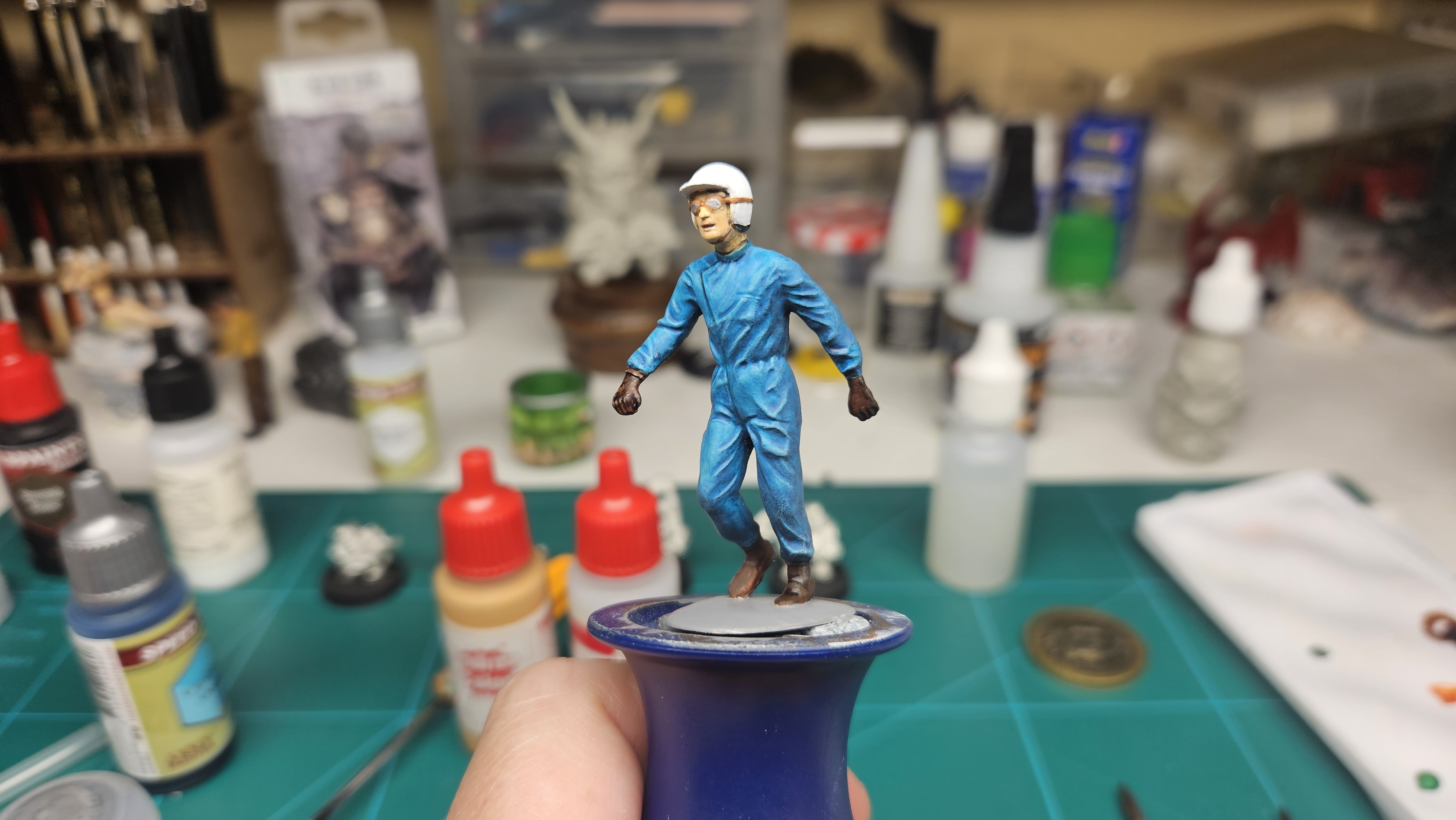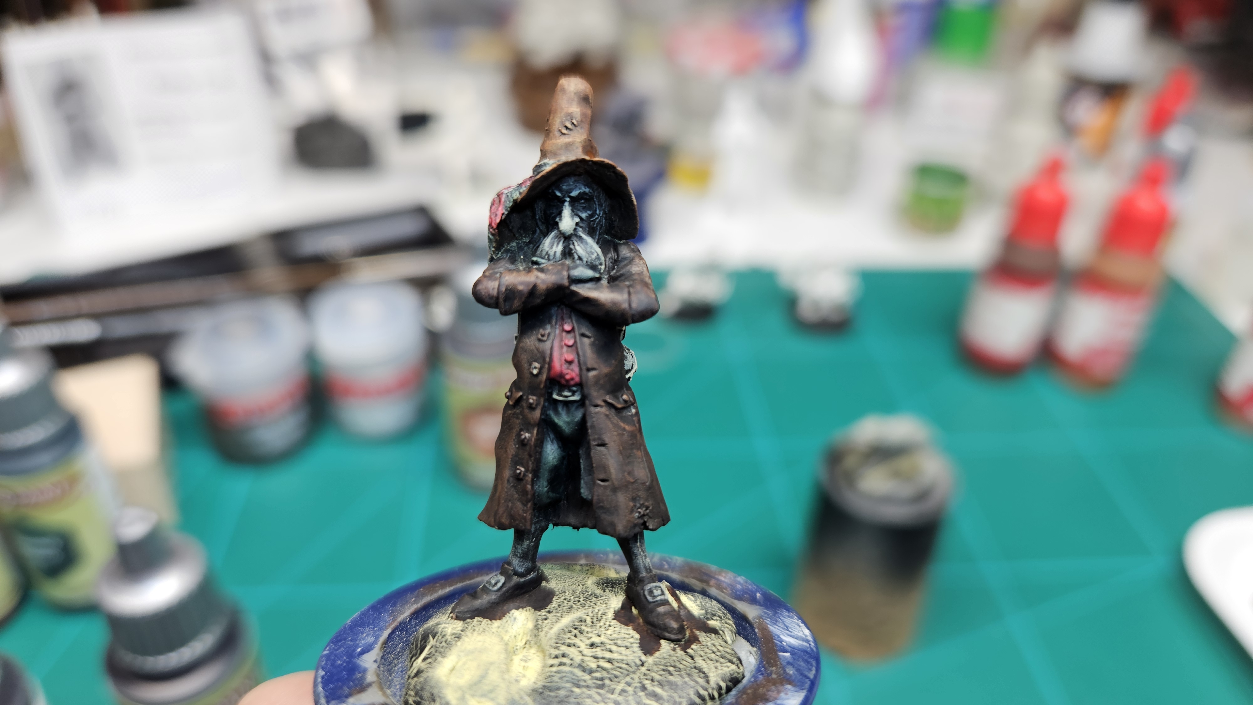 Et au mieux que j’ai réussi, après avoir tenté d’affiner mes glacis – en vain ! C’est facile quand on voit les vidéos Youtube, mais en vrai, c’est soit trop épais, soit ça fait de la flotte, et la peinture fait de la « craie » en séchant, c’est grumeleux. Ce que ça fait sur ma figurine…