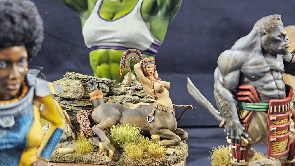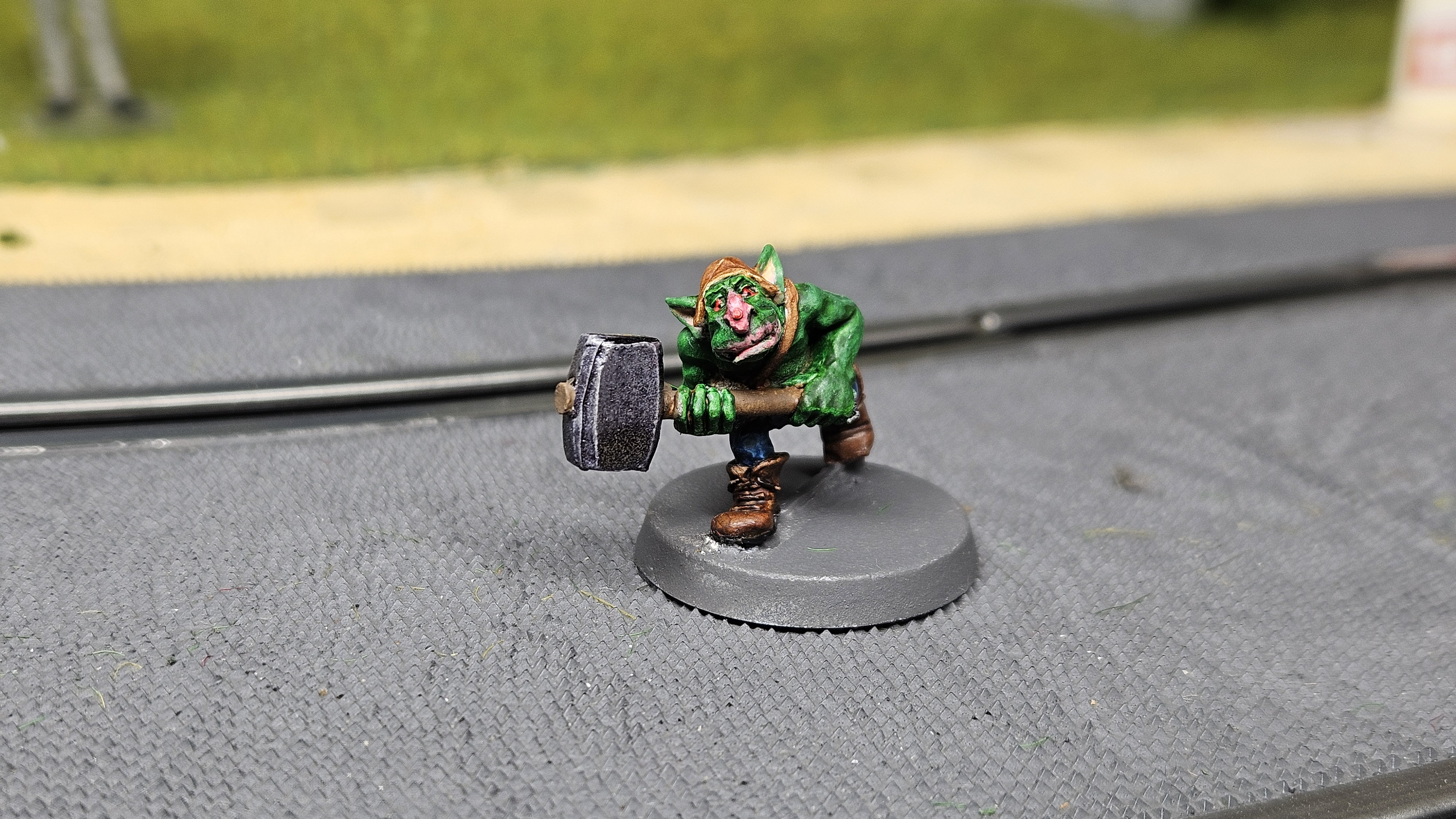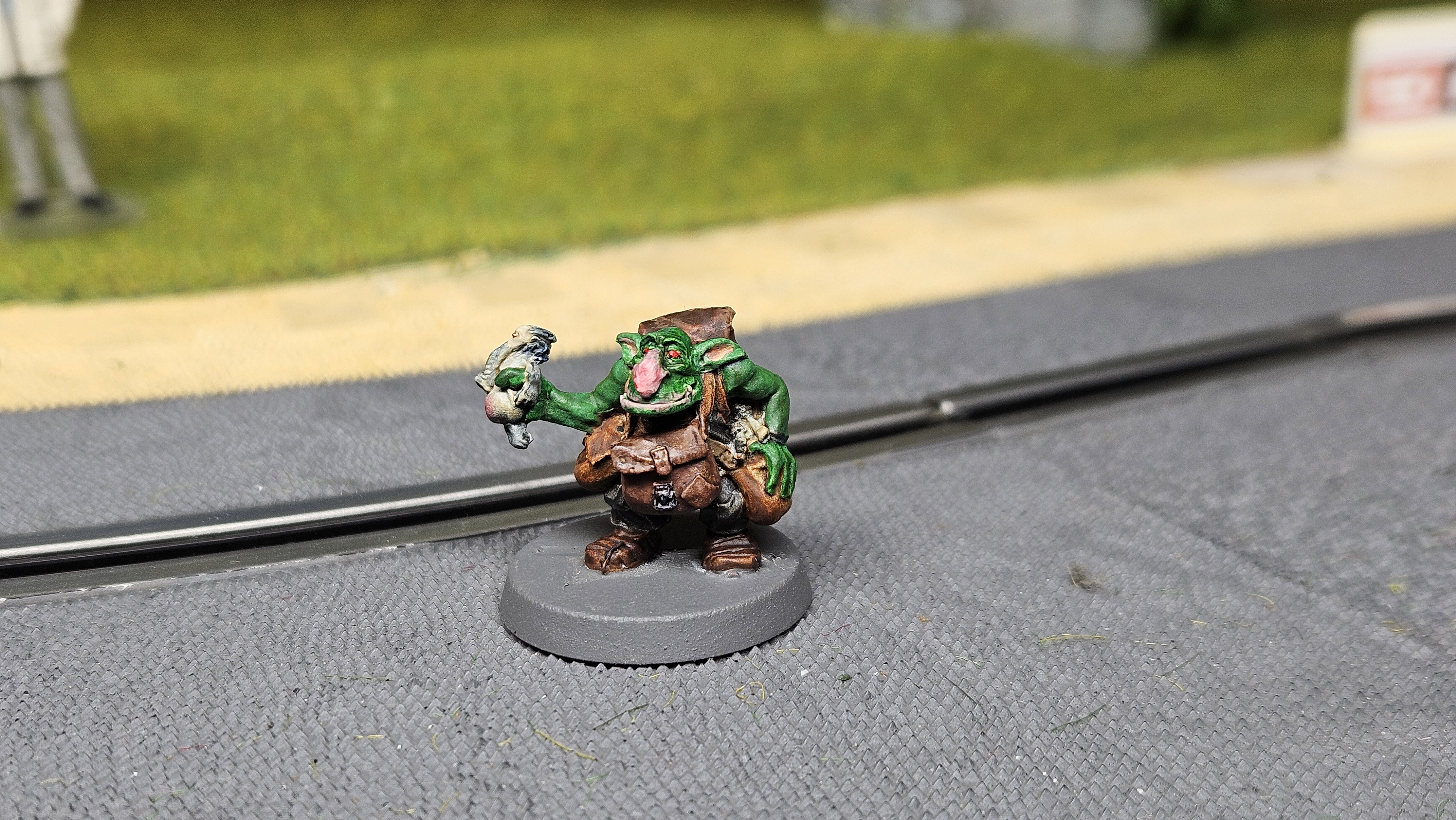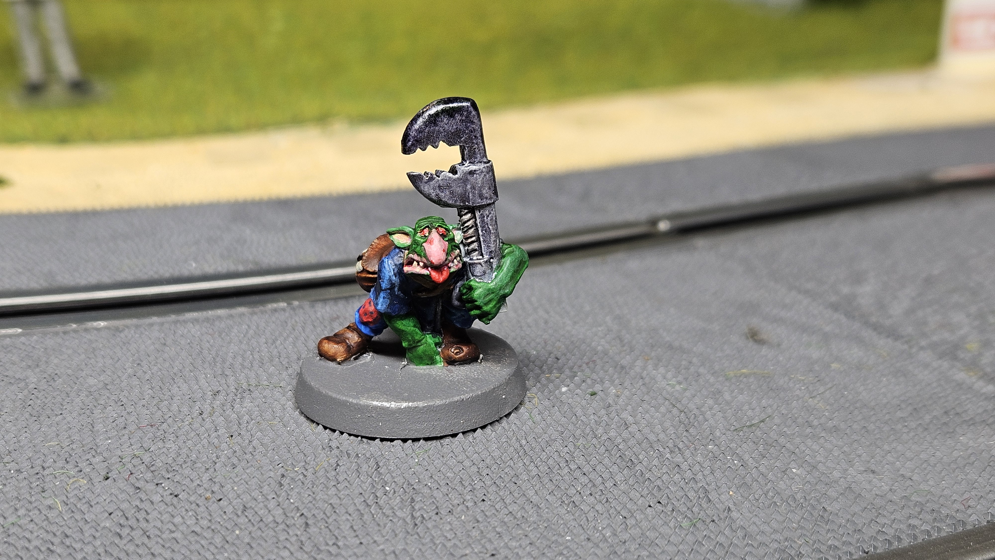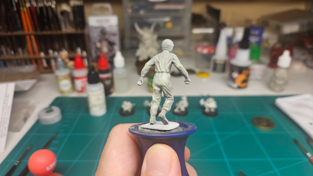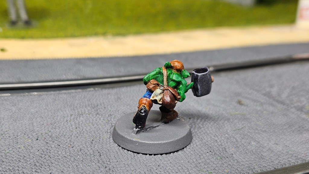 Et au mieux que j’ai réussi, après avoir tenté d’affiner mes glacis – en vain ! C’est facile quand on voit les vidéos Youtube, mais en vrai, c’est soit trop épais, soit ça fait de la flotte, et la peinture fait de la « craie » en séchant, c’est grumeleux. Ce que ça fait sur ma figurine…