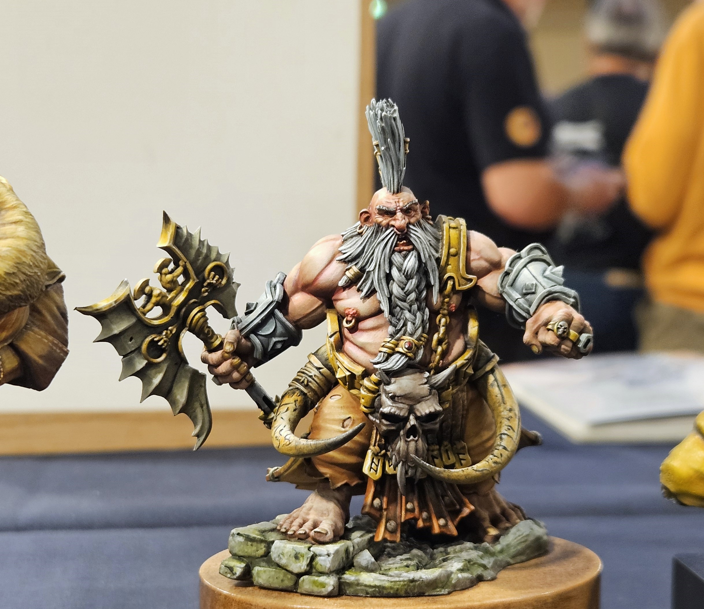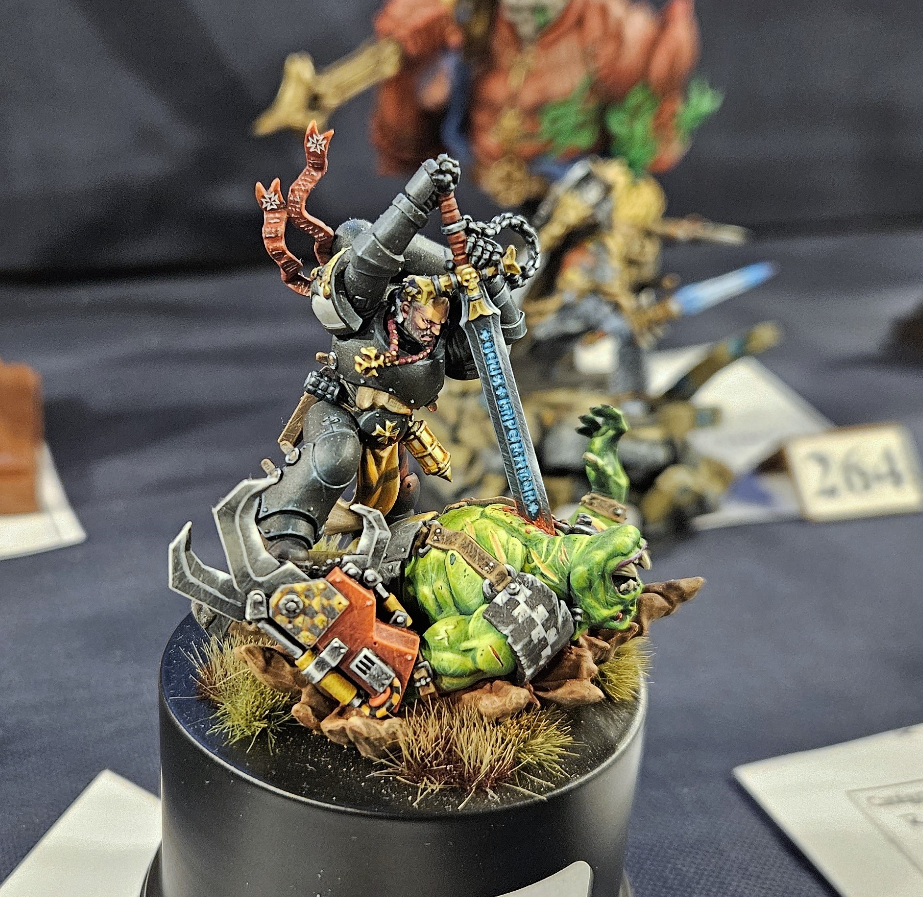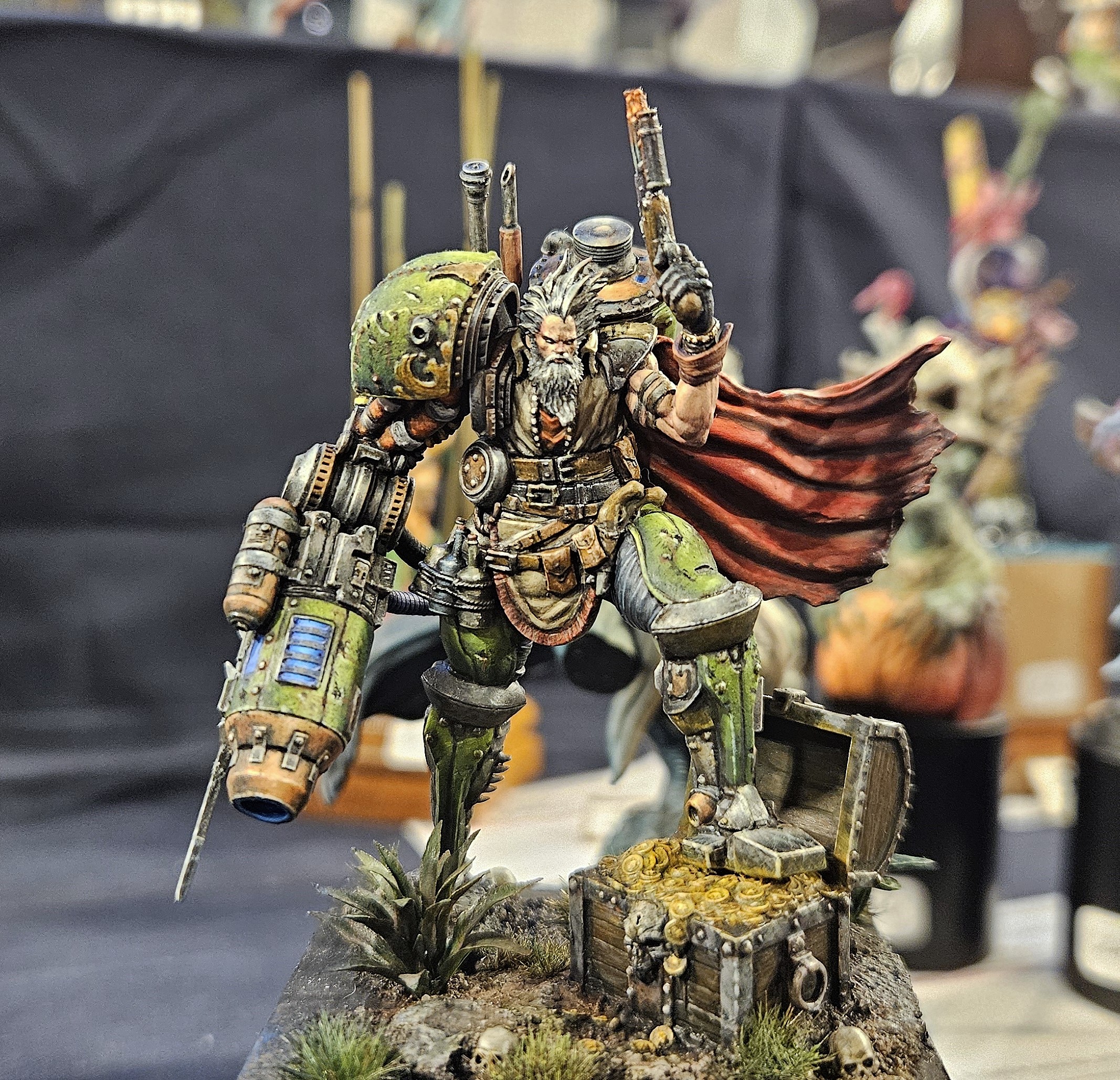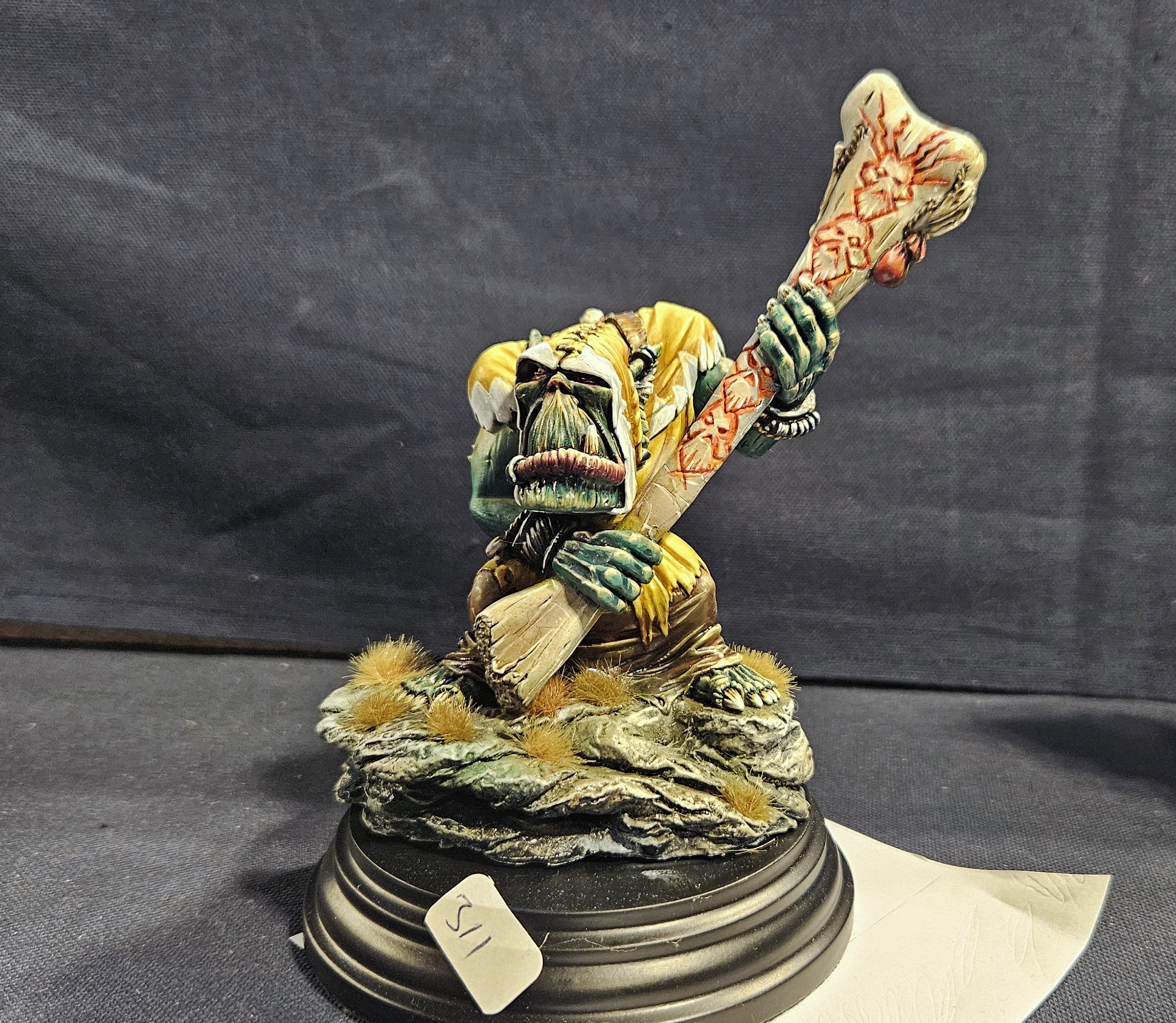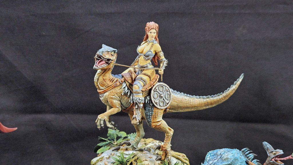 Et au mieux que j’ai réussi, après avoir tenté d’affiner mes glacis – en vain ! C’est facile quand on voit les vidéos Youtube, mais en vrai, c’est soit trop épais, soit ça fait de la flotte, et la peinture fait de la « craie » en séchant, c’est grumeleux. Ce que ça fait sur ma figurine…