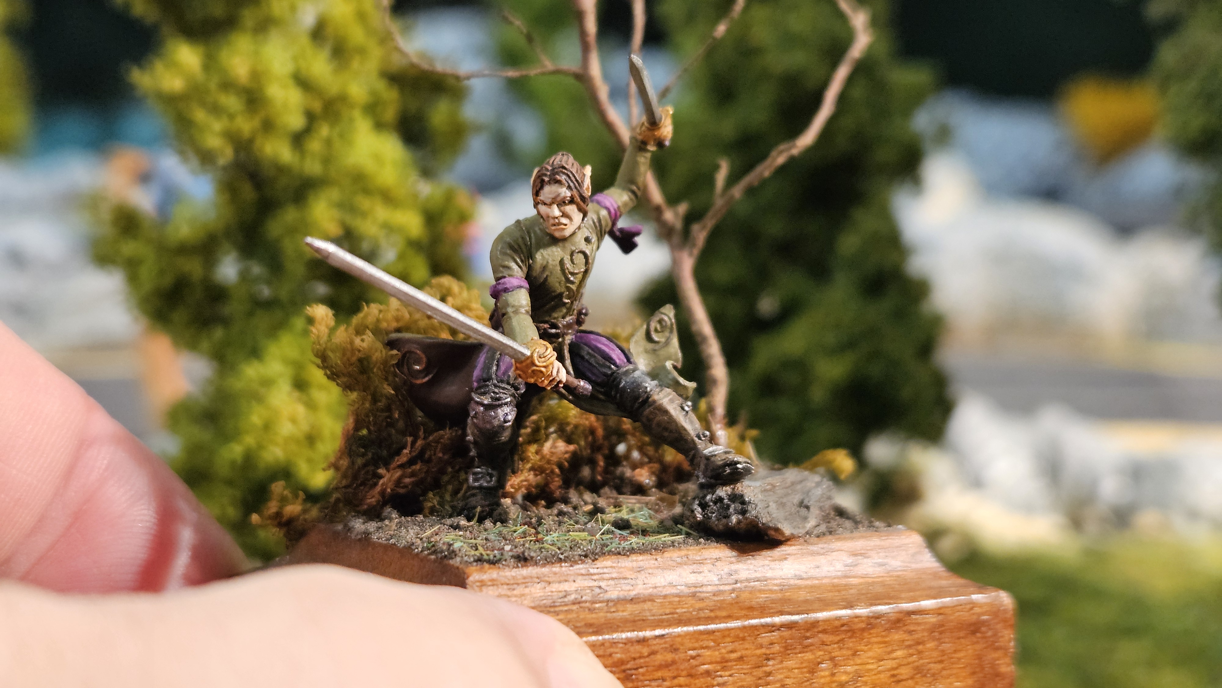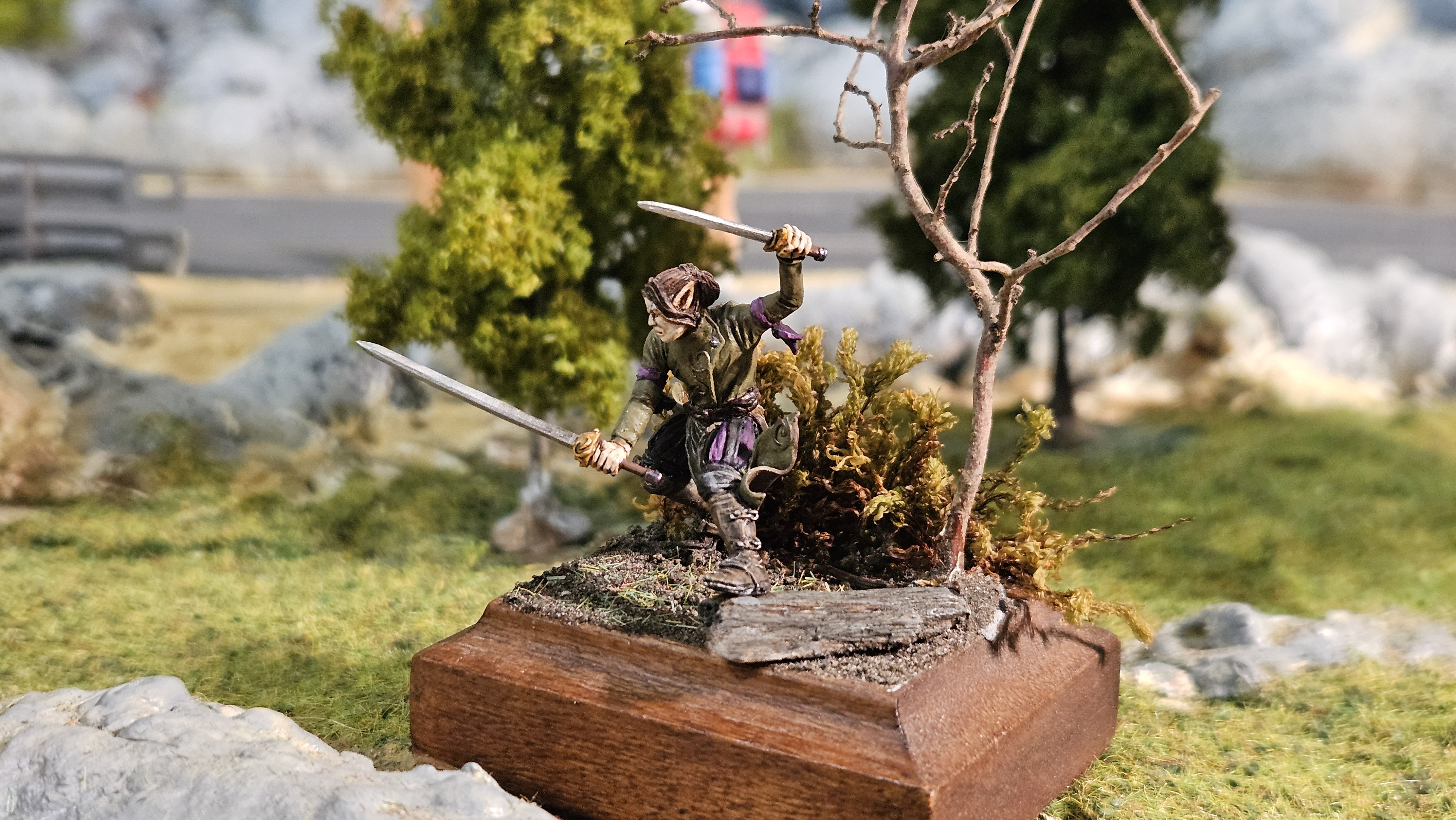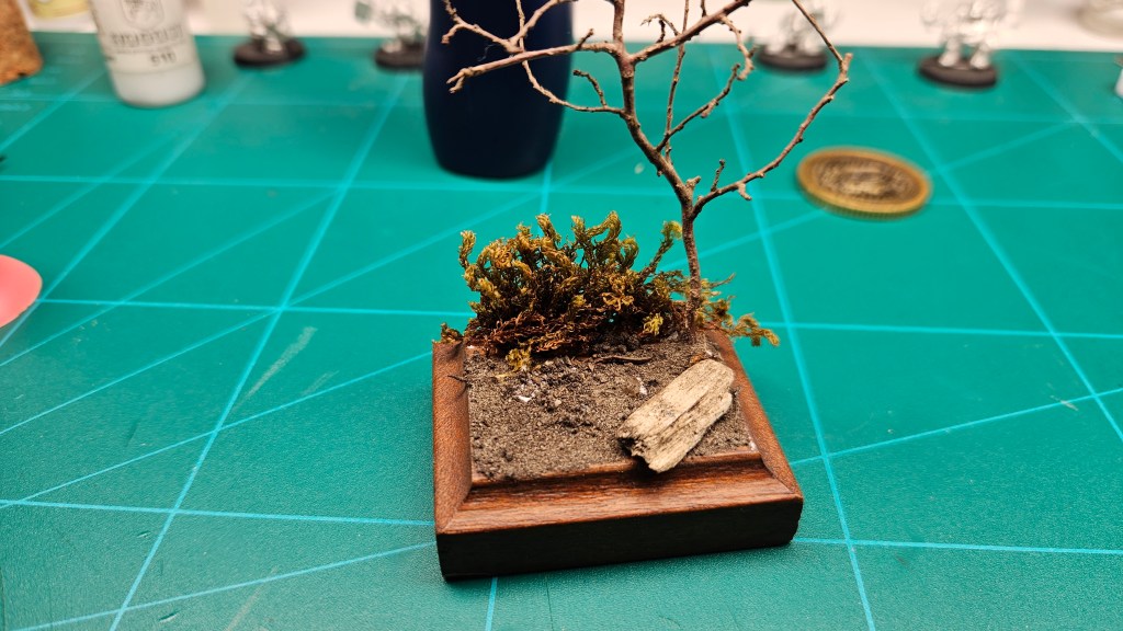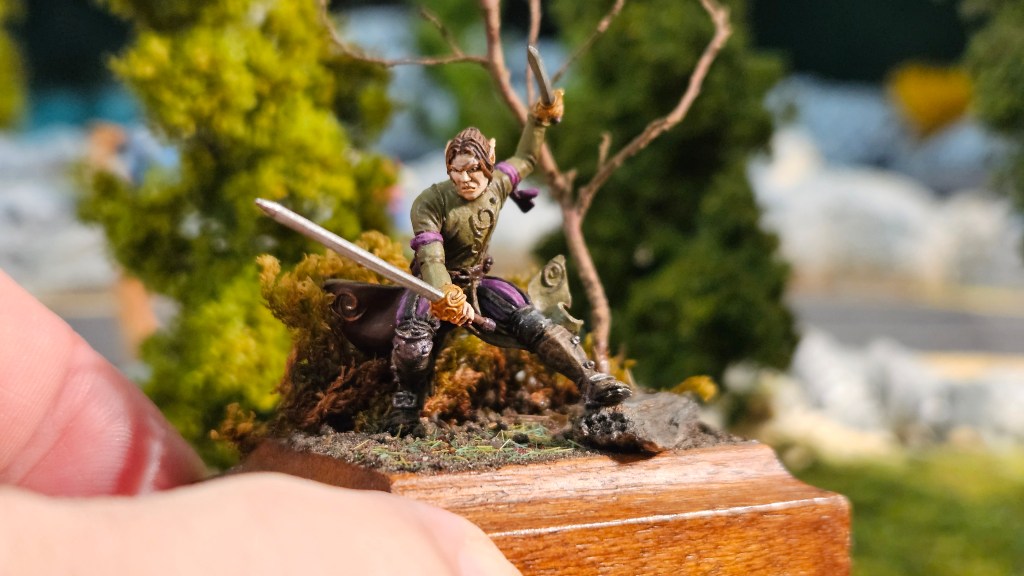 Donc, le mien, j’ai fait au mieux – et pour l’instant, je suis à fond. Idem, je n’avais jamais fait de socle… J’ai hésité à peindre une autre figurine, pour faire une mise en scène style « combat »… Je le ferai peut-être, mais pour l’instant, Elrick va avoir droit à son socle perso… Avec un bout de mousse, une mini branche d’arbre, un peu de terre par terre, et un morceau de bois peint « façon rocher » :