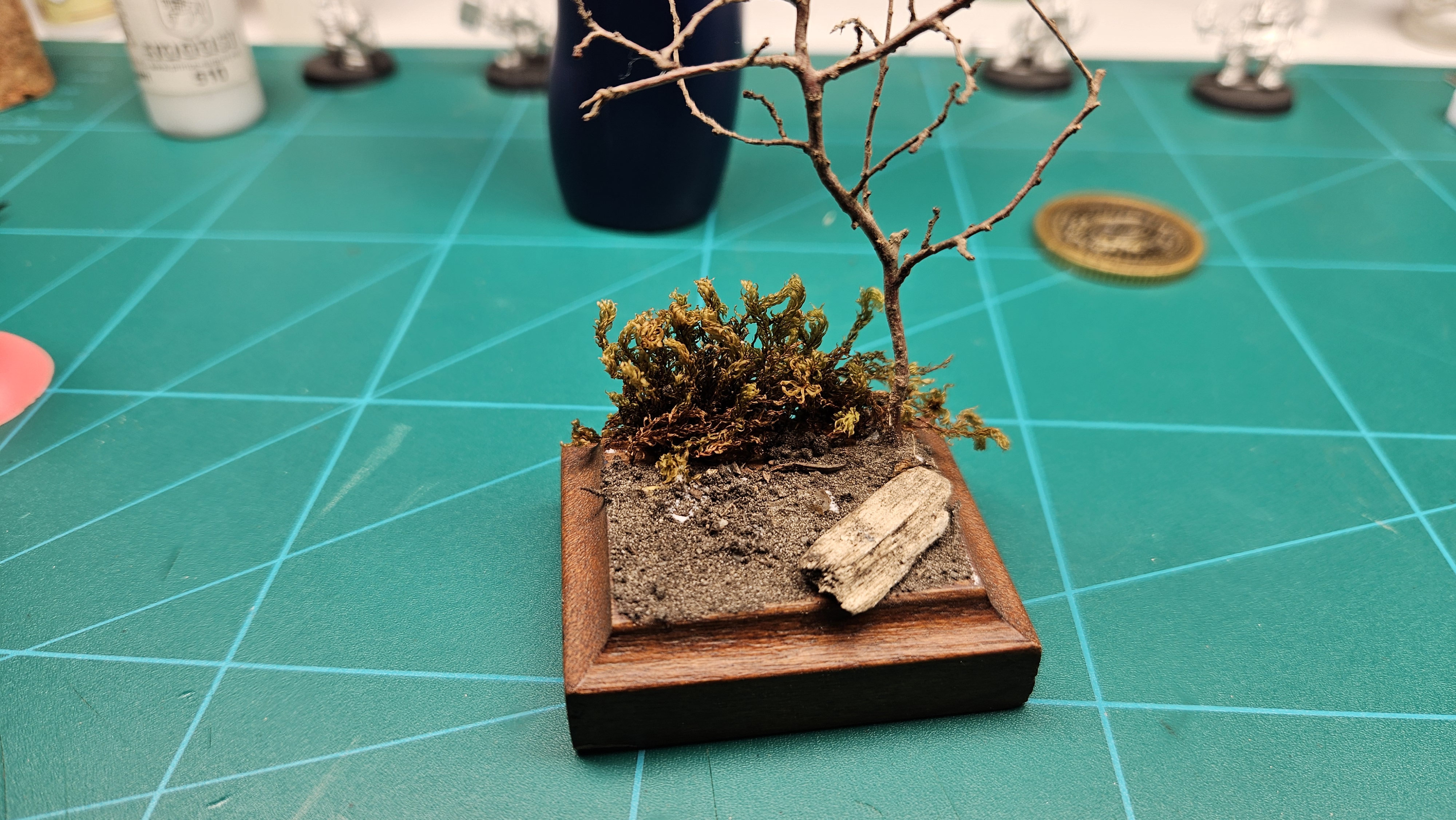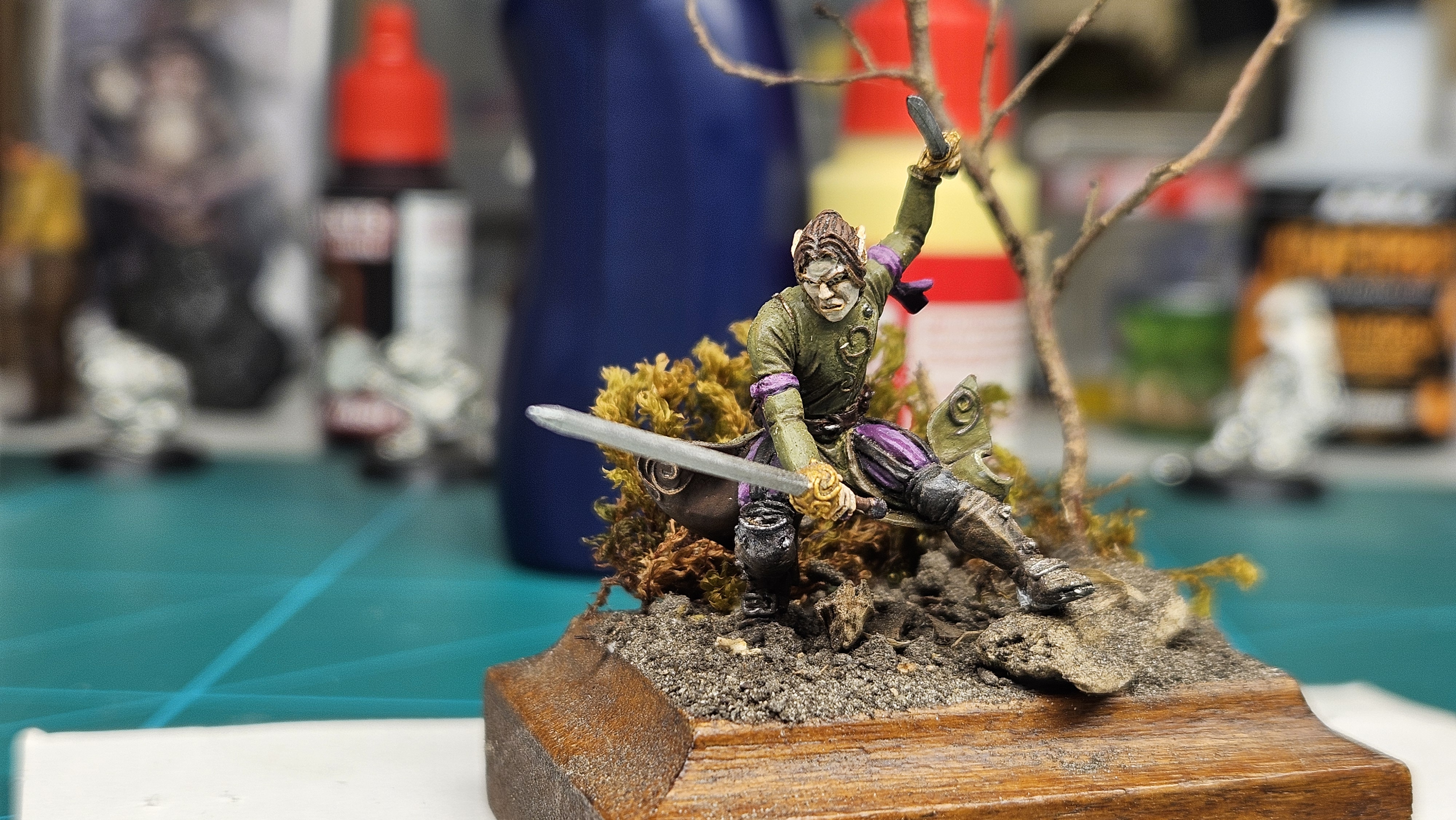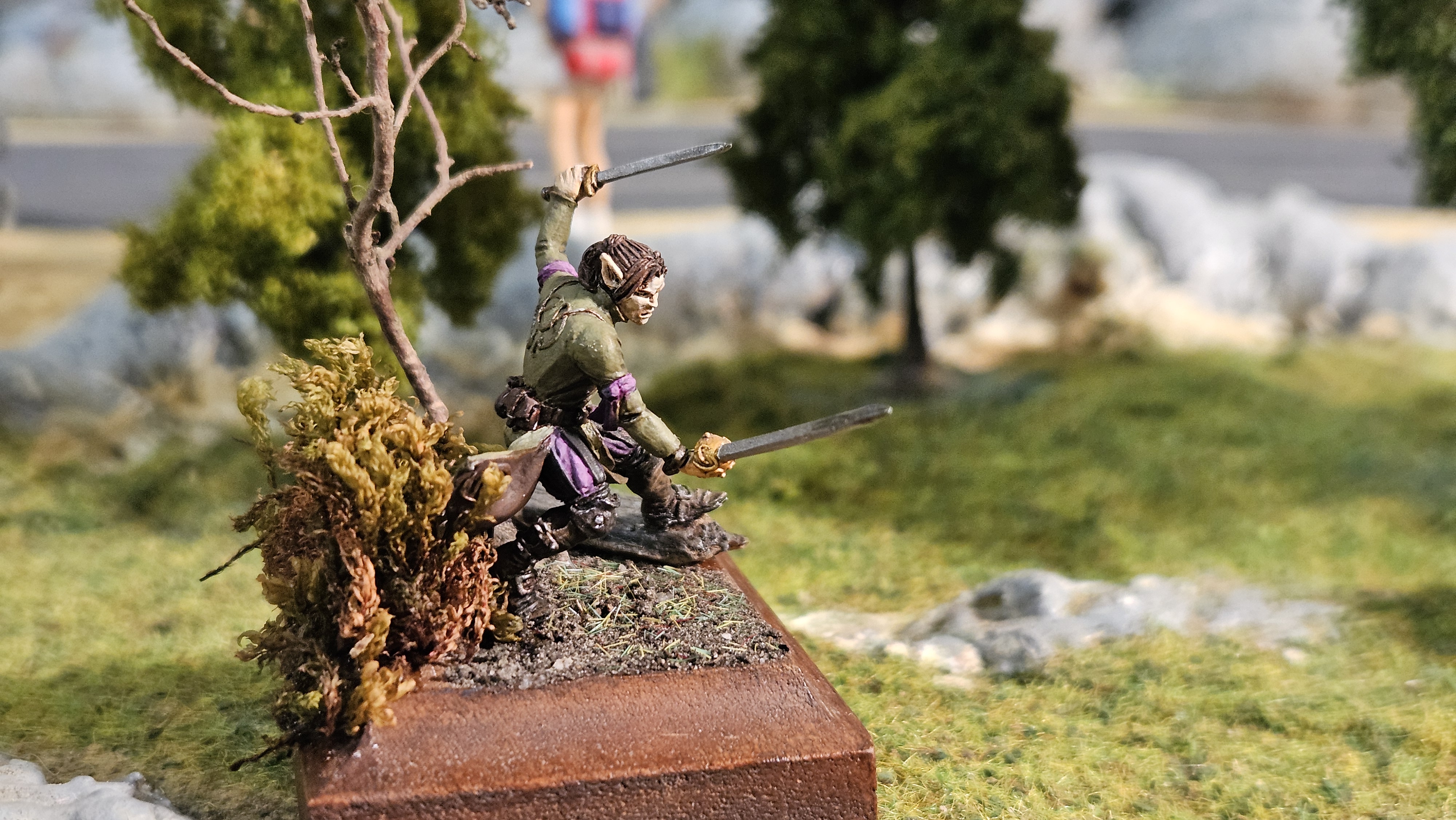Donc, le mien, j’ai fait au mieux – et pour l’instant, je suis à fond. Idem, je n’avais jamais fait de socle… J’ai hésité à peindre une autre figurine, pour faire une mise en scène style « combat »… Je le ferai peut-être, mais pour l’instant, Elrick va avoir droit à son socle perso… Avec un bout de mousse, une mini branche d’arbre, un peu de terre par terre, et un morceau de bois peint « façon rocher » :