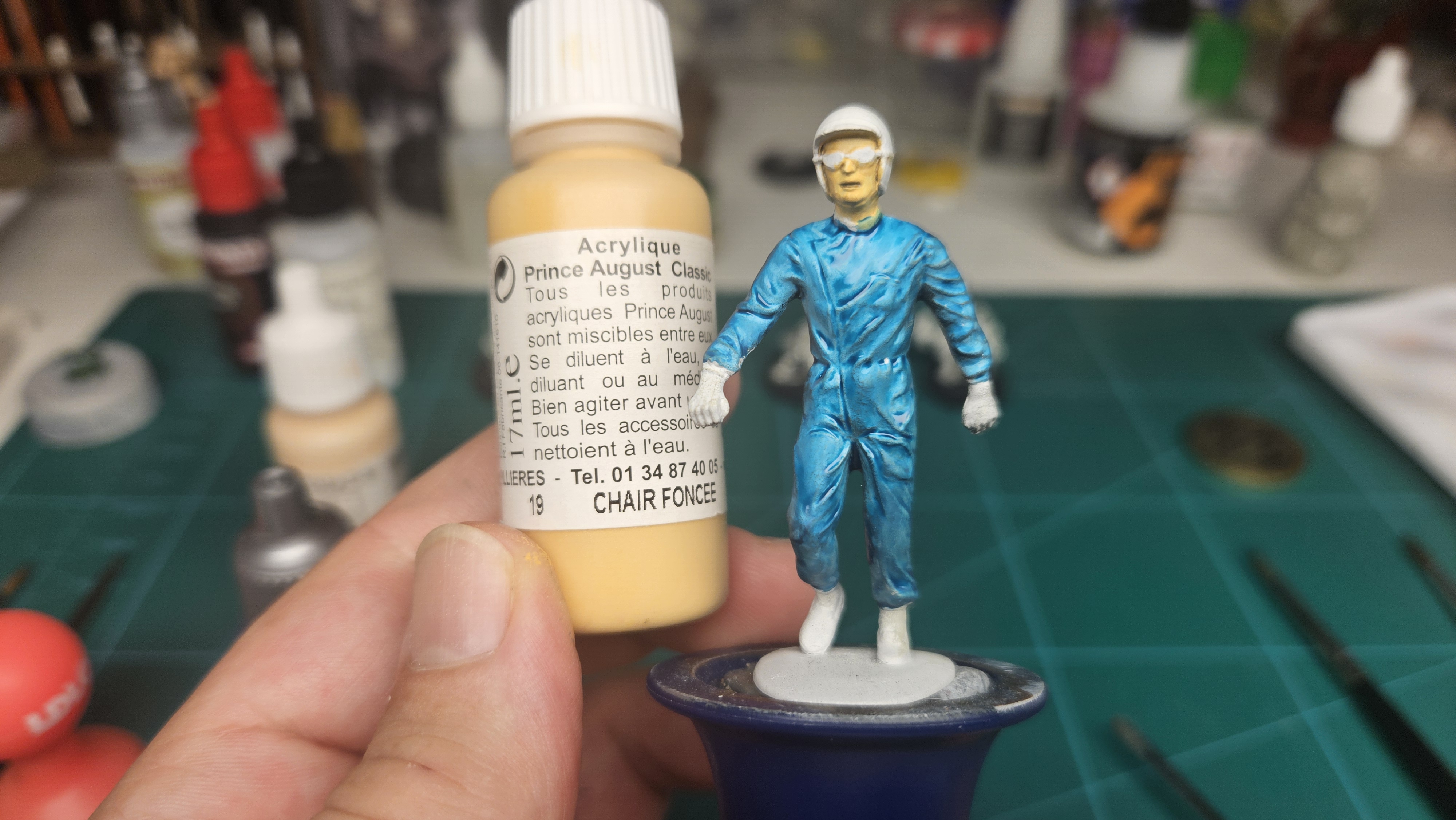 Par contre, j’essaie d’user autant que possible mon ancien stock de peinture, dont ce pot de Prince August « Chair foncée », qui est quand même carrément jaune, je trouve !