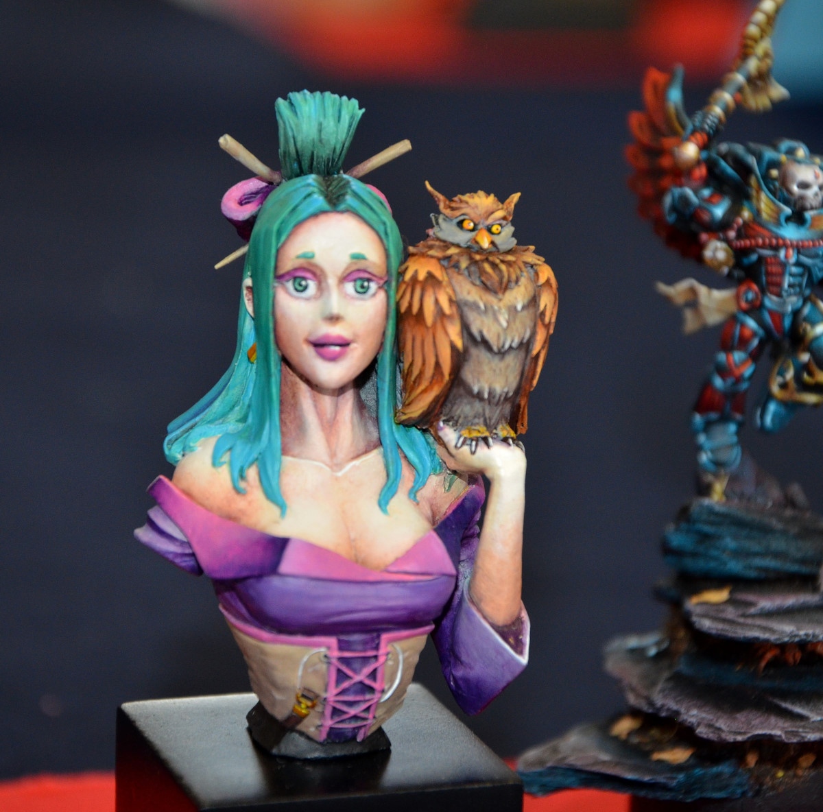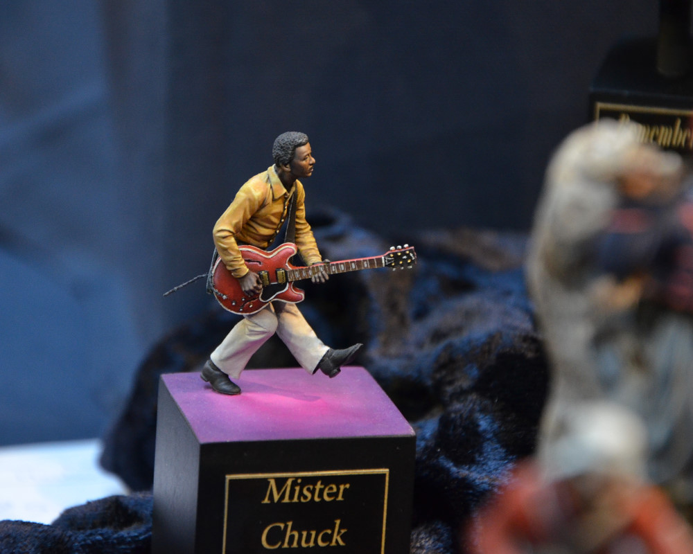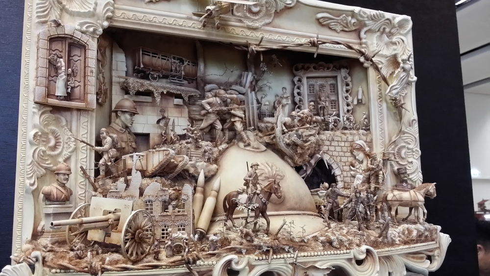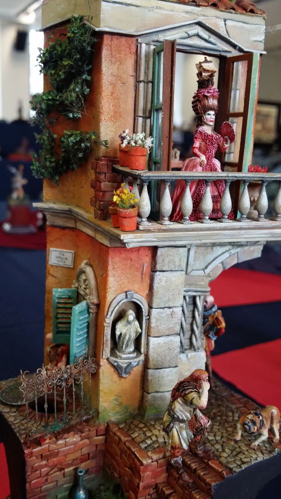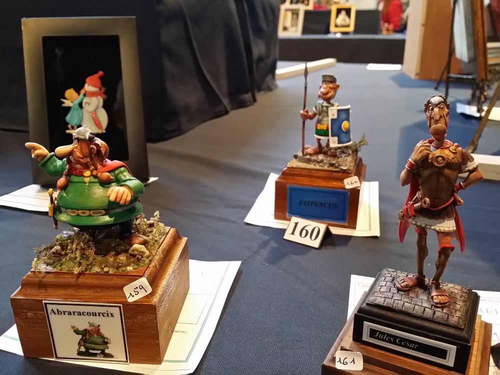 Difficile de faire des images de qualité avec un éclairage jaune qui dénaturait les couleurs des figurines. Mes photos ne sont donc qu’un pâle reflet de la beauté des oeuvres présentées… Il aurait fallu protéger les figurines des spots et les éclairer autrement.