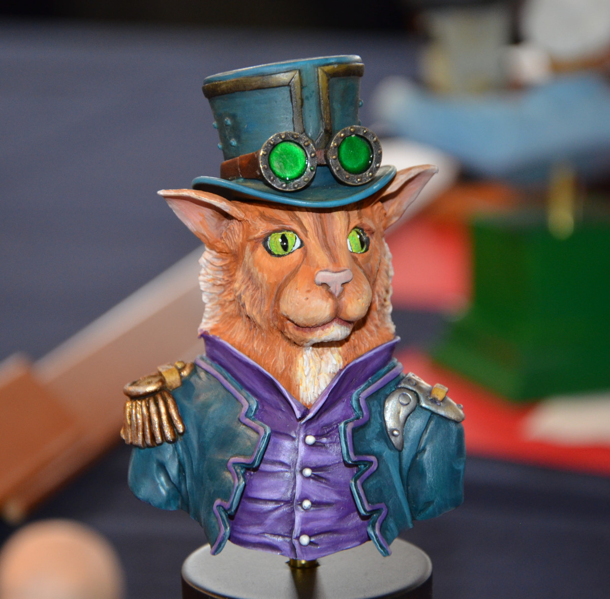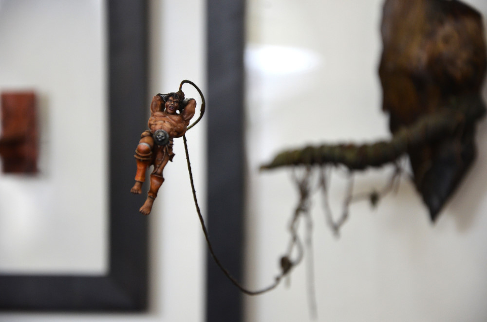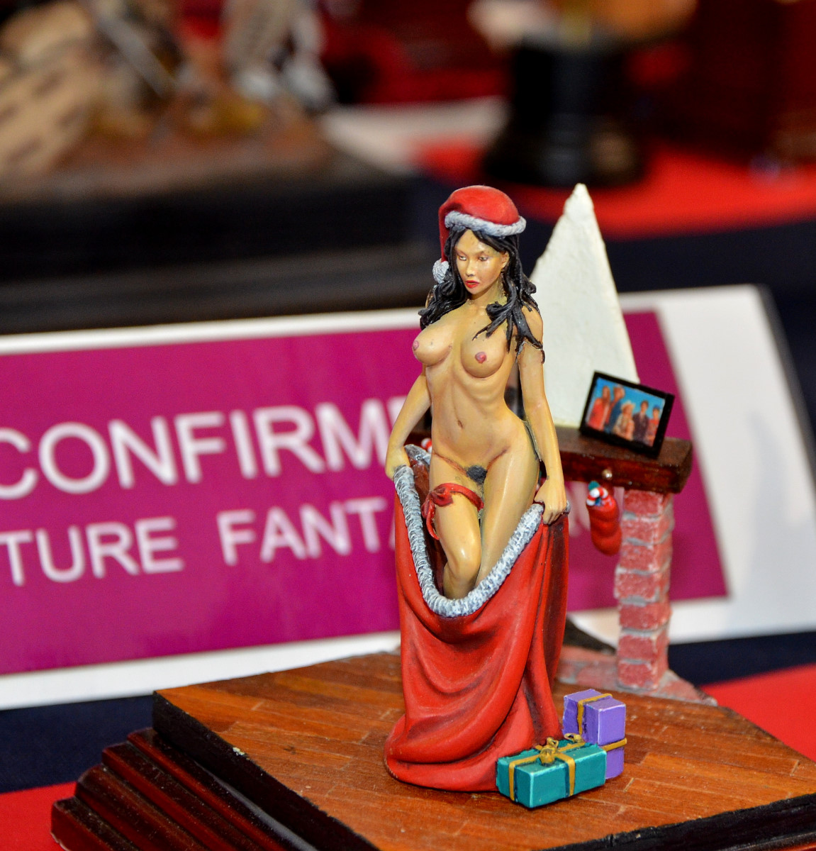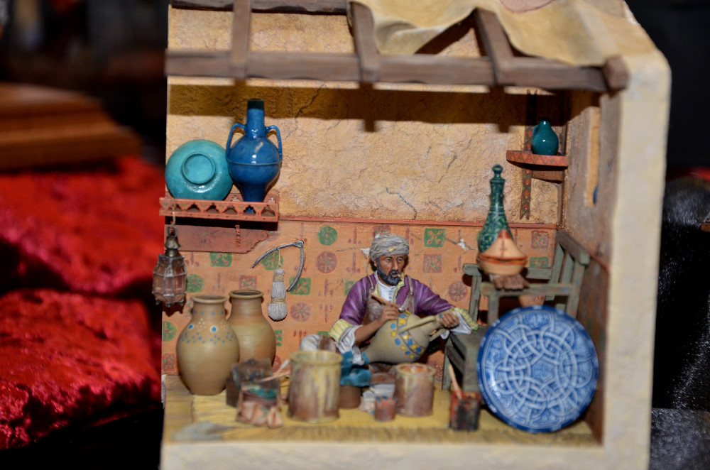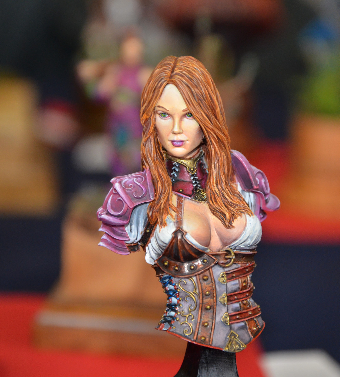 Difficile de faire des images de qualité avec un éclairage jaune qui dénaturait les couleurs des figurines. Mes photos ne sont donc qu’un pâle reflet de la beauté des oeuvres présentées… Il aurait fallu protéger les figurines des spots et les éclairer autrement.
