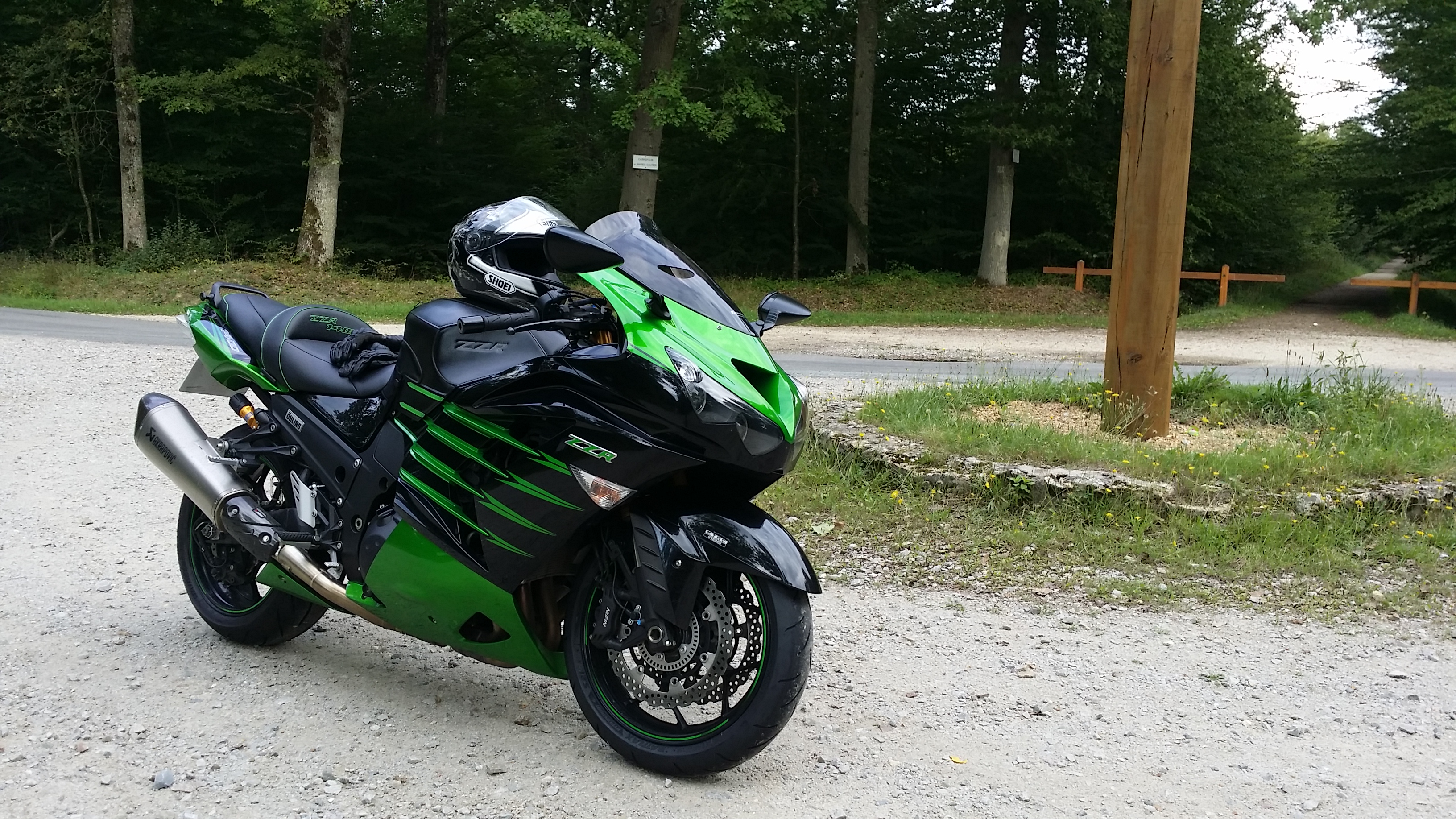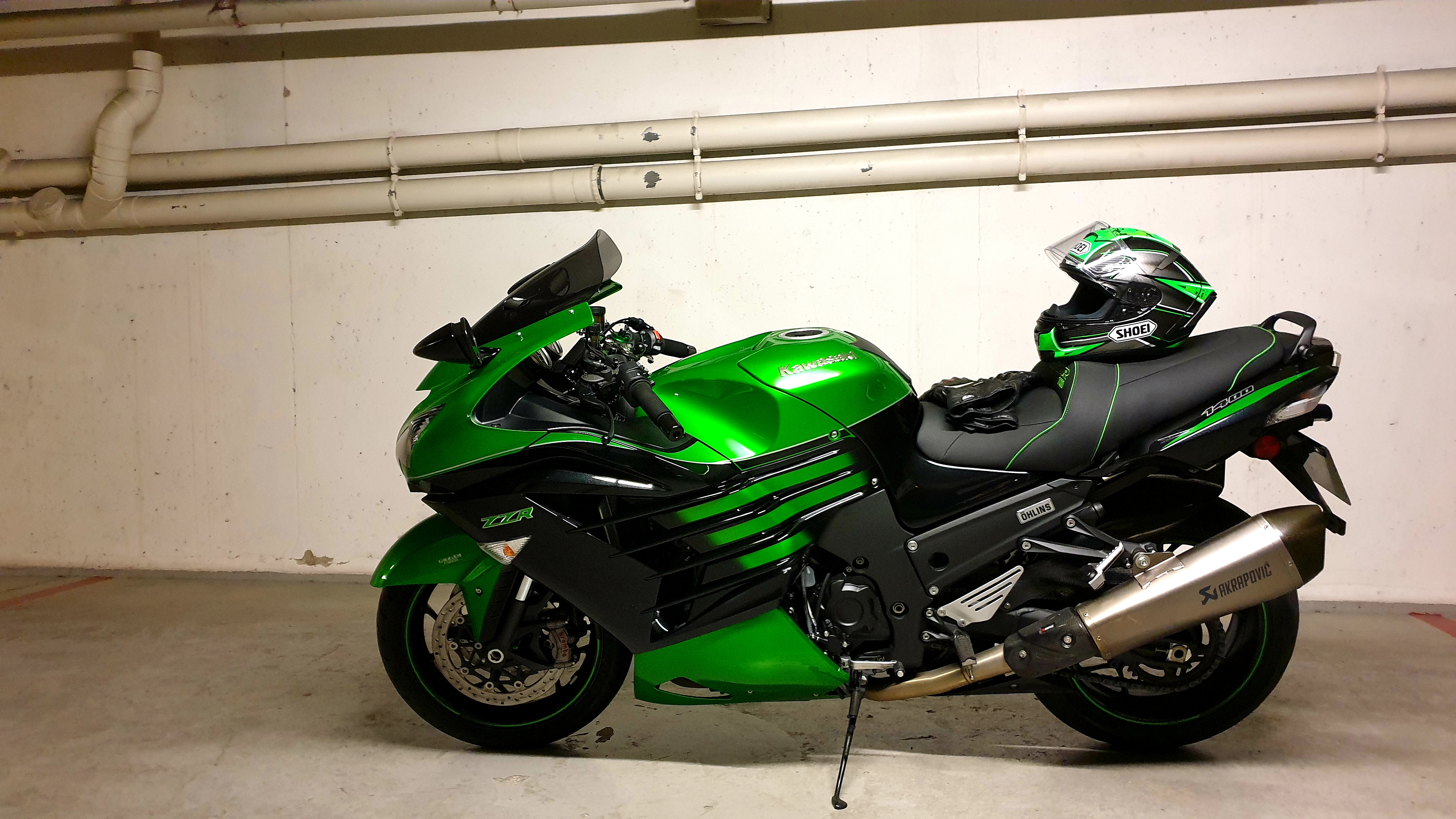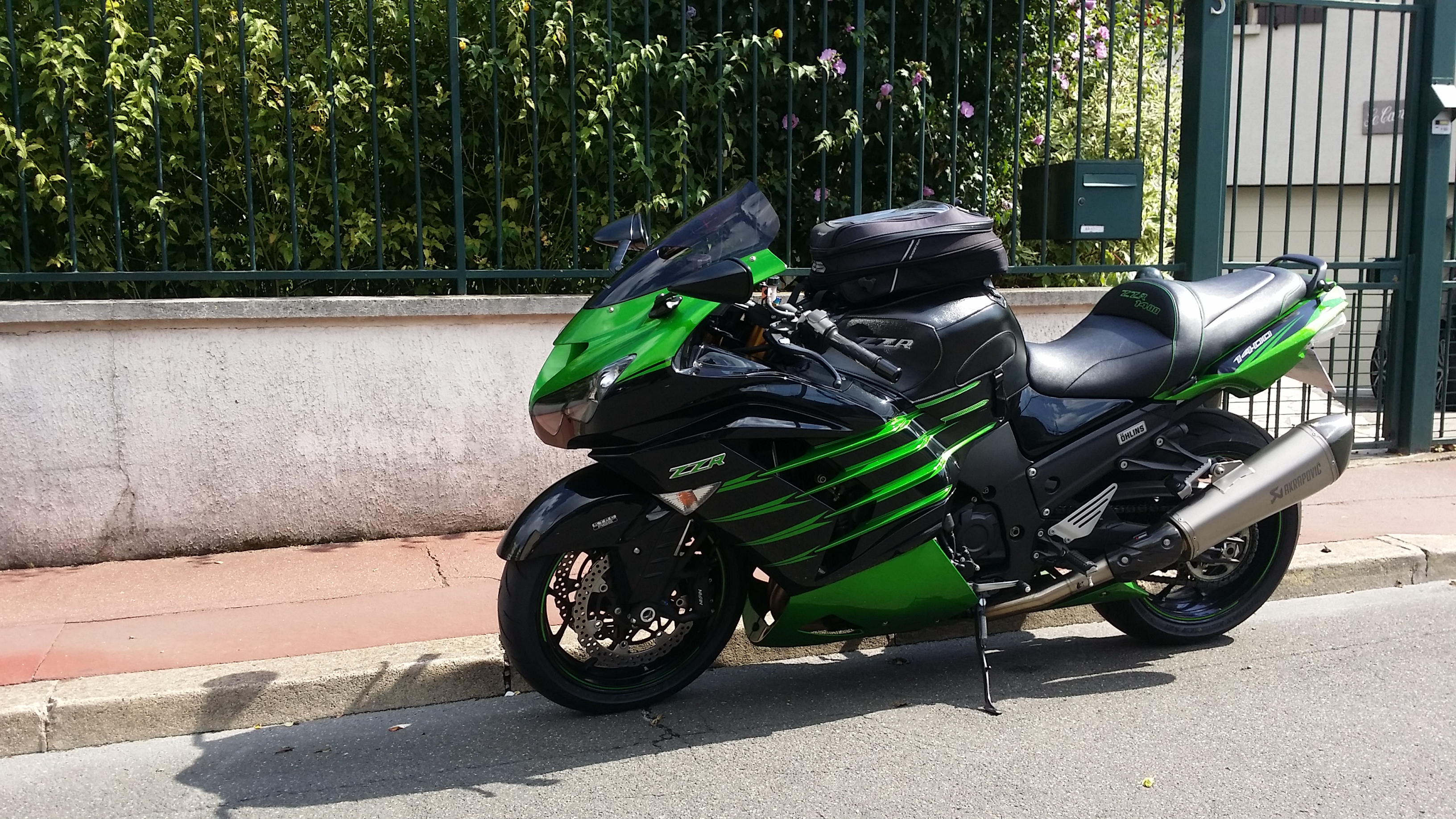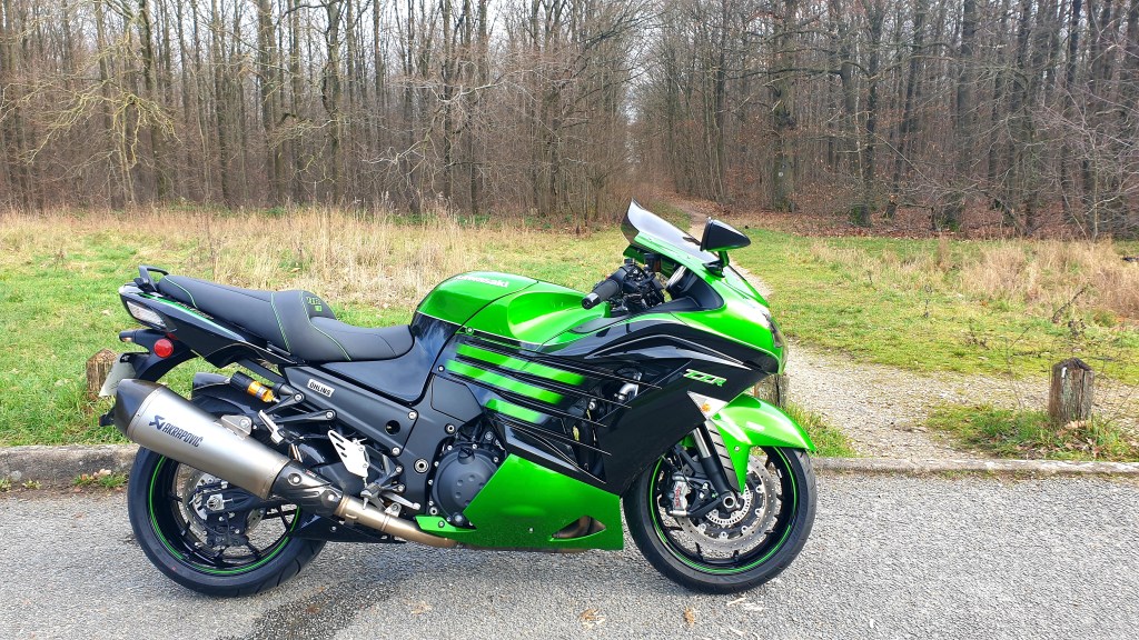 Finalement, j’ai trouvé ma ZZR 1400 « euro4 » de rêve avant d’avoir pu vendre la H2 SX. Pas grave, j’ai sauté sur l’occasion : pile la couleur que je voulais (2016, donc euro3 😦 ) mais immatriculée en 2017, donc… euro4 ! Un miracle !!