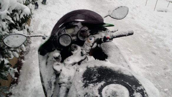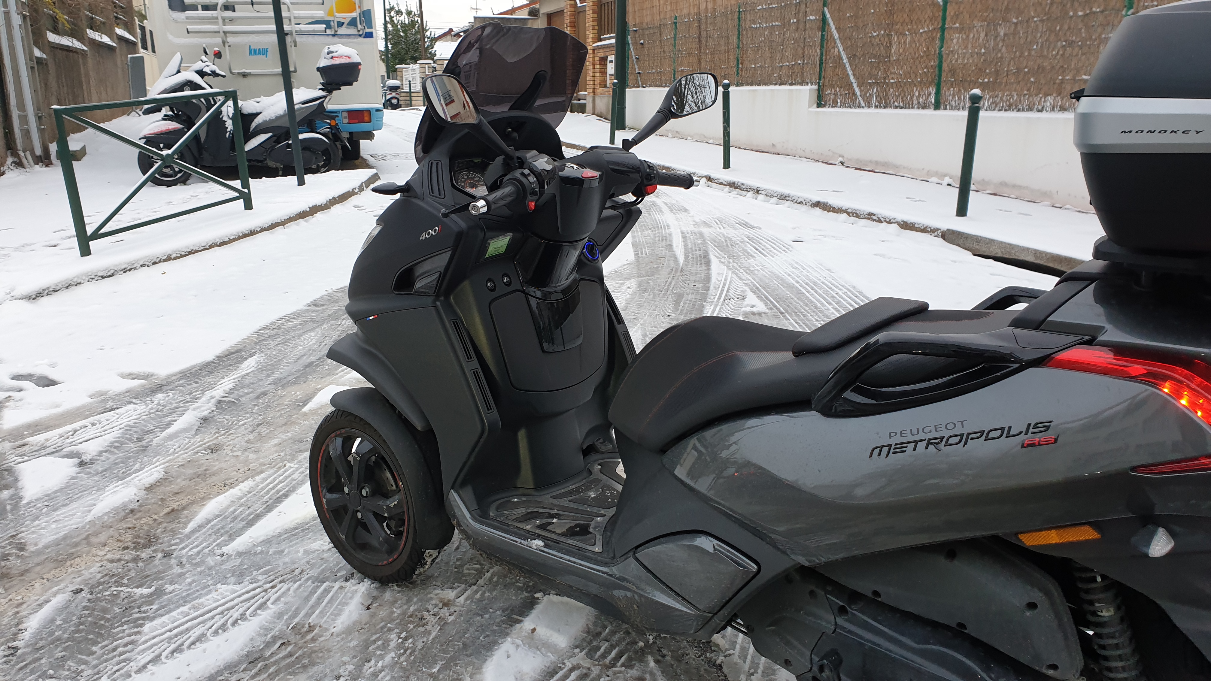 Après avoir roulé sous la neige avec la ZZR 1400, je me disais que 2 roues à l’avant serait mieux, question sécurité… et puis, pour aller rouler dans Paris, un scoot c’est quand même pratique : ça ne chauffe pas, on n’a pas peur de se le faire piquer (vu qu’on n’y tient pas plus que ça) et ça permet de loger les casques dedans quand on va au concert (du temps où il y en avait encore !! 😛 )…