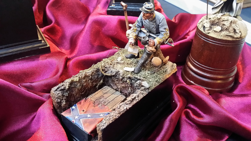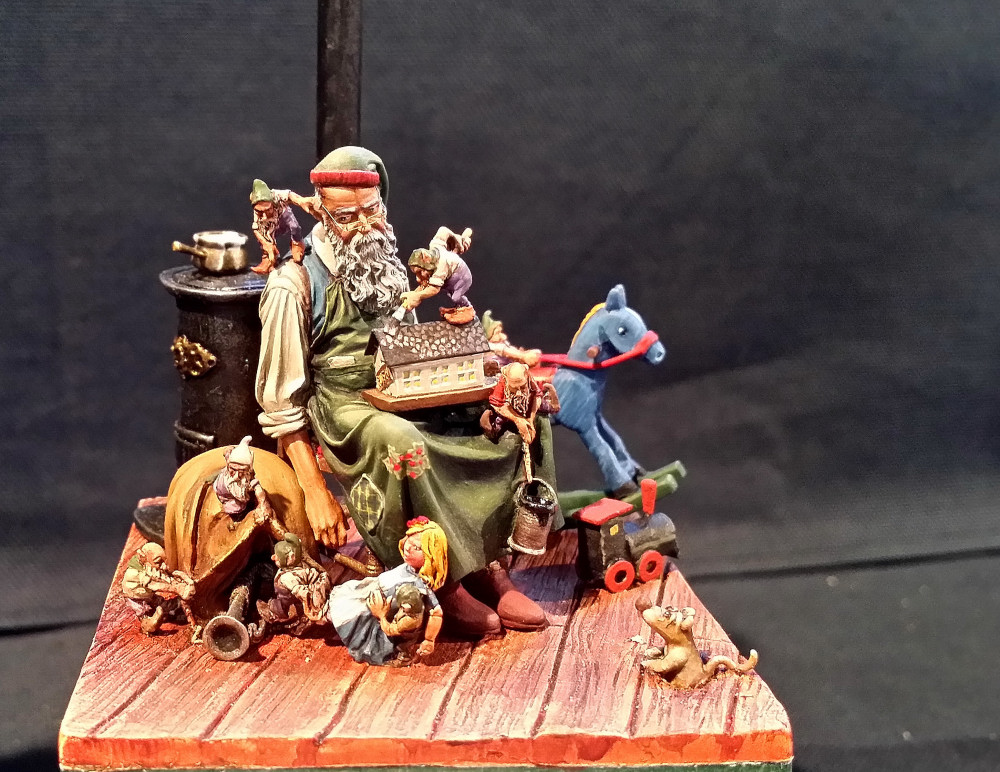 Et au mieux que j’ai réussi, après avoir tenté d’affiner mes glacis – en vain ! C’est facile quand on voit les vidéos Youtube, mais en vrai, c’est soit trop épais, soit ça fait de la flotte, et la peinture fait de la « craie » en séchant, c’est grumeleux. Ce que ça fait sur ma figurine…