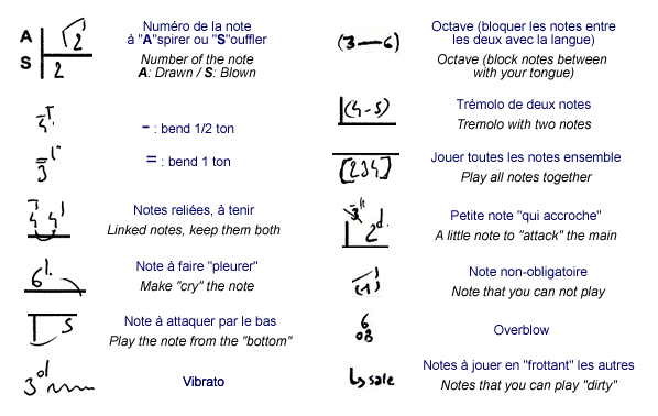 On pourrait encore écrire beaucoup pour expliquer comment on note un « glissé », le fait que l’on fasse baisser une note comme si elle pleurait ou les nombreuses « articulations » (quand on prononce des sons en jouant, pour modifier le son, comme « OU », « T », « KA » ou « FFF »), sans parler des trémolos, vibrato, whawha, avec la gorge, les mains, les notes « sales » (que l’on joue exprès sur plusieurs trous), etc.