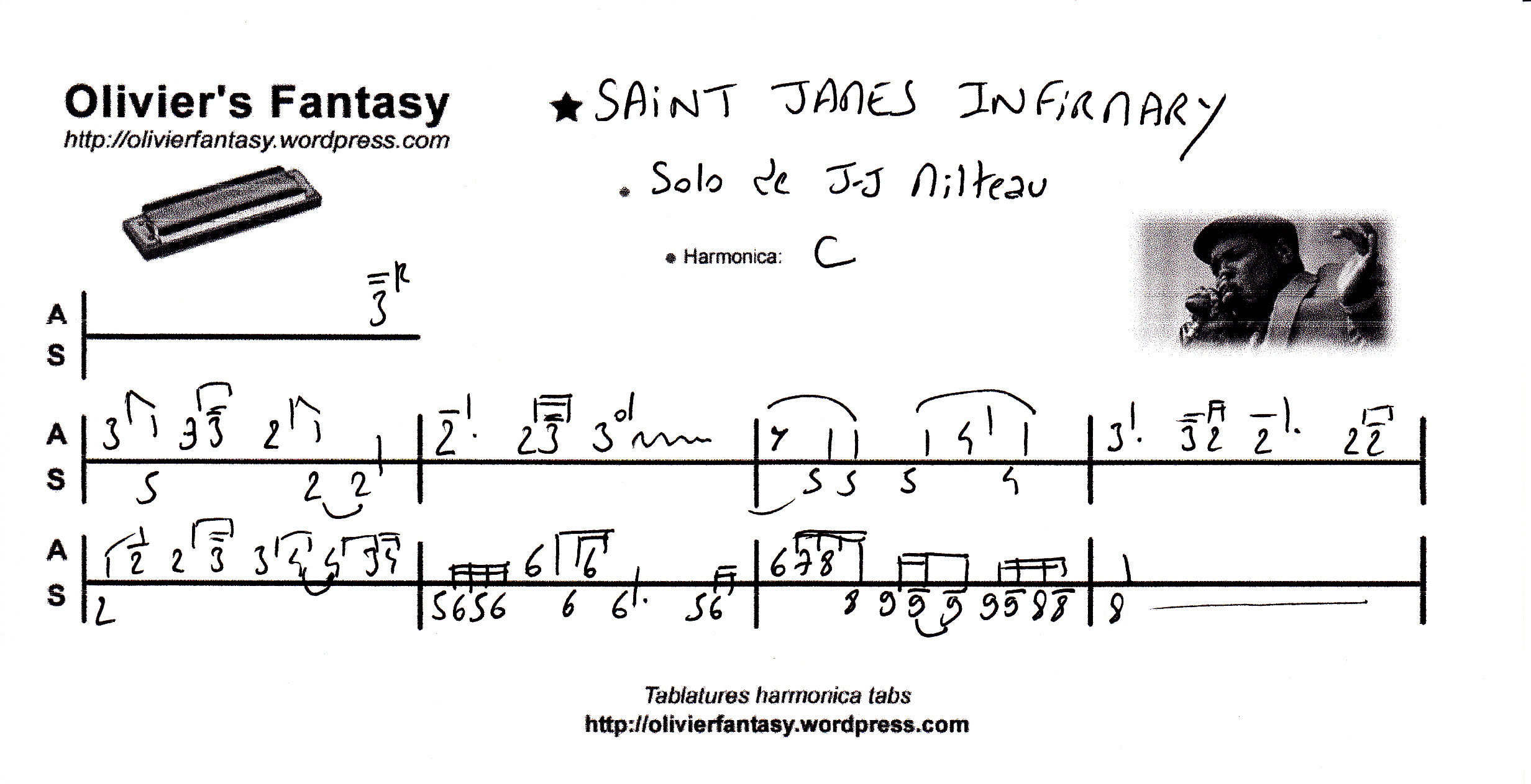 Dernier solo de la méthode « 10 thèmes de blues » de Jean-Jacques Milteau, voici la tablature (partition) pour harmonica pour « Saint James Infirmary »…