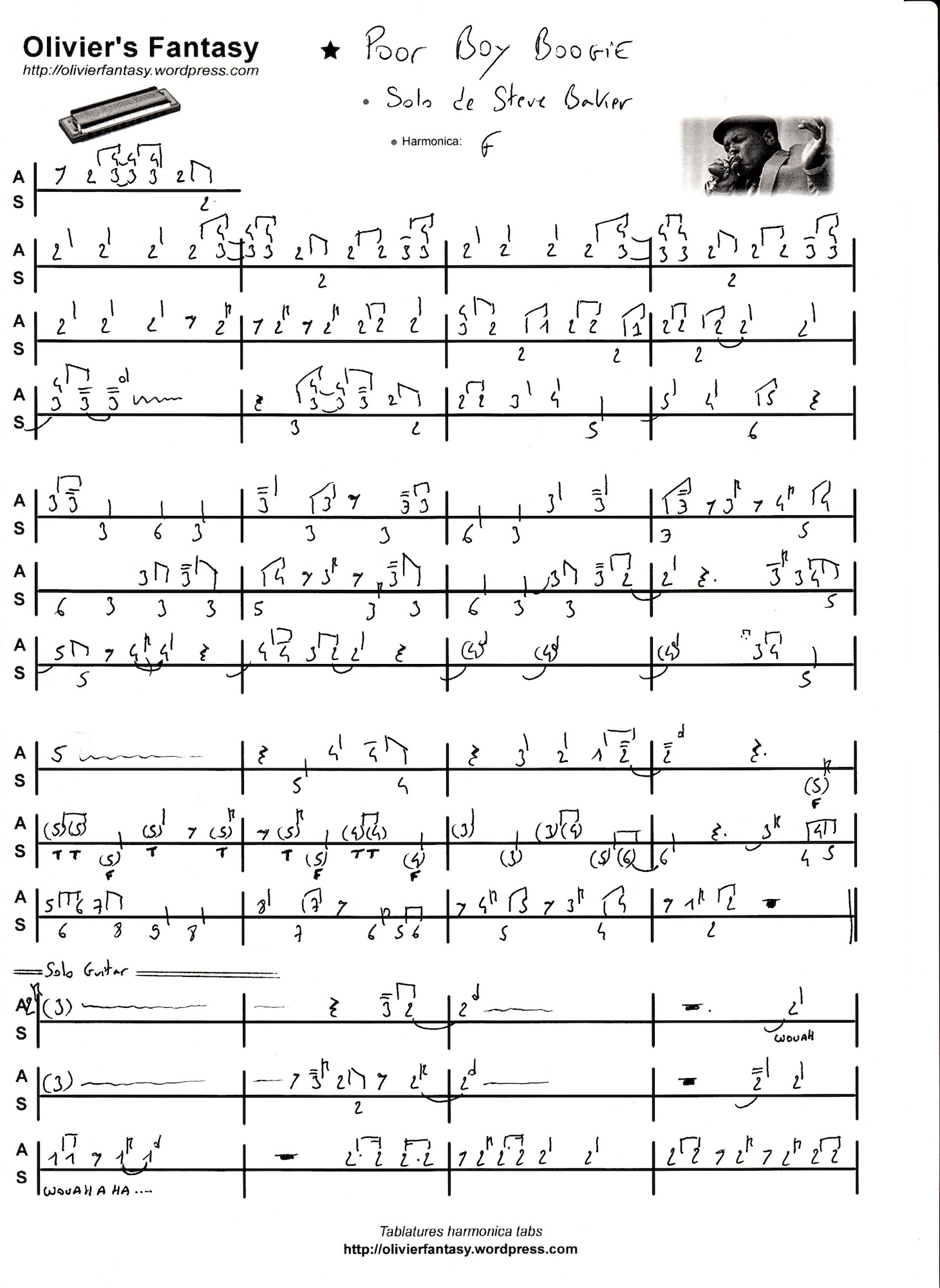 Here’s the tablature for harmonica of different Steve Baker’s solo on « Poor Boy Boogie » in its method « Blues Harmonica Playalongs Vol.1« … The transcript is « home made ».