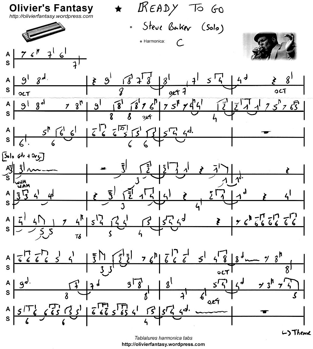 Voici la tablature (partition) pour harmonica des parties solo de Steve Baker sur « Ready To Go », dans sa méthode « Blues Harmonica Playalongs Vol.1« …