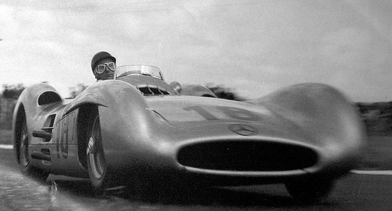 Et c’est l’arrivée !Fangio, Kling et Herrmann (les 3 pilotes Mercedes)