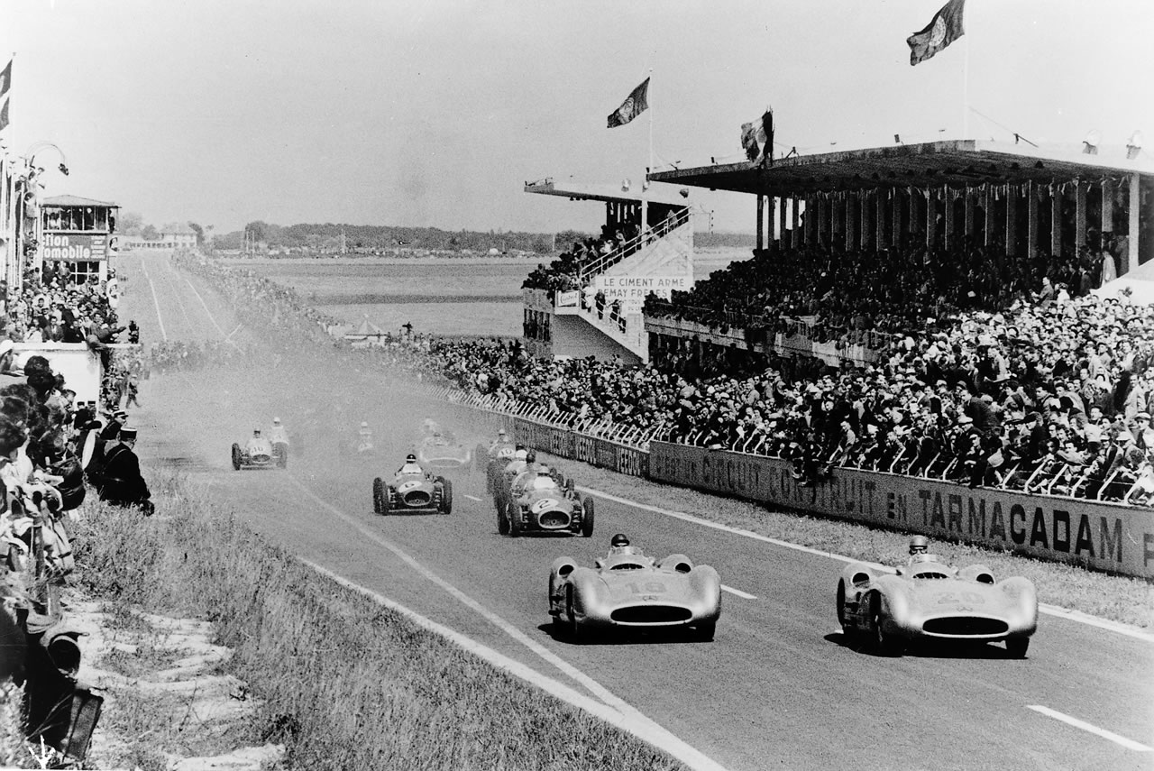 Préparation… Le départ !Fangio (#18), Kling (#20) et Ascari (#10) en pôle position.FangioKling Herrmann (qui devra abandonner)…Kling suivra Fangio jusqu’à la fin (il finira 1mn derrière lui).Alfred Neubauer surveille le chronomètre !