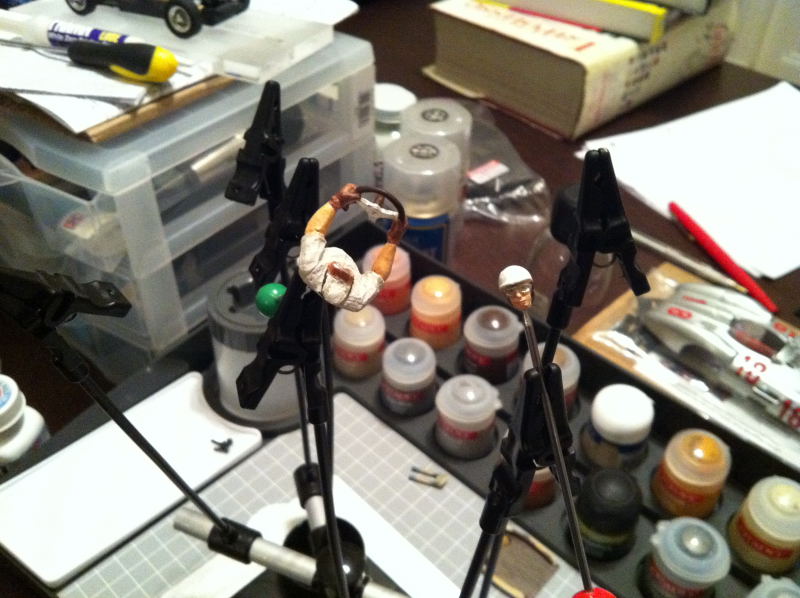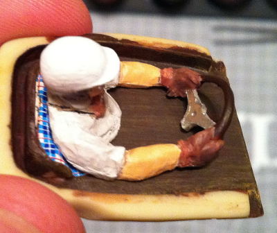 Les connaisseurs remarqueront que j’ai un peu modifié le pilote d’origine, parce que je voulais qu’il ait 2 paires de lunettes, comme Fangio en course ! Donc, récupération d’un corps, déboitage de tête, pliage de bras (au sèche-cheveux) pour que le volant soit à sa place, peinture et réassemblage… Voilà le résultat (en gros plan, c’est terrible, mais en vrai ça passe). Le casque n’était pas fini de peindre, et il manque encore le lavis… Au final le pilote est moins pâle !