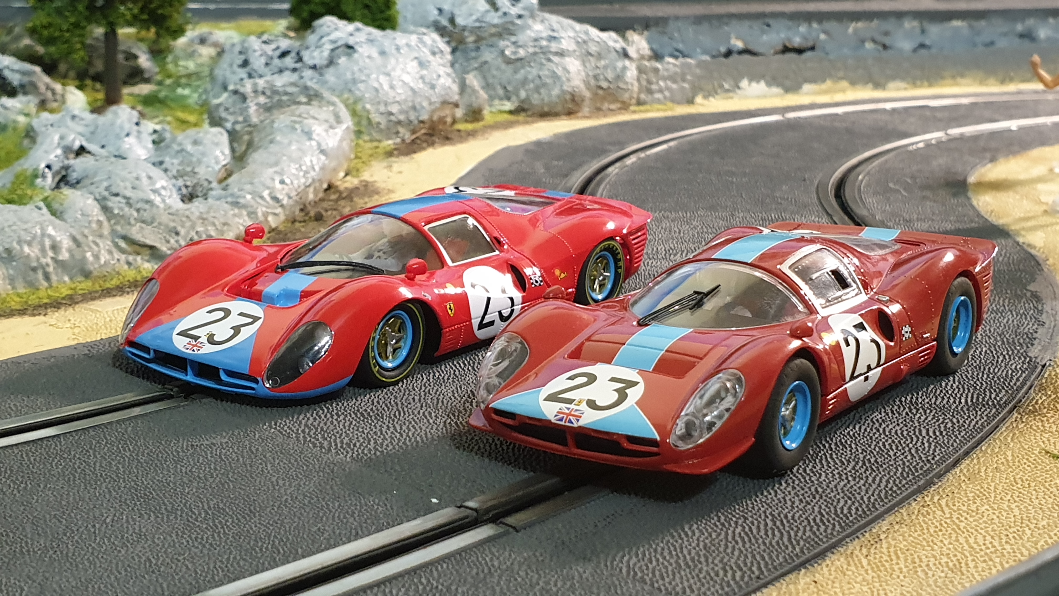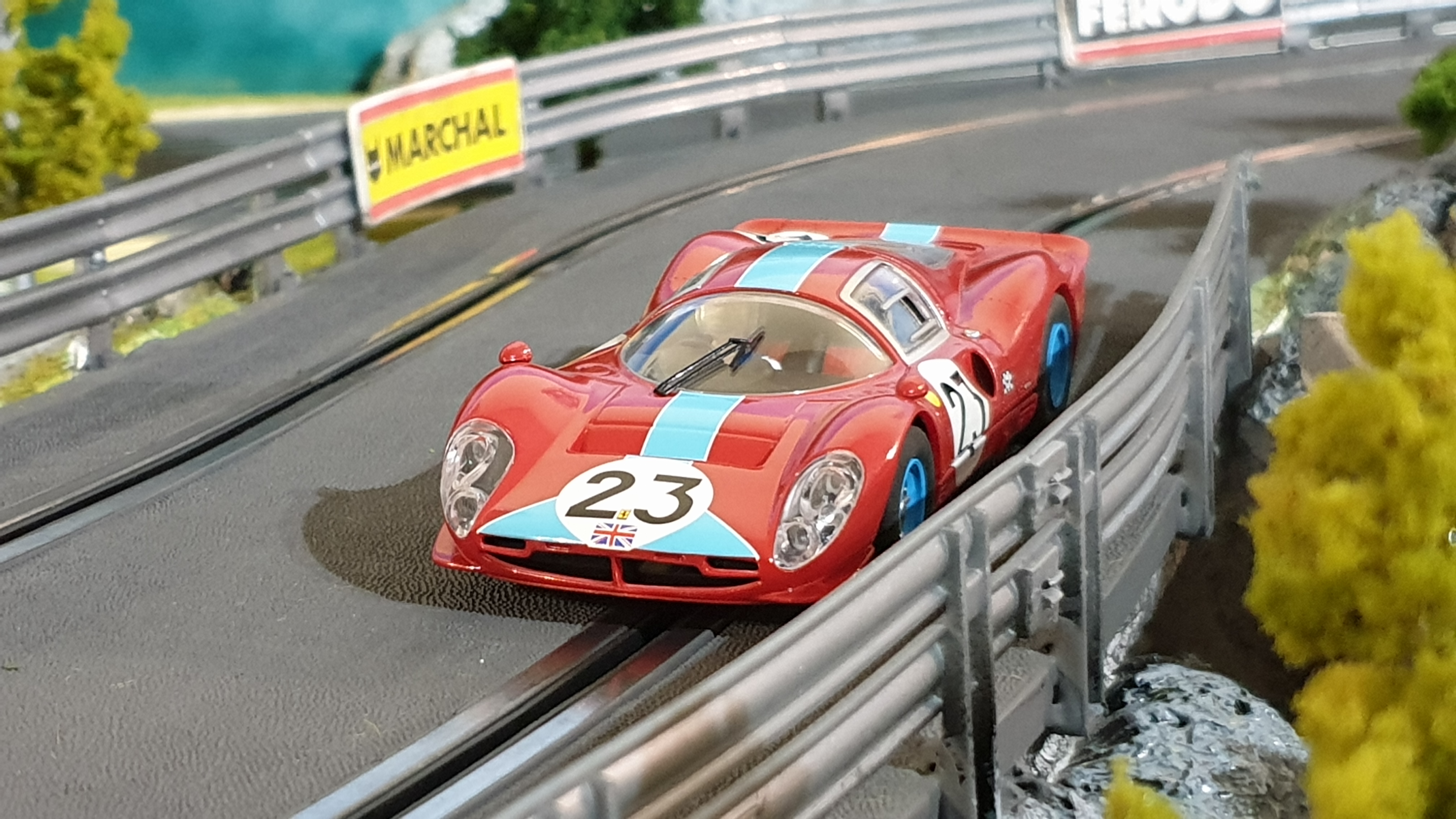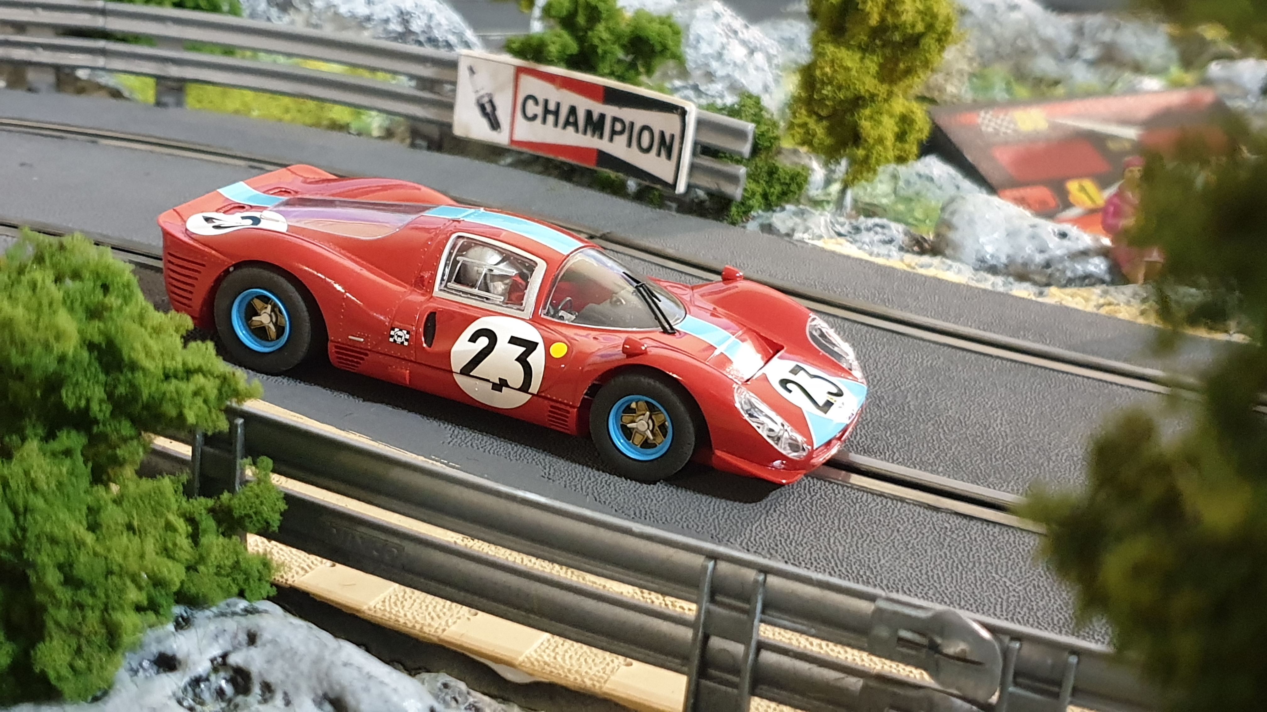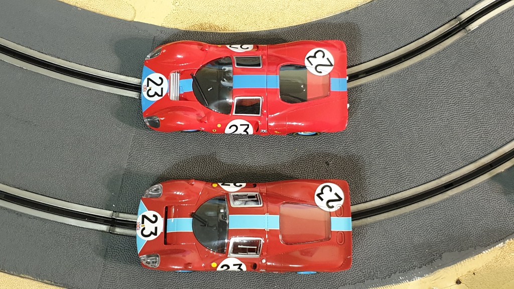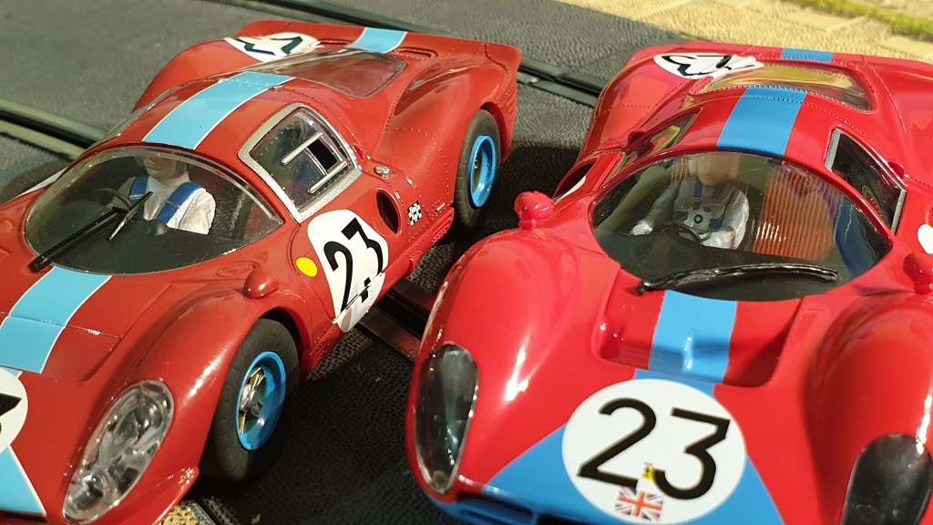 La version Scalextric de la Ferrari 412P 1967 #23 était très difficile (et chère !) à trouver… J’avais fini par en acheter une sur eBay, mais elle n’avait pas de châssis… J’en avais trouvé un, séparément, mais pas avec le numéro 23. Bref, mon bricolage donnait ça :