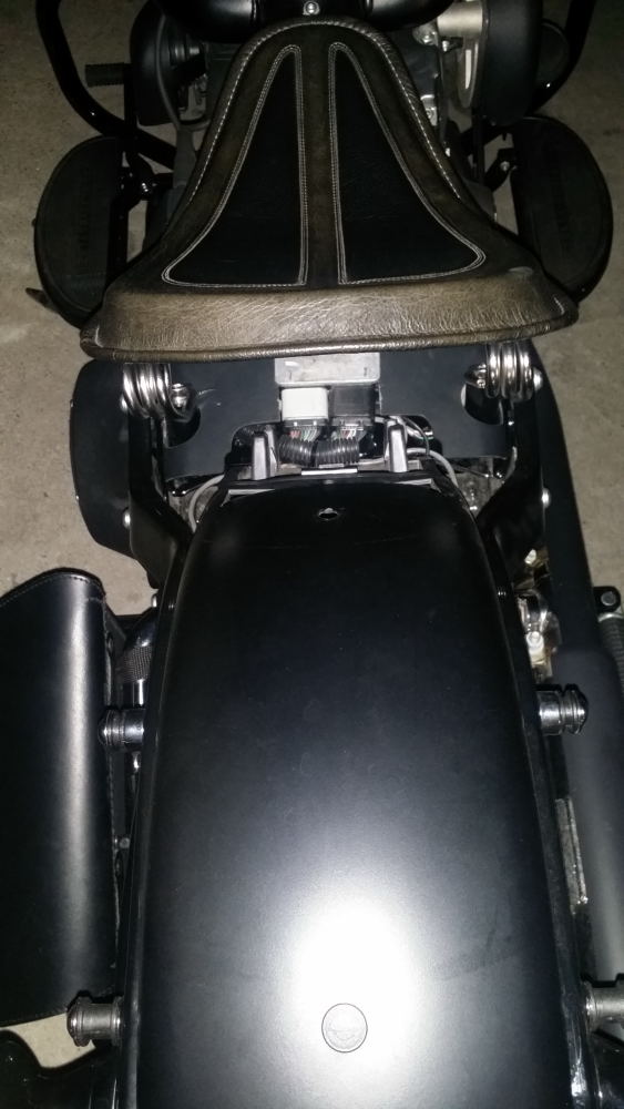 Harley-Softail-Slim-selle-ressort-inverseeD’abord, bonne nouvelle, les dimensions correspondent, donc on peut remonter la selle, et cela rabaisse bien l’avant en remontant l’arrière. L’effet souhaité est obtenu.