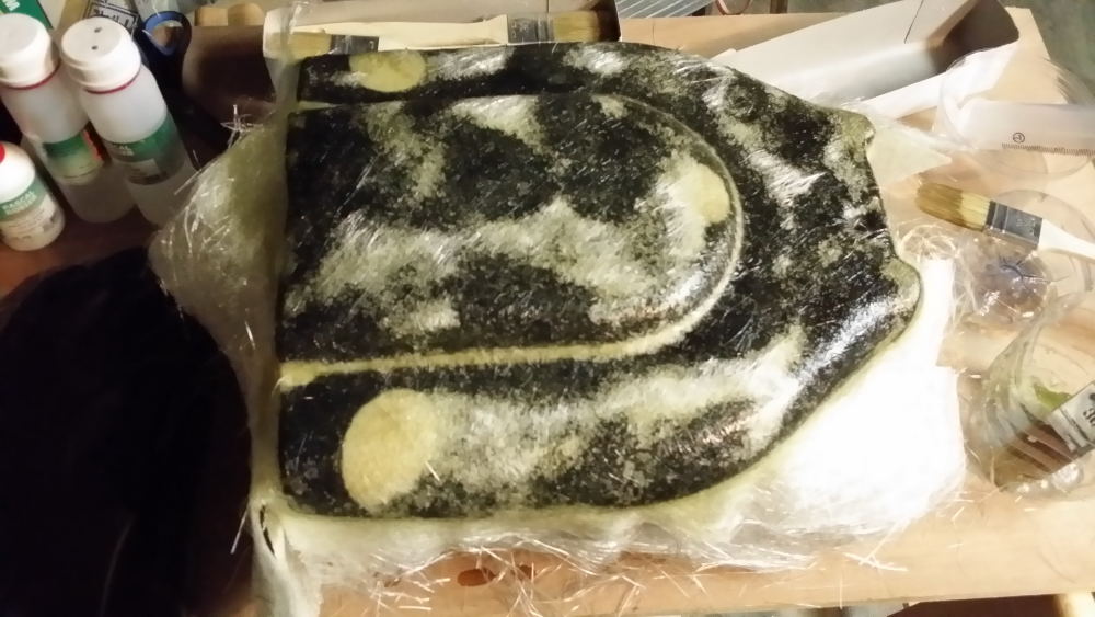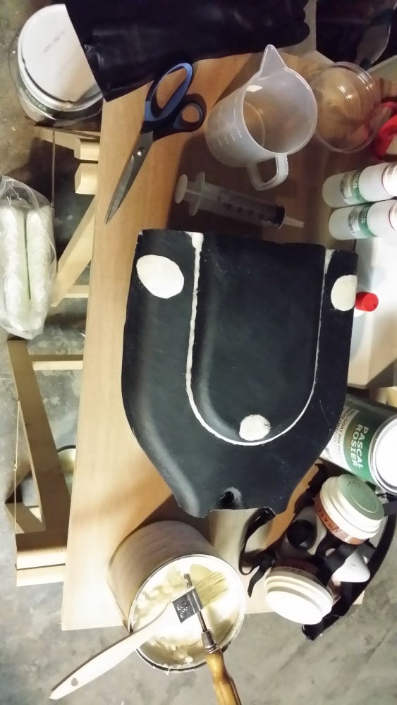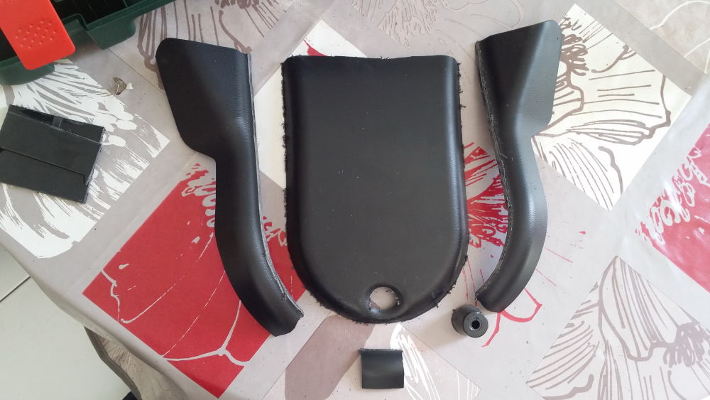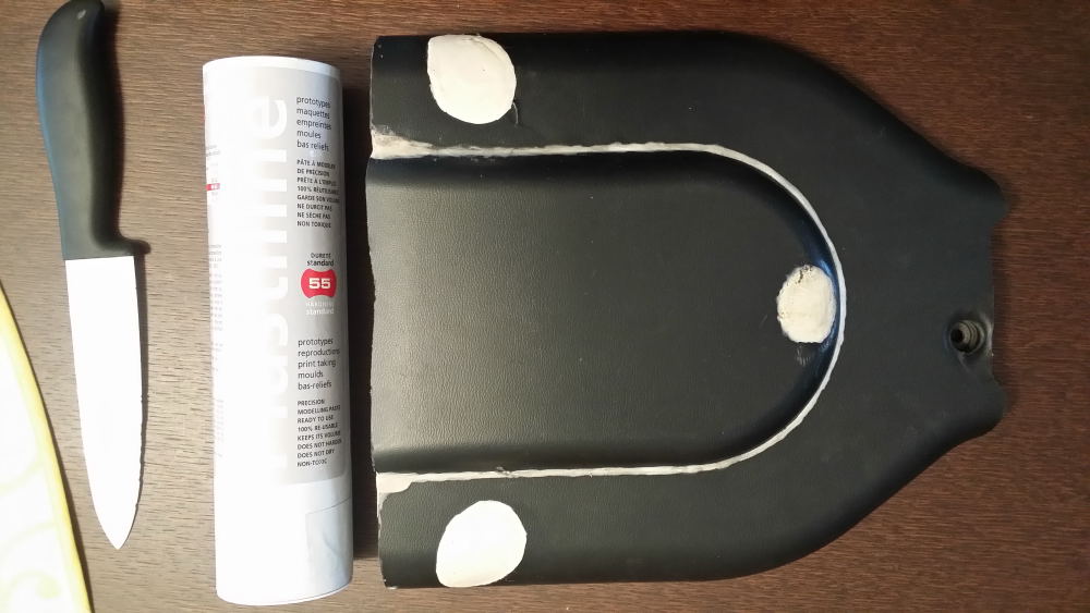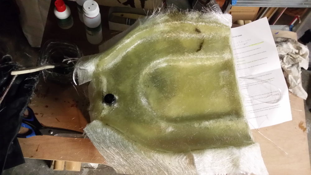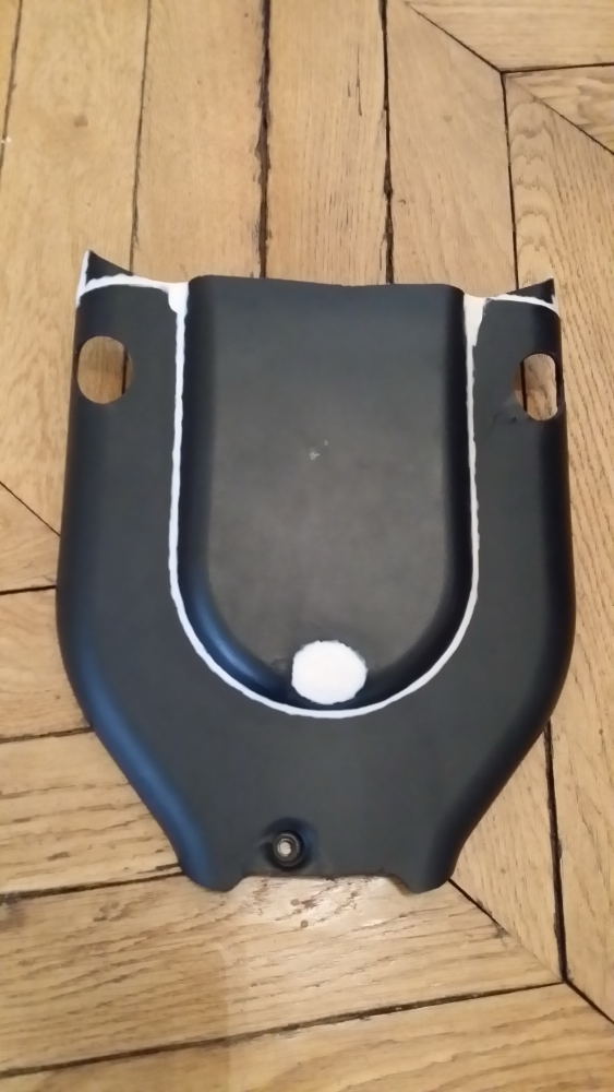 2014-08-09 15.19.45 Vérification en place :2014-08-31 13.41.46 2014-09-04 22.15.23 C’est parti pour le moulage : je comble les trous, toujours à la plastiline 2014-09-21 11.12.08 Ensuite, on graisse au démoulant2014-09-30 20.46.36 On tartine de fibre de verre et de mat2014-09-30 22.17.12 Une fois sec et démoulé (24h plus tard) :2014-10-01 22.42.48 2014-10-02 00.35.26 Taillé et mis en place2014-10-02 23.22.30 Et tout juste peint (je sais, j’aurais pu atteindre que ce soit sec 🙂 )…2014-10-02 23.40.32 2014-10-02 23.40.55 Avec la selle :2014-10-02 23.45.08 That’s it ! Je peux affronter la pluie ! 🙂