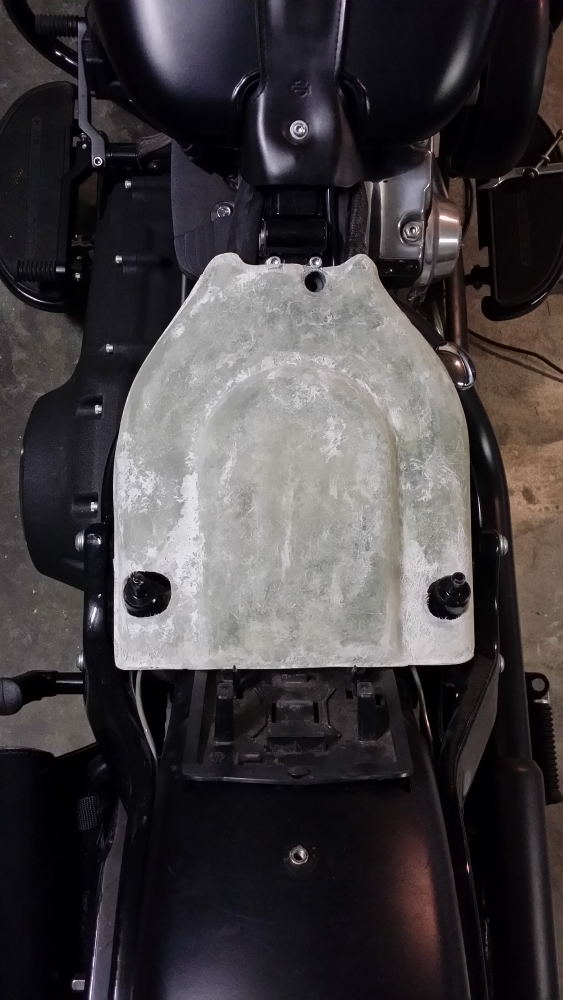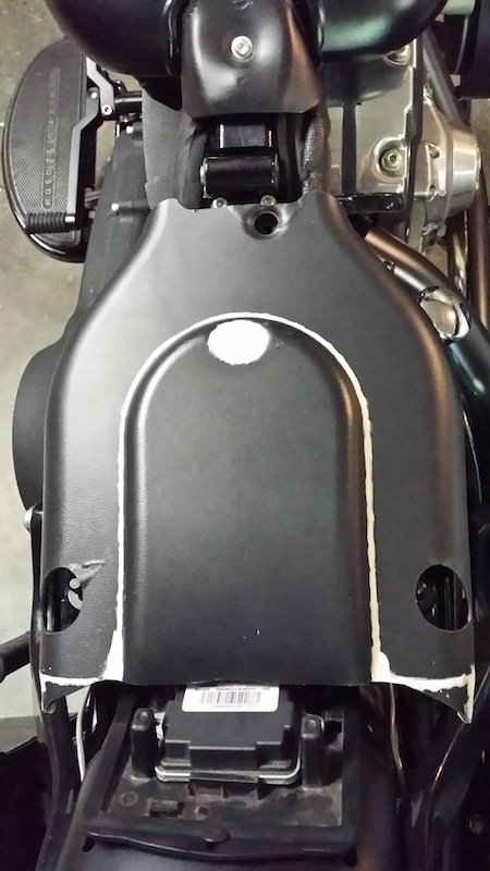 2014-07-13 19.59.58 Donc, on prend un cache-batterie Harley, et on taille dans la masse2014-07-13 20.13.56 Voilà ce que cela donne (vous voyez côté garde-boue la pièce plastique qui tenait l’ECM en place dans le trou du garde-boue).2014-07-13 20.17.59 Avec la selle en place (sans la pièce plastique de l’ECM sur le garde-boue). C’est impeccable !2014-07-15 19.20.26 Mais on ne peut pas laisser l’ECM exposé à la pluie, donc voici la taille d’un capotage destiné à le protéger. On prend un second cache-batterie et on découpe :2014-07-30 12.08.28 Voici les morceaux posés sur le premier cache-batterie :2014-08-04 17.21.14Une fois collé, je comble les trous à la plastiline :