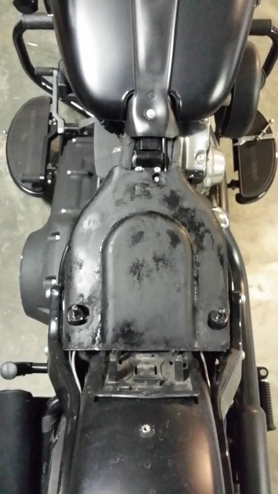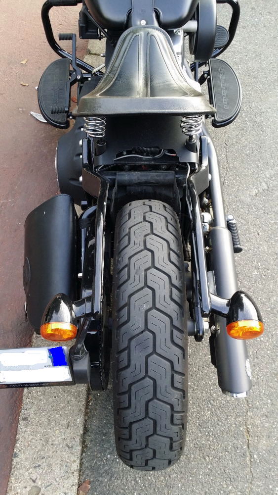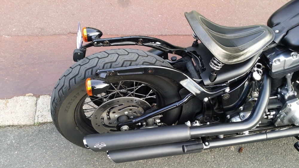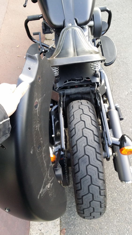 Astuce / Tips : le sissy-bar est un modèle que l’on peut retirer en 1 clic. Normalement, d’après Harley, il faudrait retirer les clignotants et monter le kit pour les repositionner plus en arrière (ce qui serait très moche !)… En fait, c’est inutile : il suffit de scier proprement l’arrondi de la petite patte de fermeture du sissy-bar. Et ça passe très bien ! 🙂