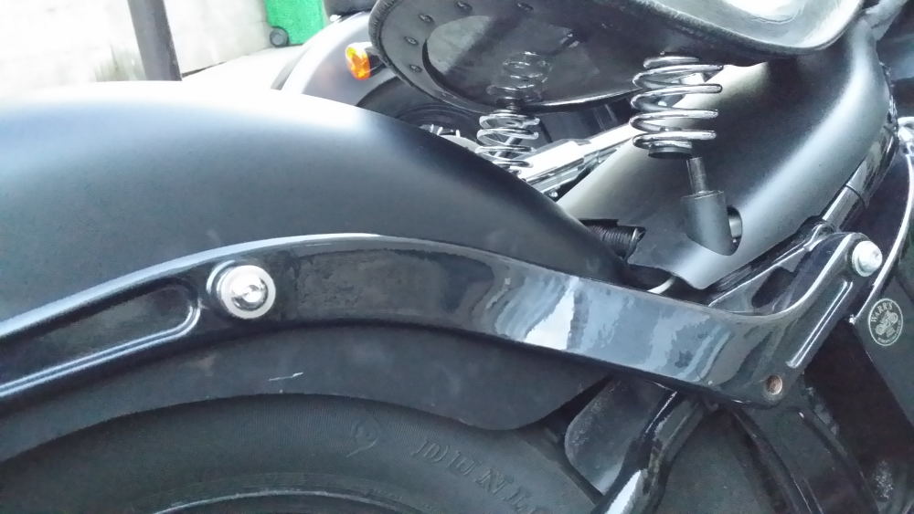 The solution would be to mount original springs (3cm, Harley are almost 5cm)… and to remove the ECM (put it under the seat) to have a « normal » mudguard.