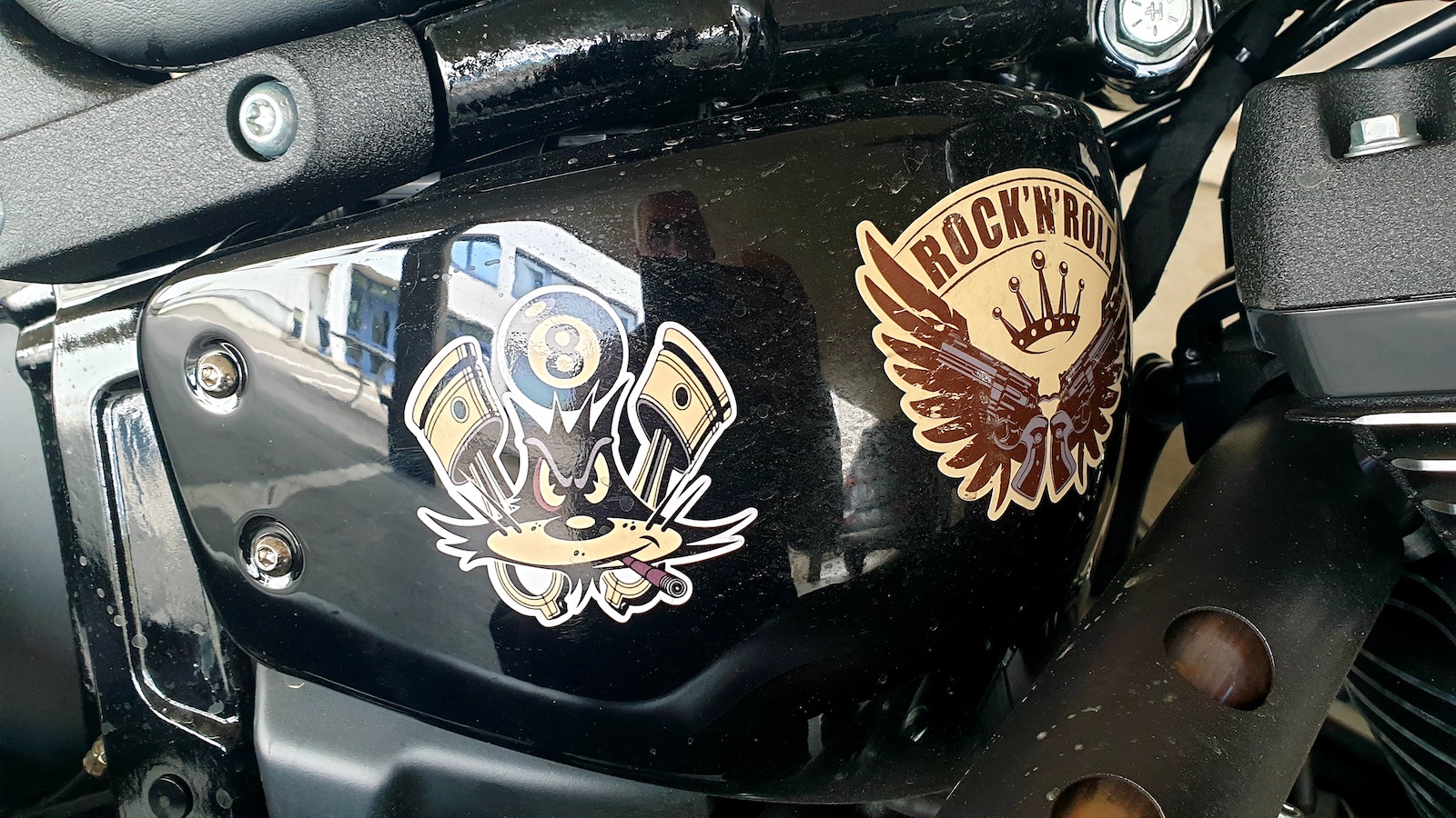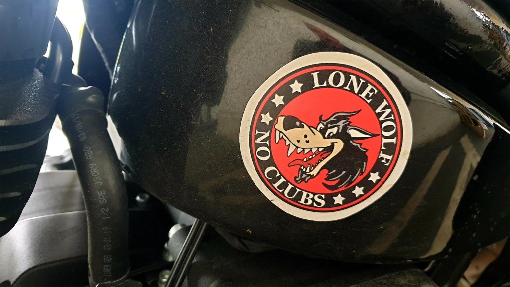 Un peu de personnalisation, aussi, comme j’avais fait sur mon ancien Slim 2013, pour renforcer le côté « Loup solitaire » (les riders qui roulent souvent seuls) et Rock n’roll 🙂