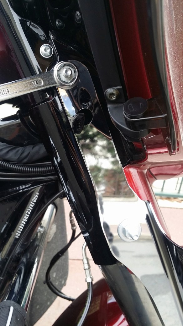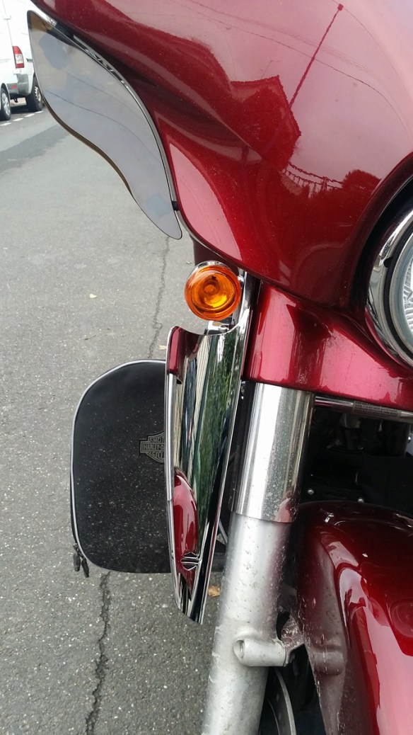 Ensuite, pour compléter, j’ai installé des déflecteurs de fourche (Harley d’origine, ceux-là) : ça vire le vent qui reste au niveau des genoux.