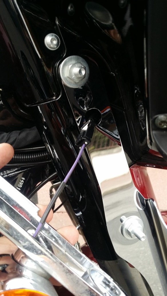Ensuite, on déclipse l’alimentation des clignos (en passant l’ongle entre les deux parties, ça vient tout seul : j’ai cherché un bon moment l’astuce !!), on passe le câble par le trou du déflecteur, et on visse le déflecteur avec l’écrou double :
