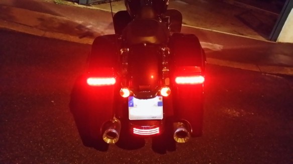 Alors, voici déjà le feu tri-bande (une marque italienne, car il parait que ce n’est pas légal en Europe ?! donc Harley ne le vend pas, alors qu’il est dispo aux USA) et les feux de sacoches (Harley mais en bidouillant, car on ne peut pas non plus les avoir en Europe, alors qu’ils sont au catalogue !)…
