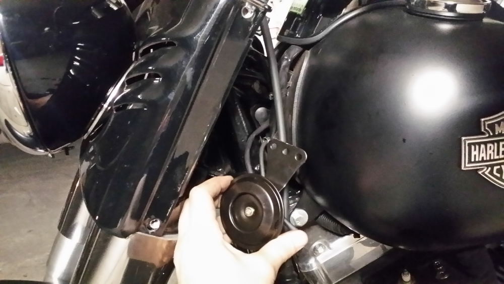 D’abord, démonter et déplacer le klaxon (l’horrible cloche de vache !)…